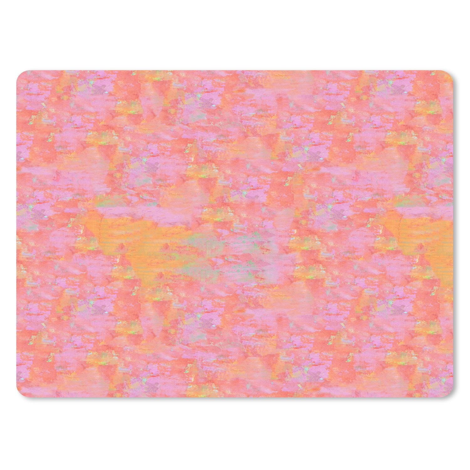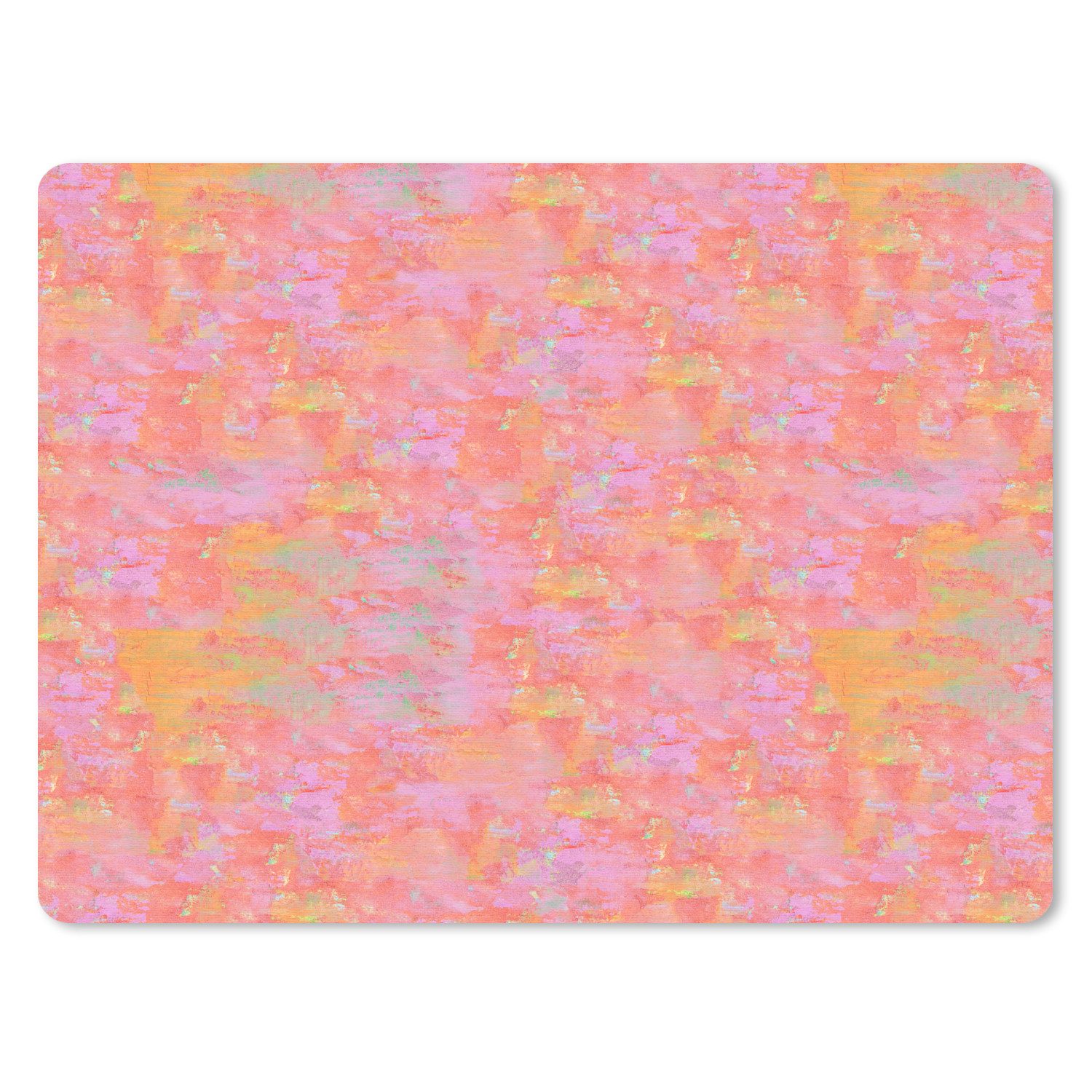 Gebeizte Komposition in Pastellrosa, Pfirsich, Flieder und zartem Minzgrün. Die Farbe ist trocken und körnig aufgetragen, wodurch eine diffuse und luftige Komposition entsteht. Die Farbflächen fließen subtil ineinander und verleihen dem Bild eine verträumte, fast aquarellartige Anmutung.