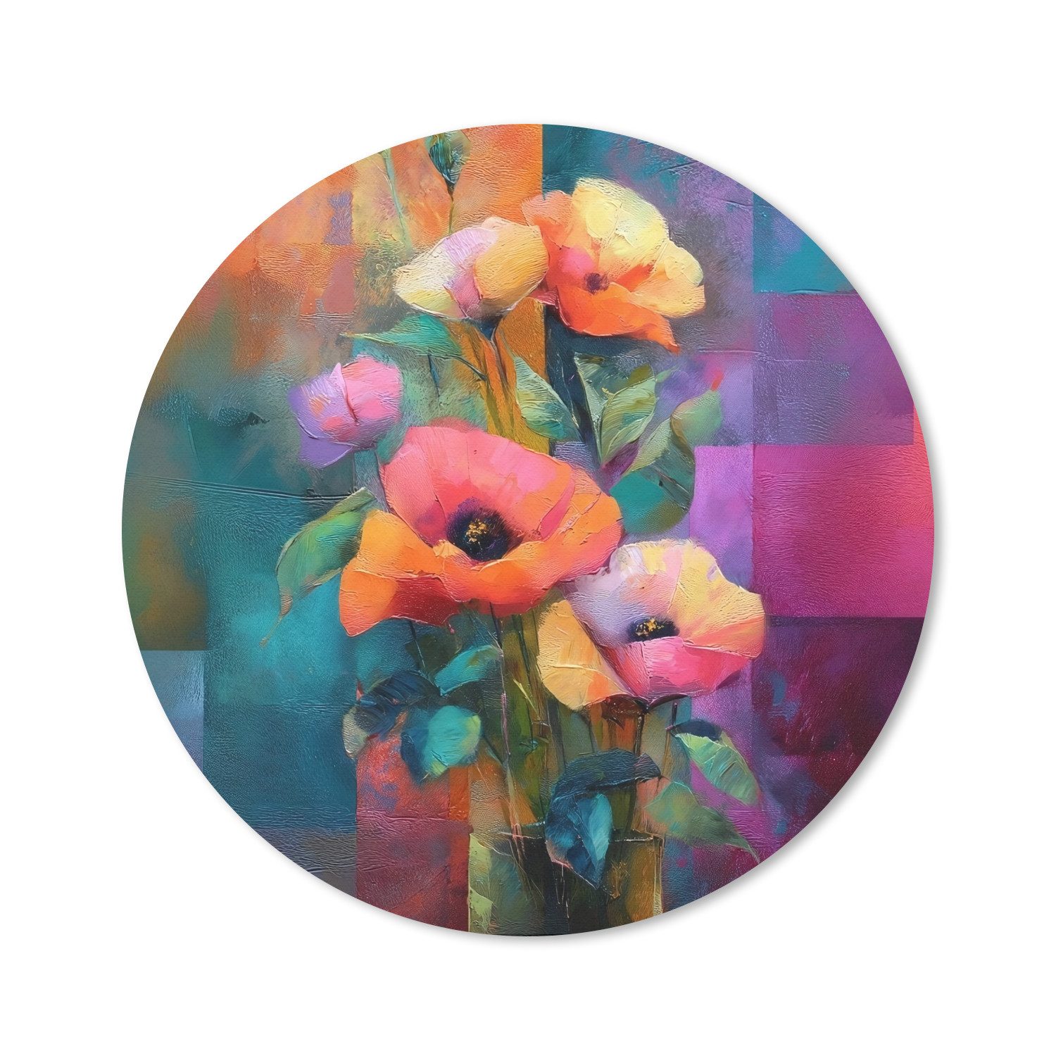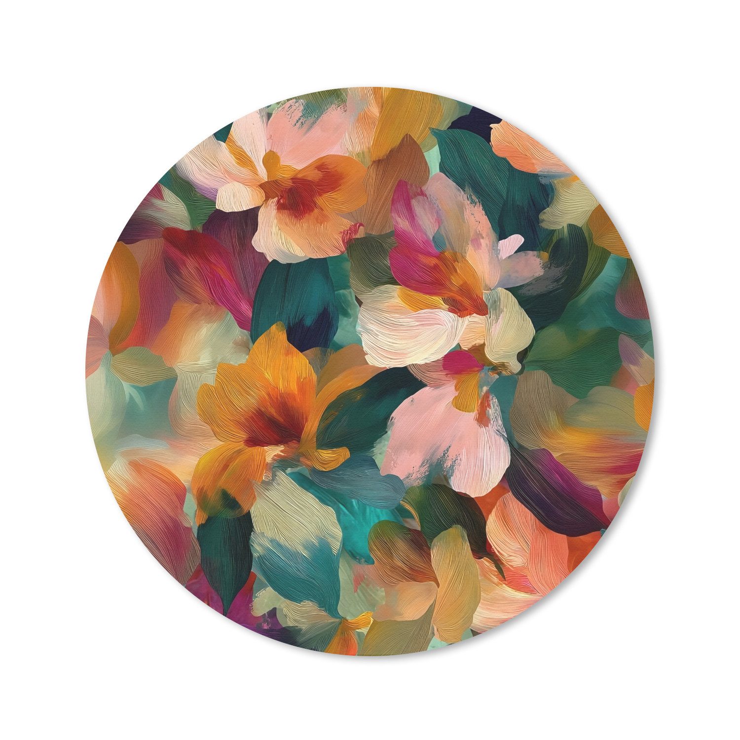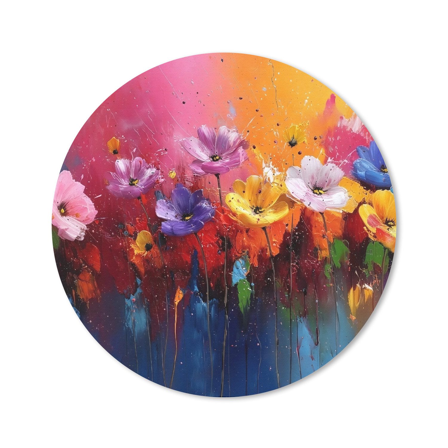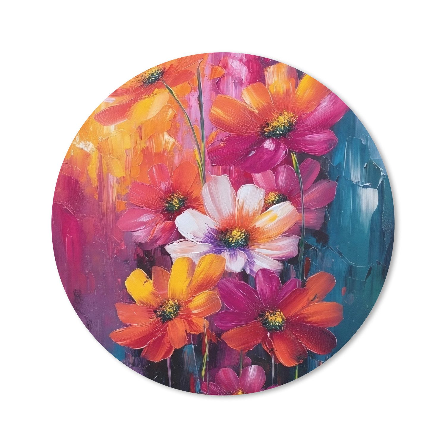 Leuchtend bunte Blumen in Orange, Rosa und Weiß ragen vor einem dynamischen Hintergrund in Lila, Blau und Orange auf. Die Pinselführung ist grob und lebendig.