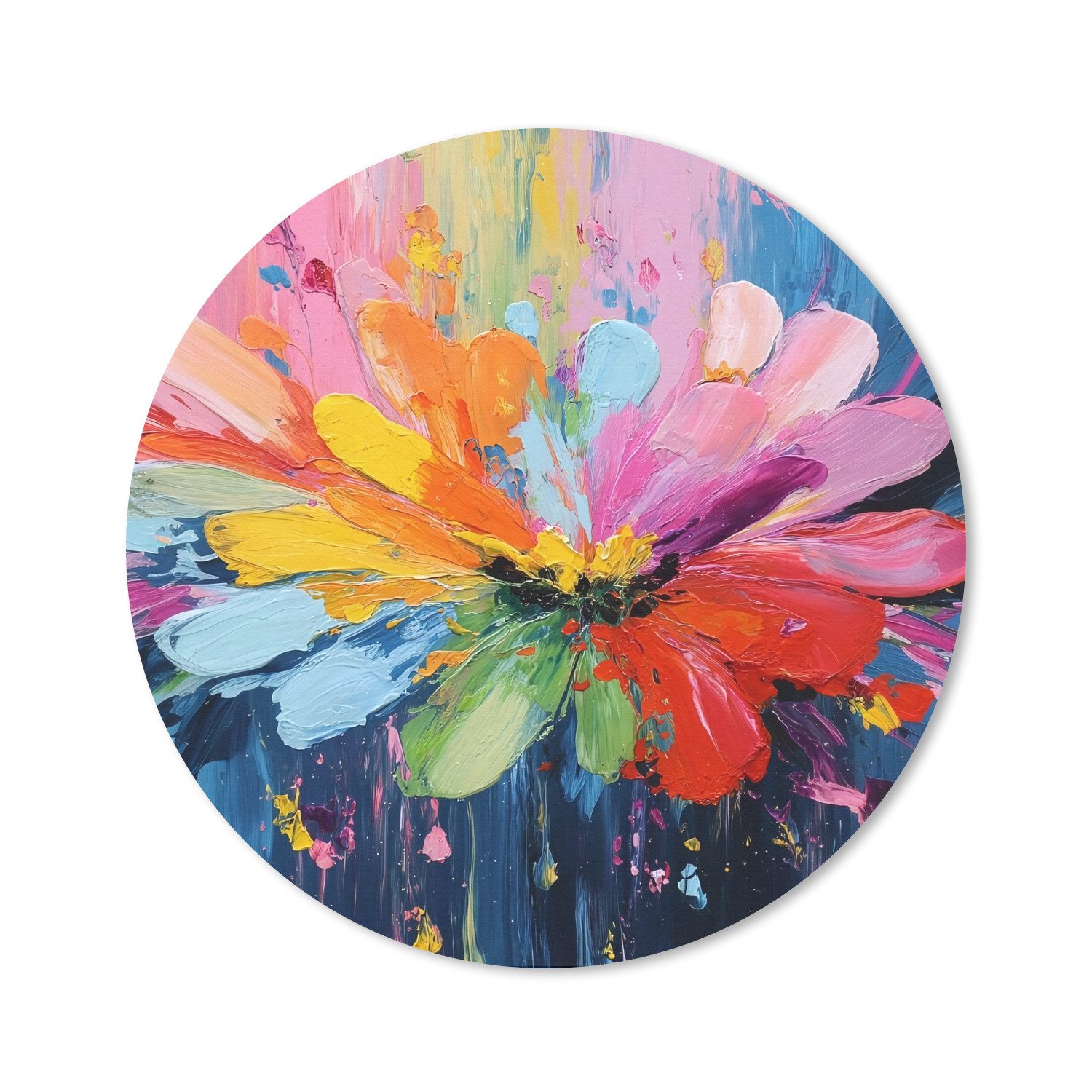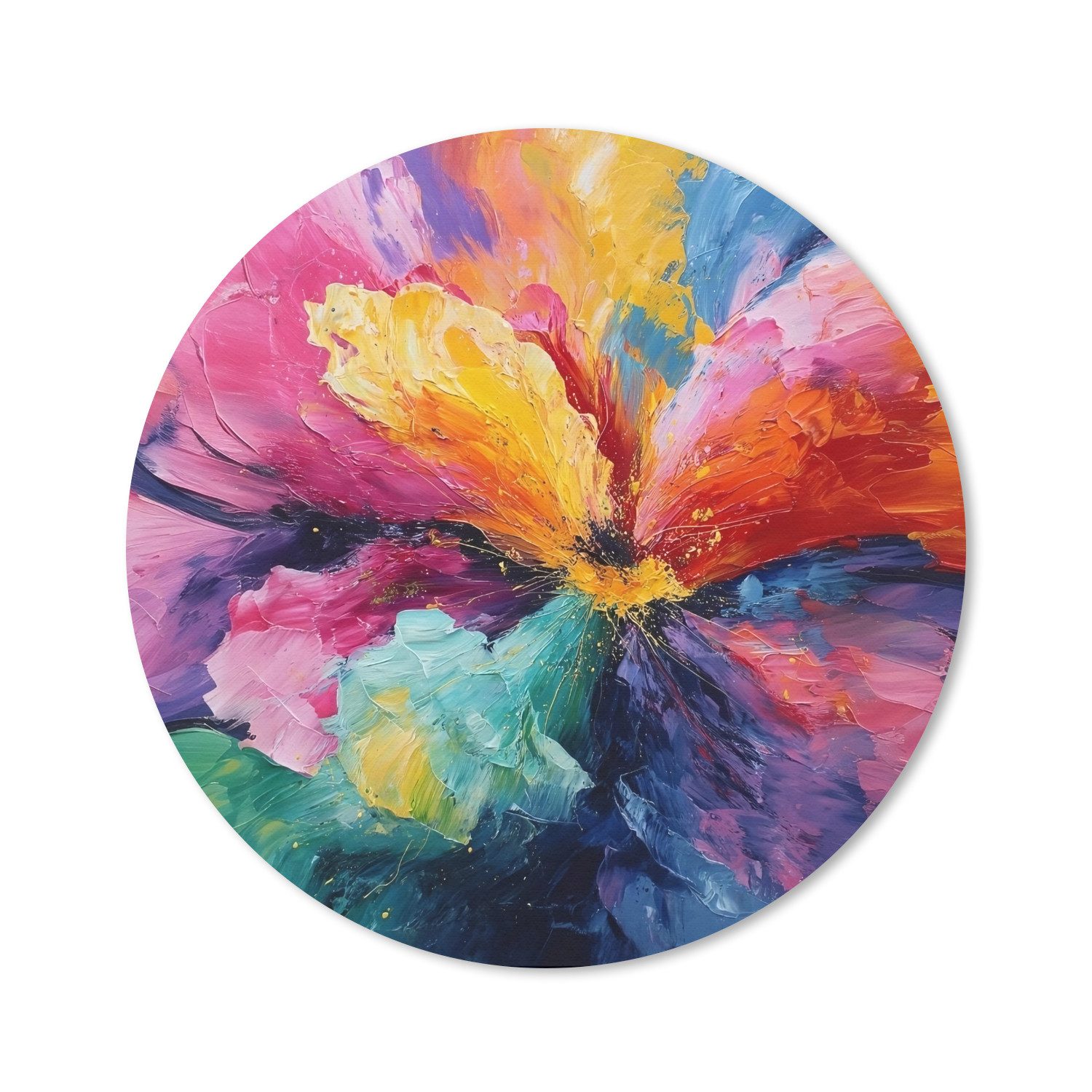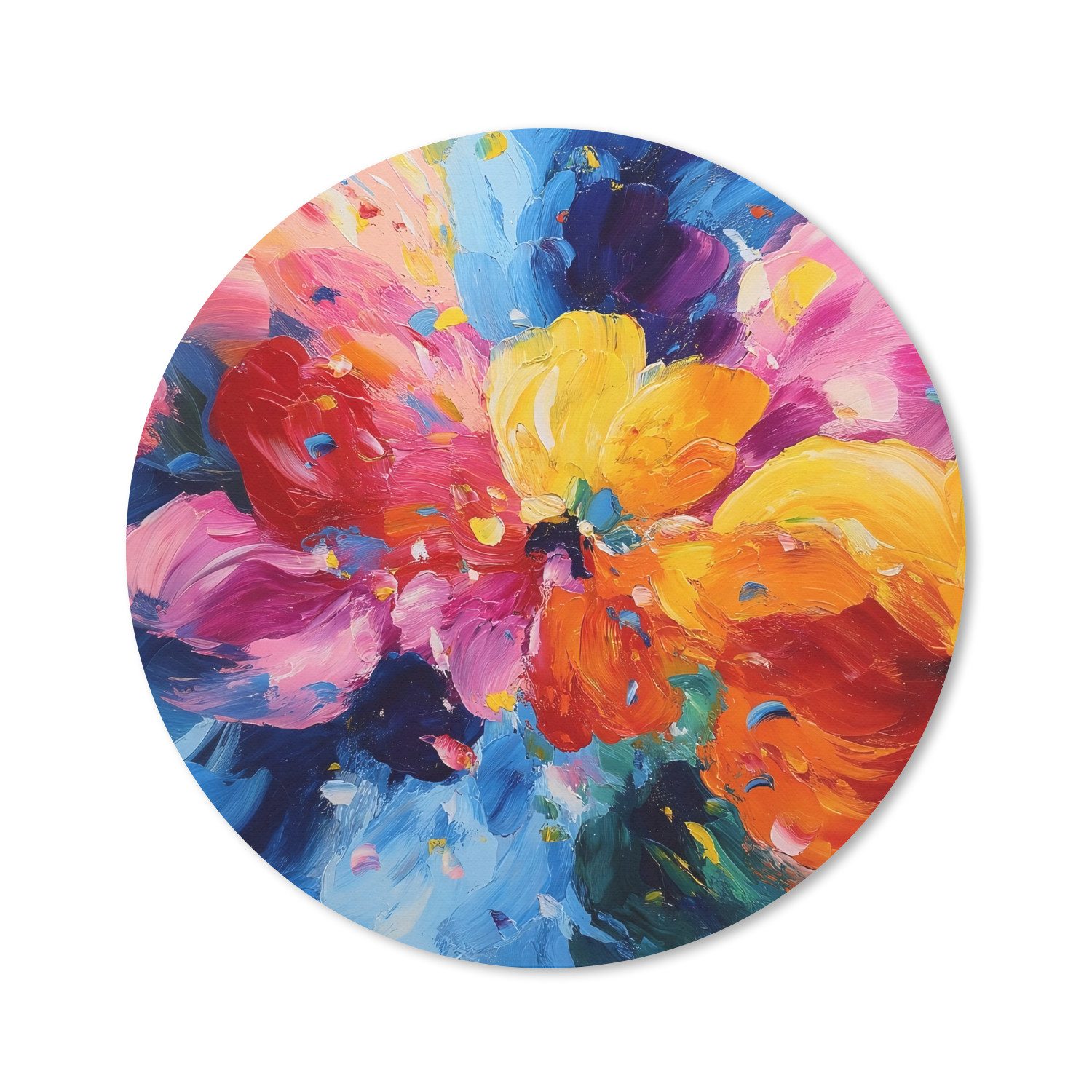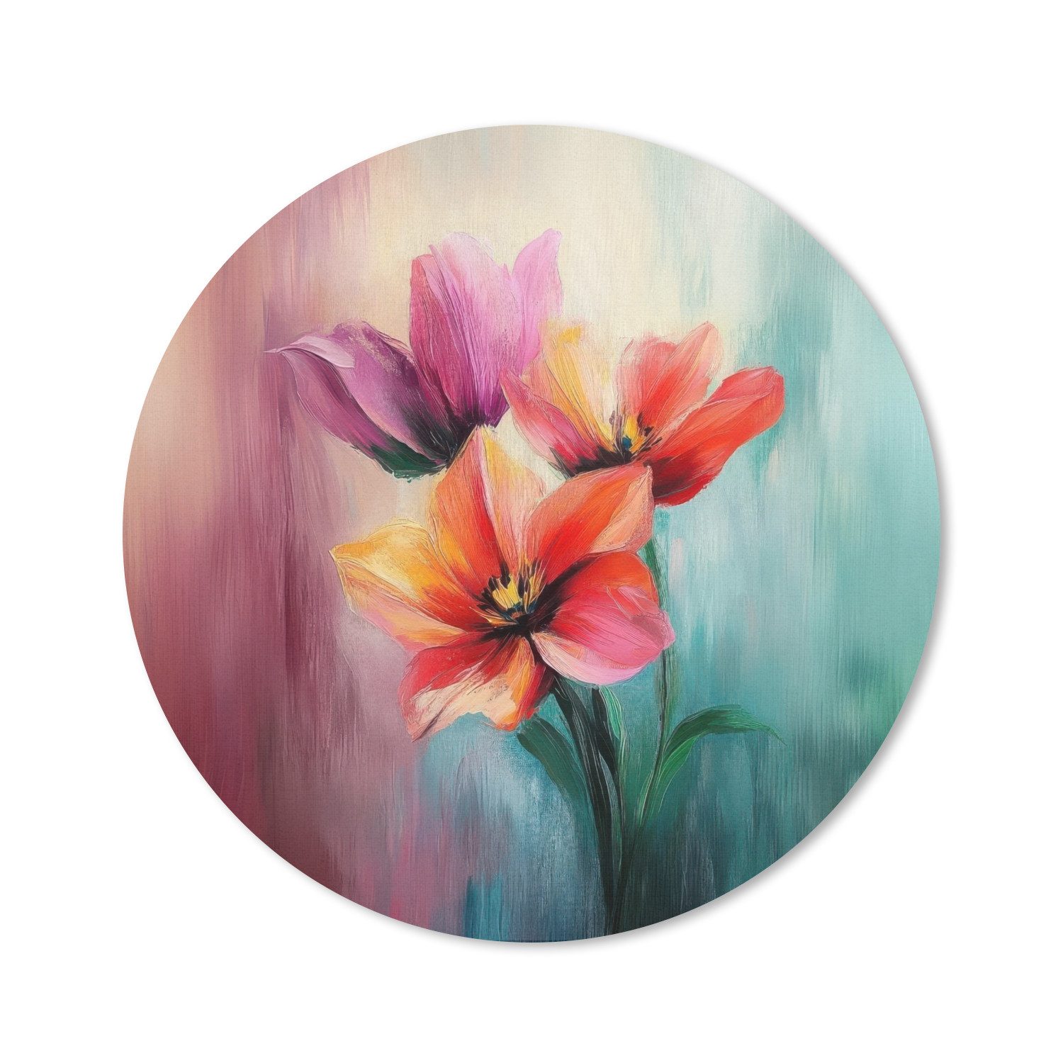 Leuchtend bunte Blumen in Orange, Rosa und Weiß ragen vor einem dynamischen Hintergrund in Lila, Blau und Orange auf. Die Pinselführung ist grob und lebendig.