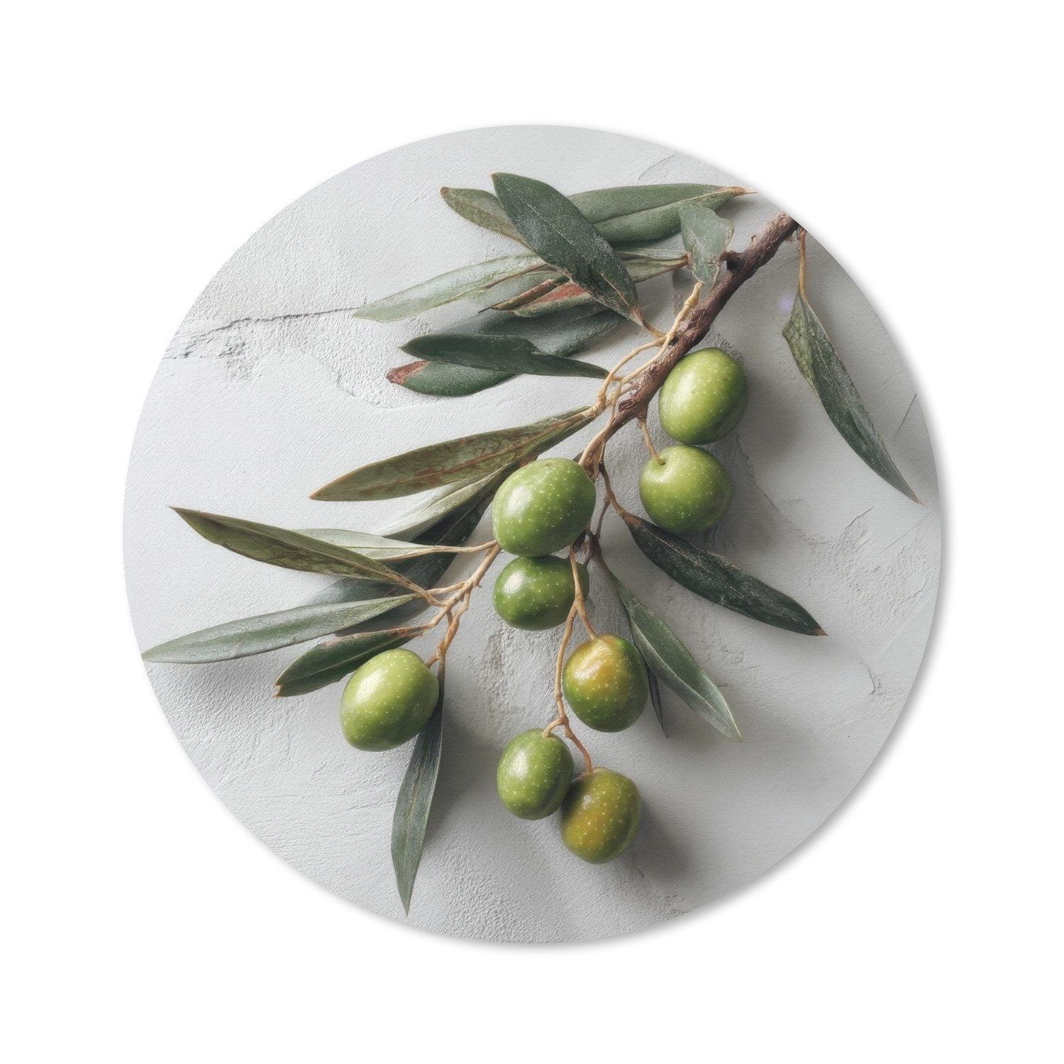 Ein Zweig mit grünen Oliven und graugrünen Blättern liegt auf einem weichen Betonhintergrund. Die Atmosphäre ist mediterran und stilvoll minimalistisch.