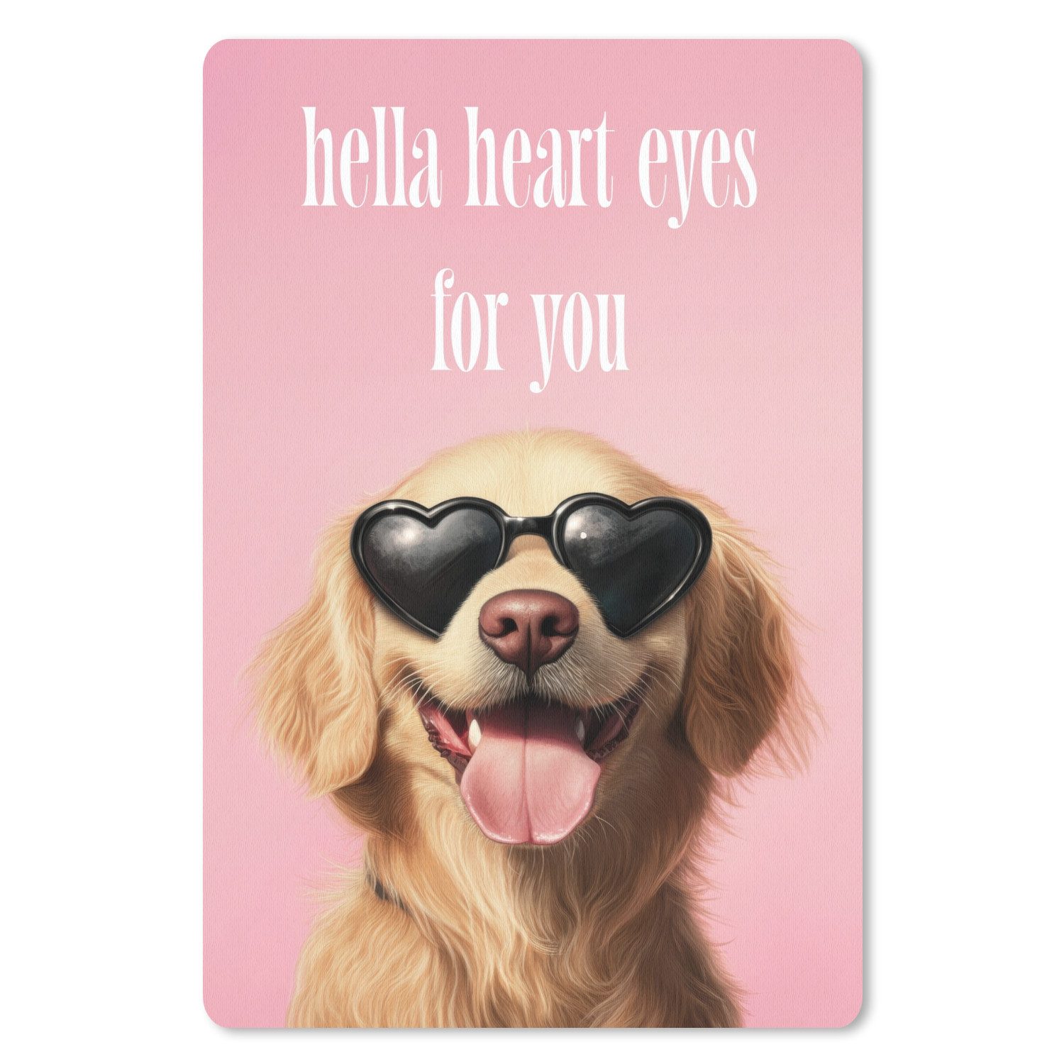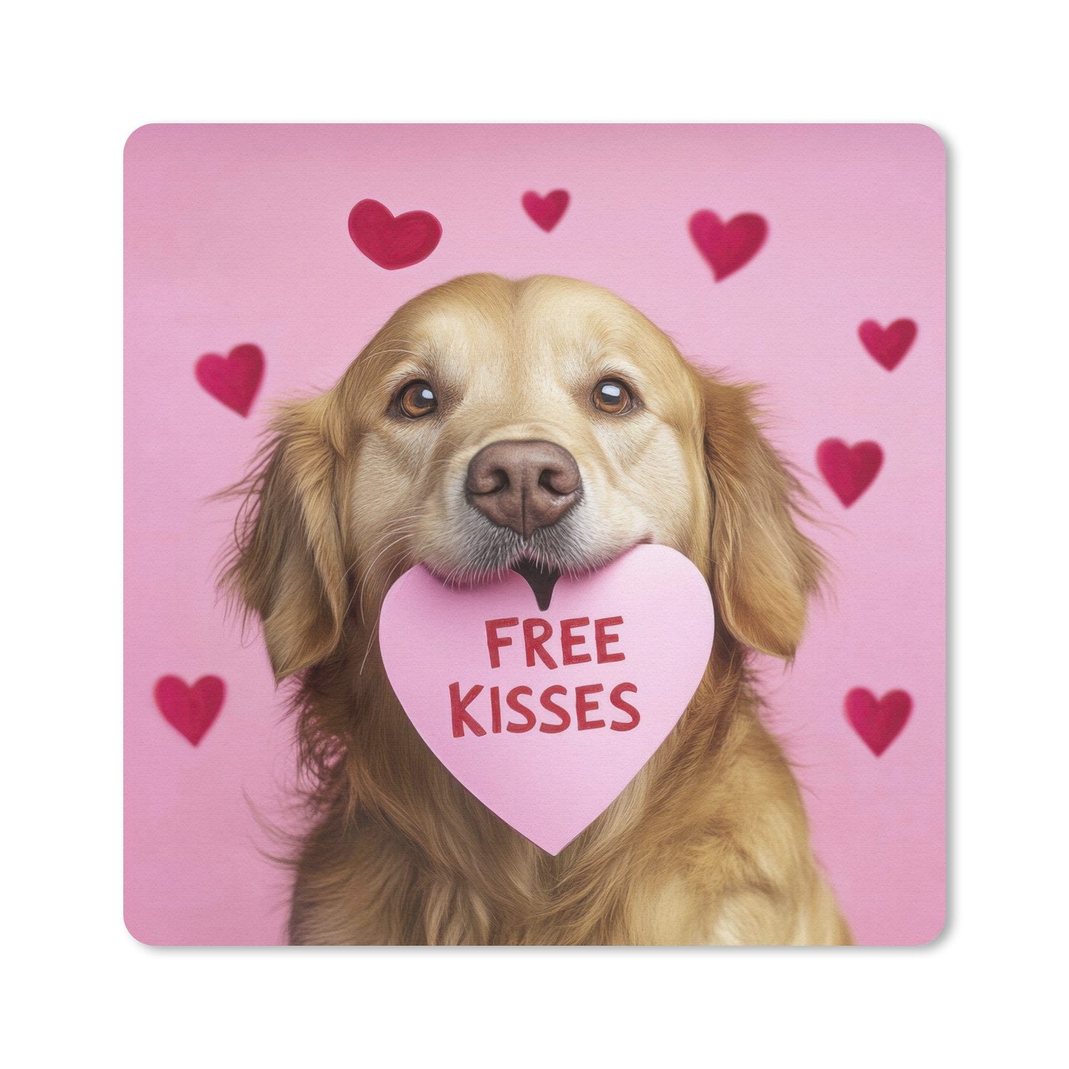 Ein Golden Retriever hält ein rosafarbenes herzförmiges Schild im Maul, auf dem in roten Buchstaben "FREE KISSES" steht. Im Hintergrund ein rosafarbener Farbverlauf mit verstreuten roten Herzen. Ein niedlicher und fröhlicher Look, der zum Kuscheln und Liebhaben einlädt.