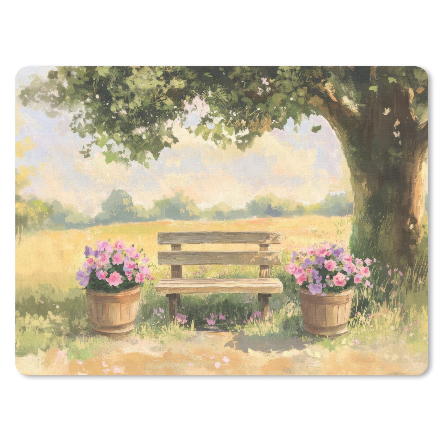 Eine Holzbank steht unter einem großen Baum auf einer sonnigen Wiese. Auf beiden Seiten stehen zwei Blumentöpfe mit rosa Blumen, die eine friedliche und romantische Atmosphäre schaffen.