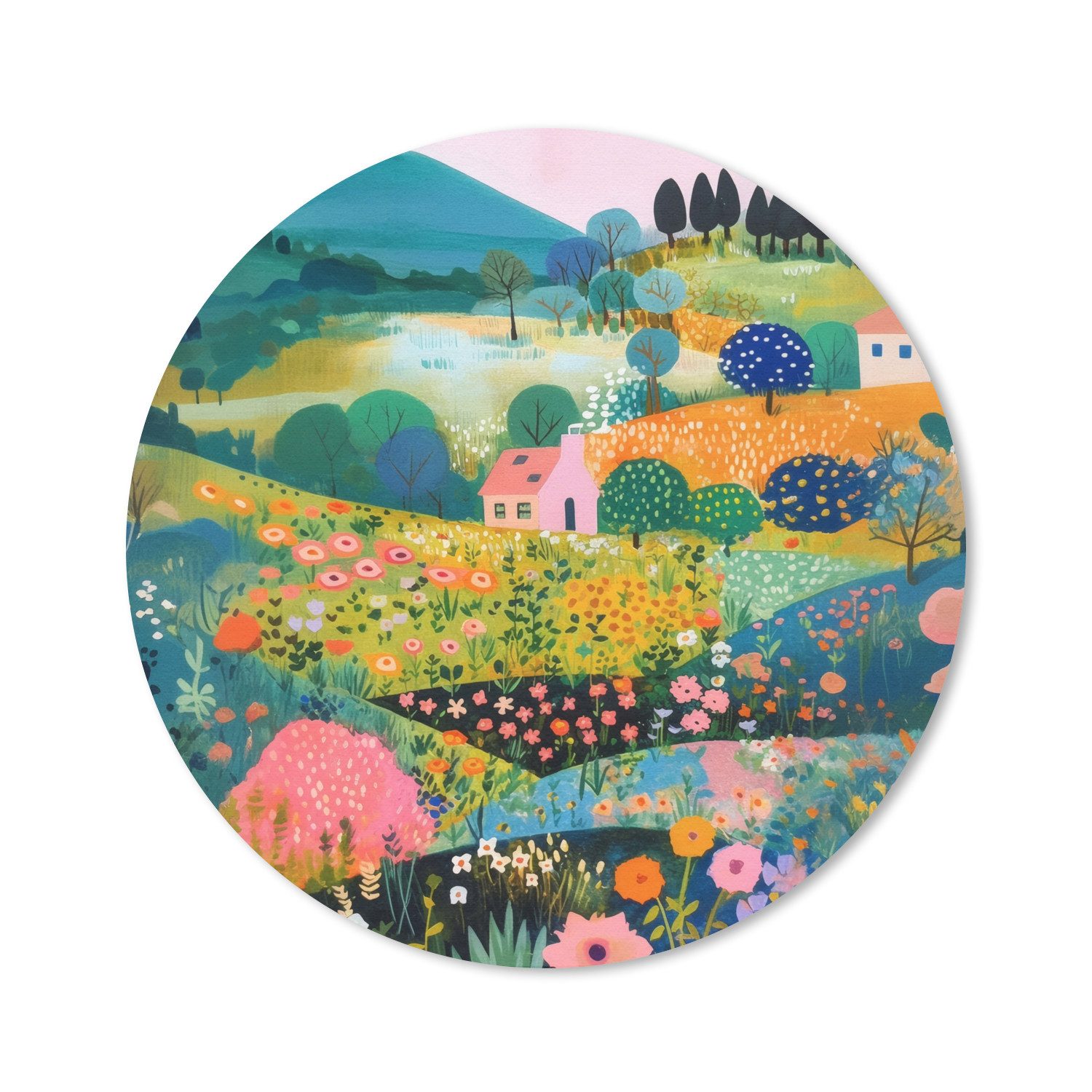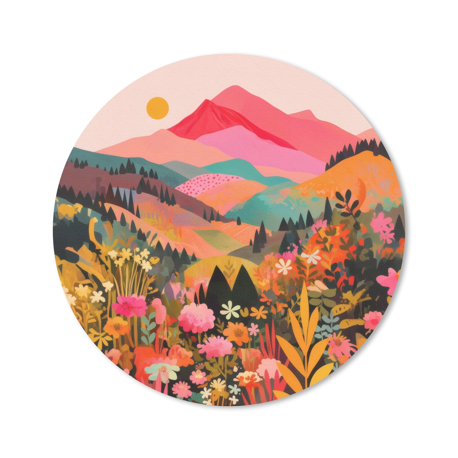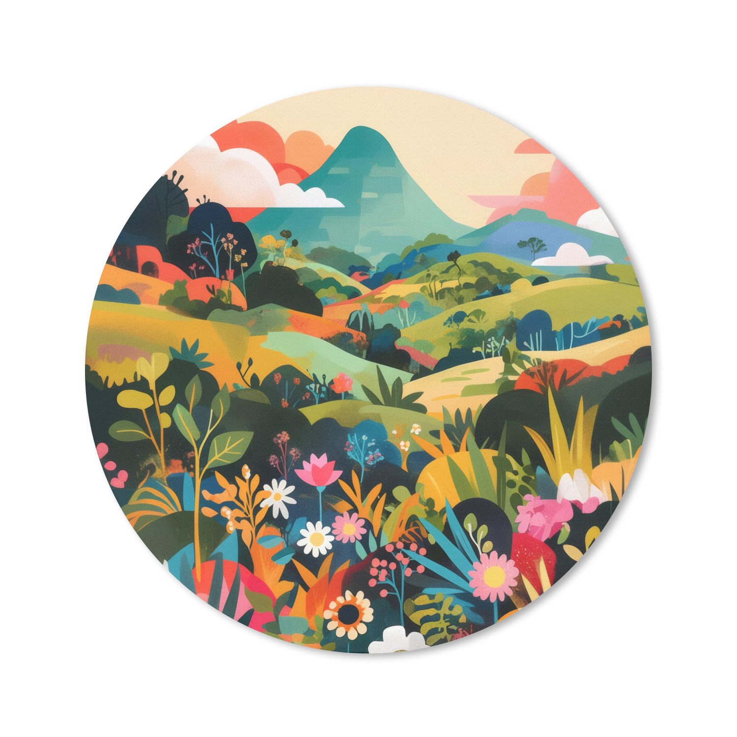 Sanfte grüne Hügel sind reichlich mit Blumen aller Farben bedeckt. Ein helles Sonnenlicht fällt auf die Felder, während der Horizont von Berggipfeln unter einem sanft bewölkten Himmel begrenzt wird.