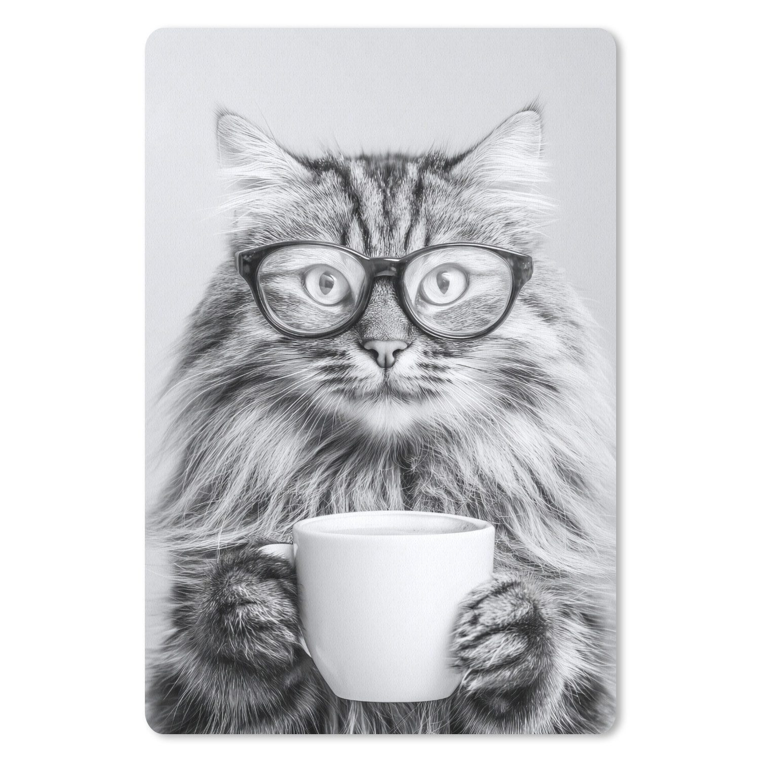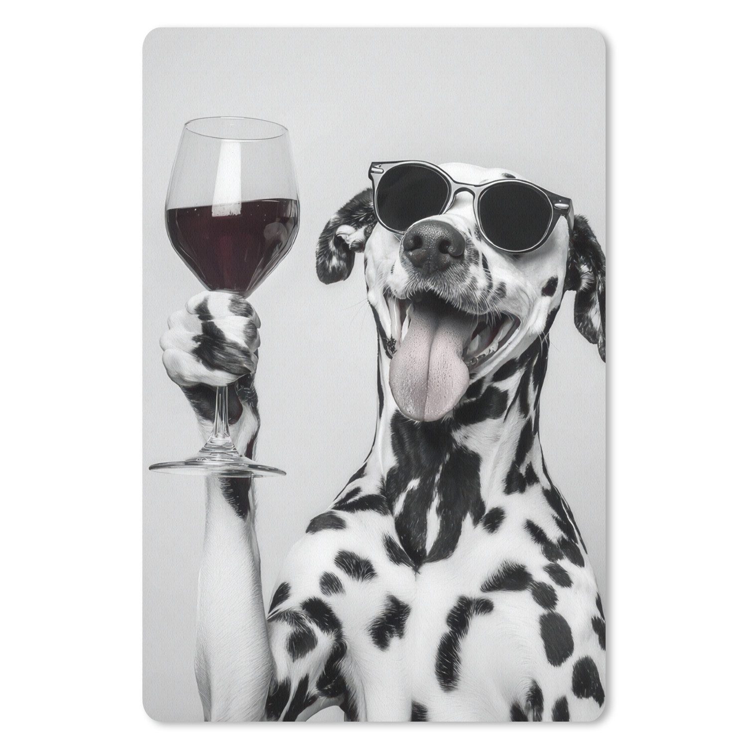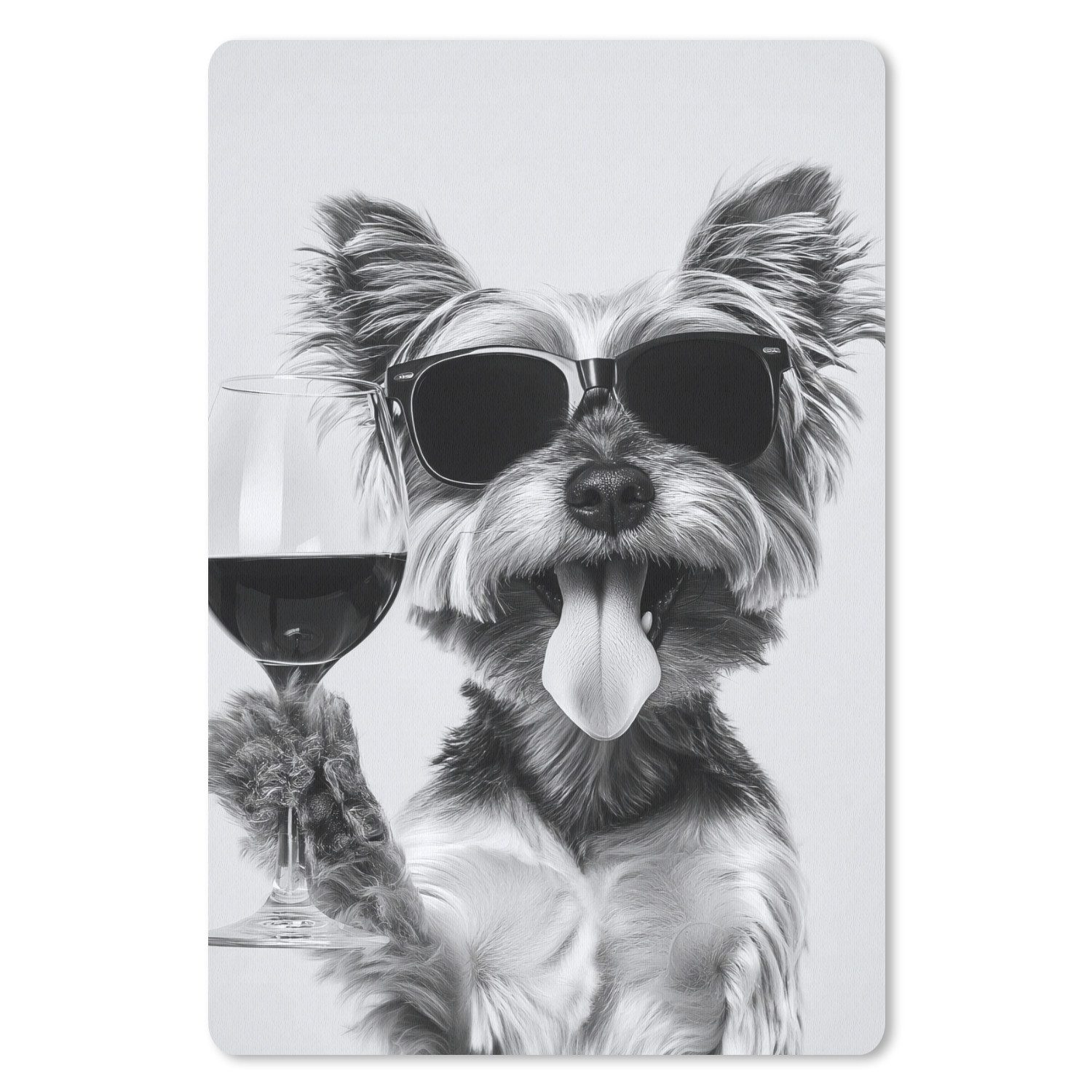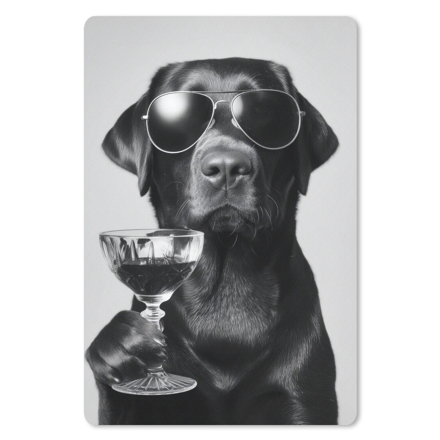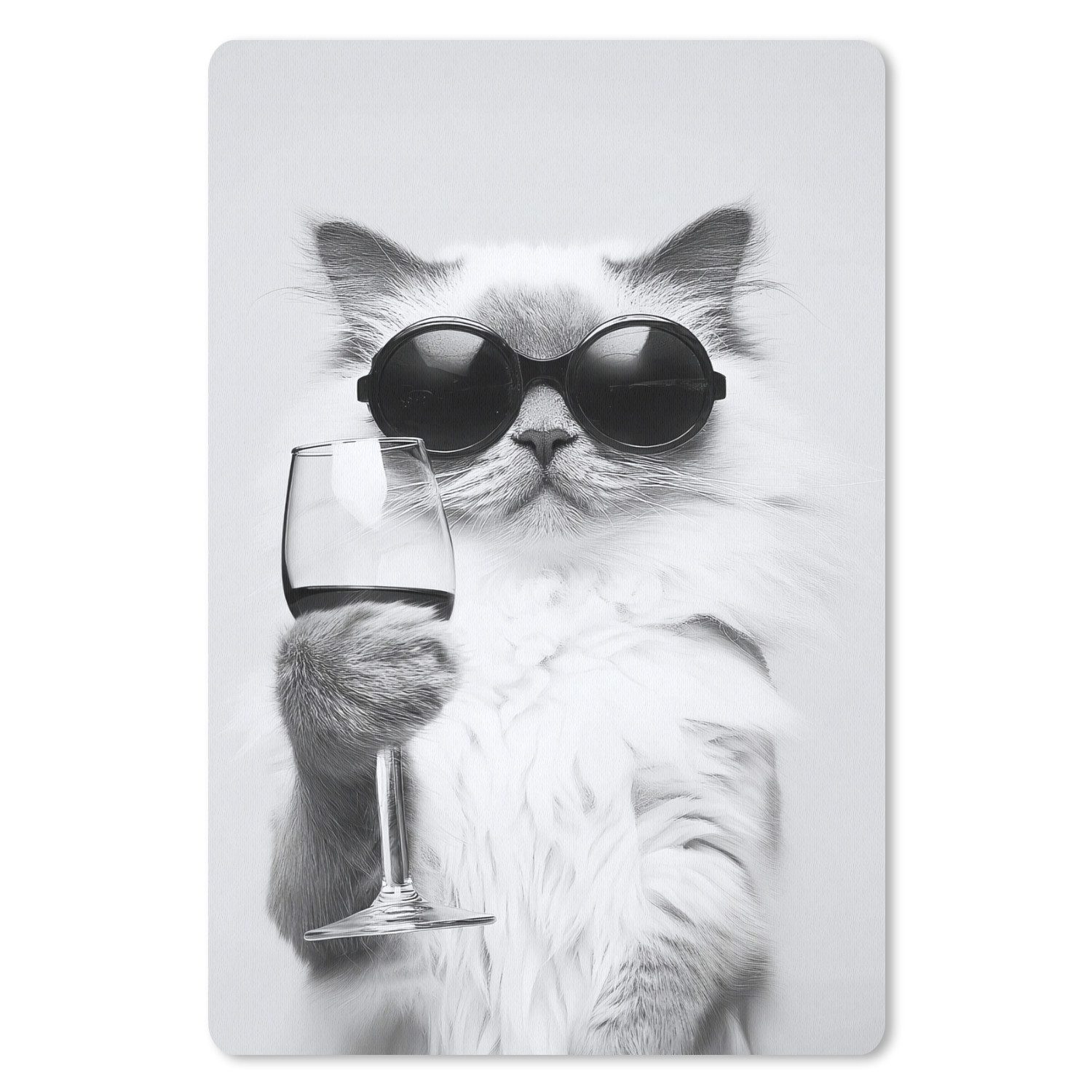 Eine langhaarige Katze mit Sonnenbrille hebt ein Weinglas und wirkt entspannt, aber würdevoll.