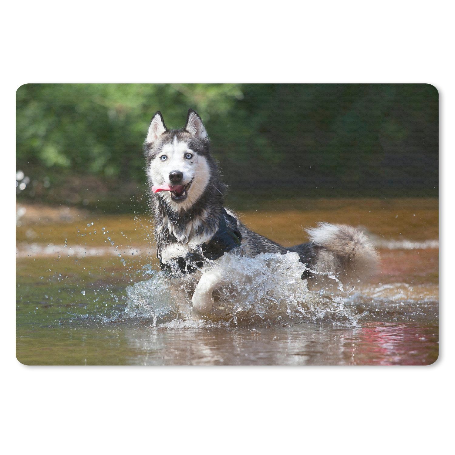 Dieser Husky rennt mit der Zunge aus dem Maul durch das dunkel aussehende Wasser.