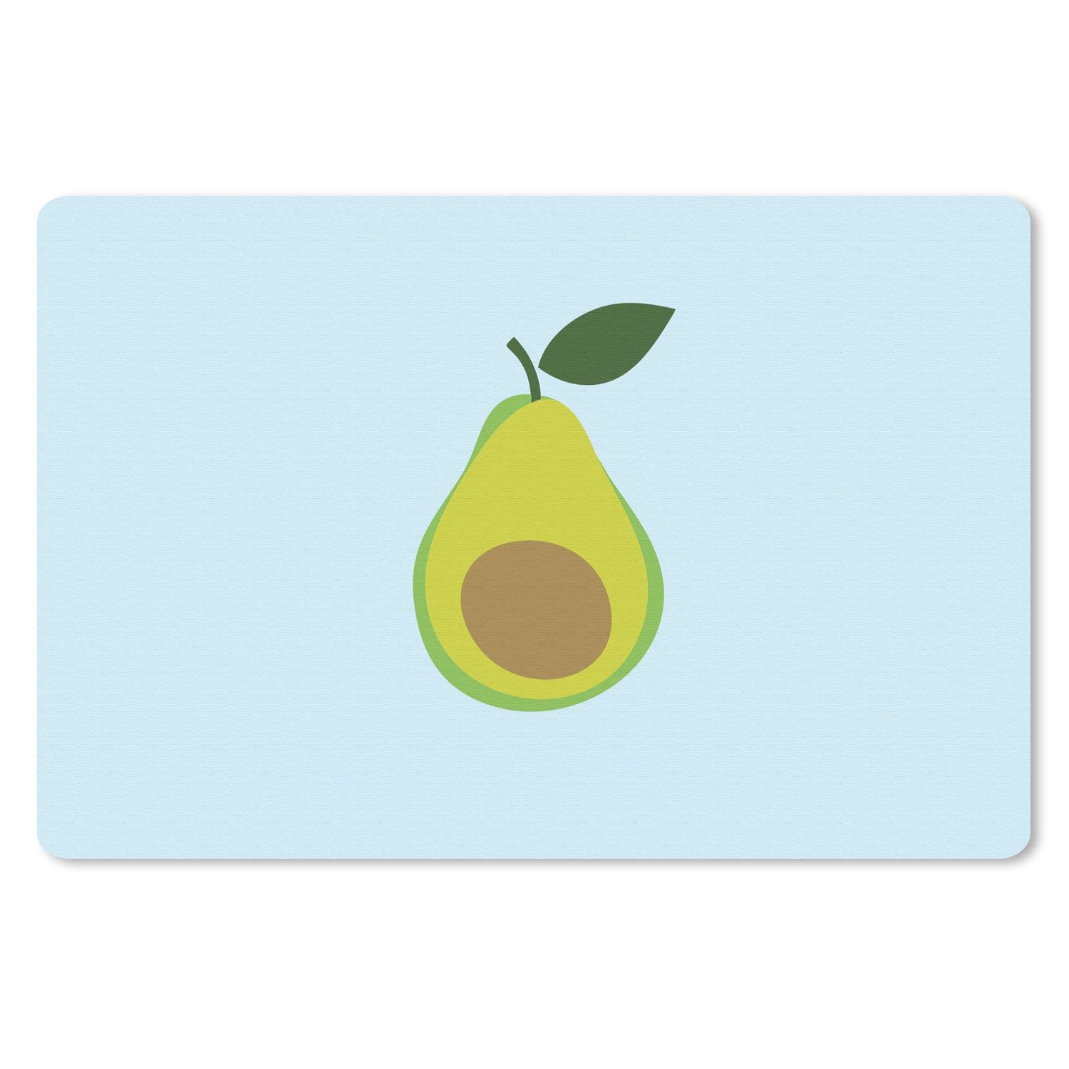 Ein Querschnitt einer Avocado mit einer grünen Schale, einem hellgrünen Inneren und einem braunen Kern. Die Illustration steht vor einem hellblauen Hintergrund für einen frischen Look.