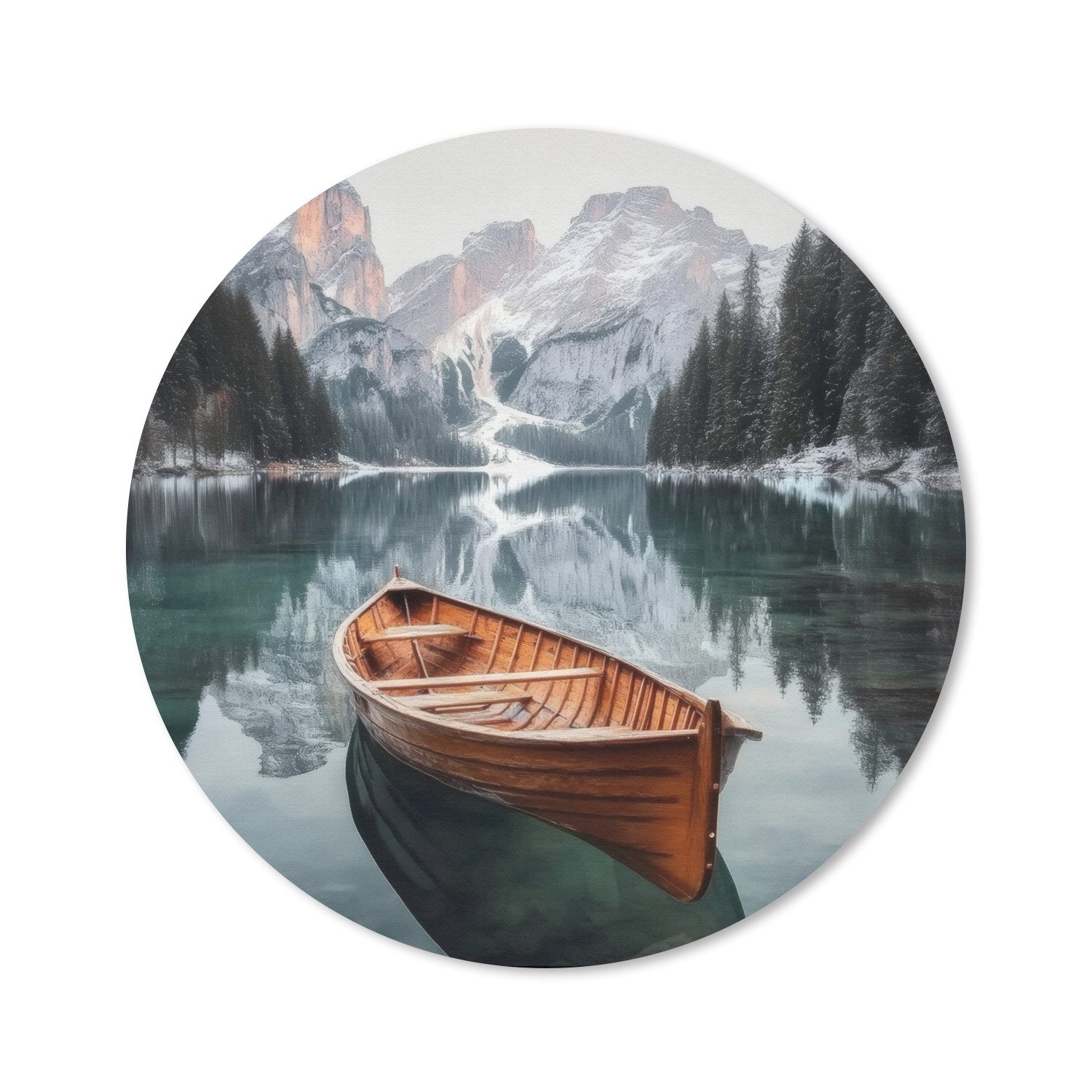 Ein hölzernes Ruderboot schwimmt lautlos auf einem klaren, spiegelnden Bergsee, umgeben von schneebedeckten Kiefernwäldern und imposanten, sonnenbeschienenen Berggipfeln. Die Spiegelung der Landschaft ist im ruhigen Wasser deutlich sichtbar und schafft ein fast symmetrisches Bild von Ruhe und Natur.