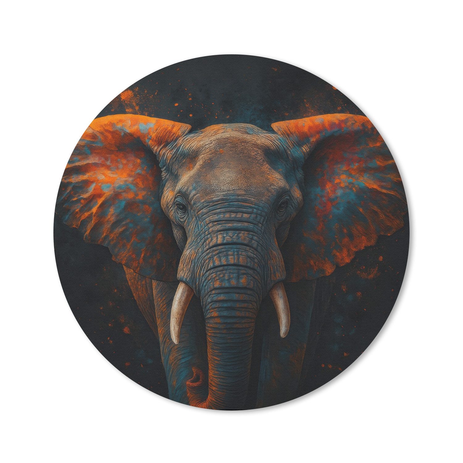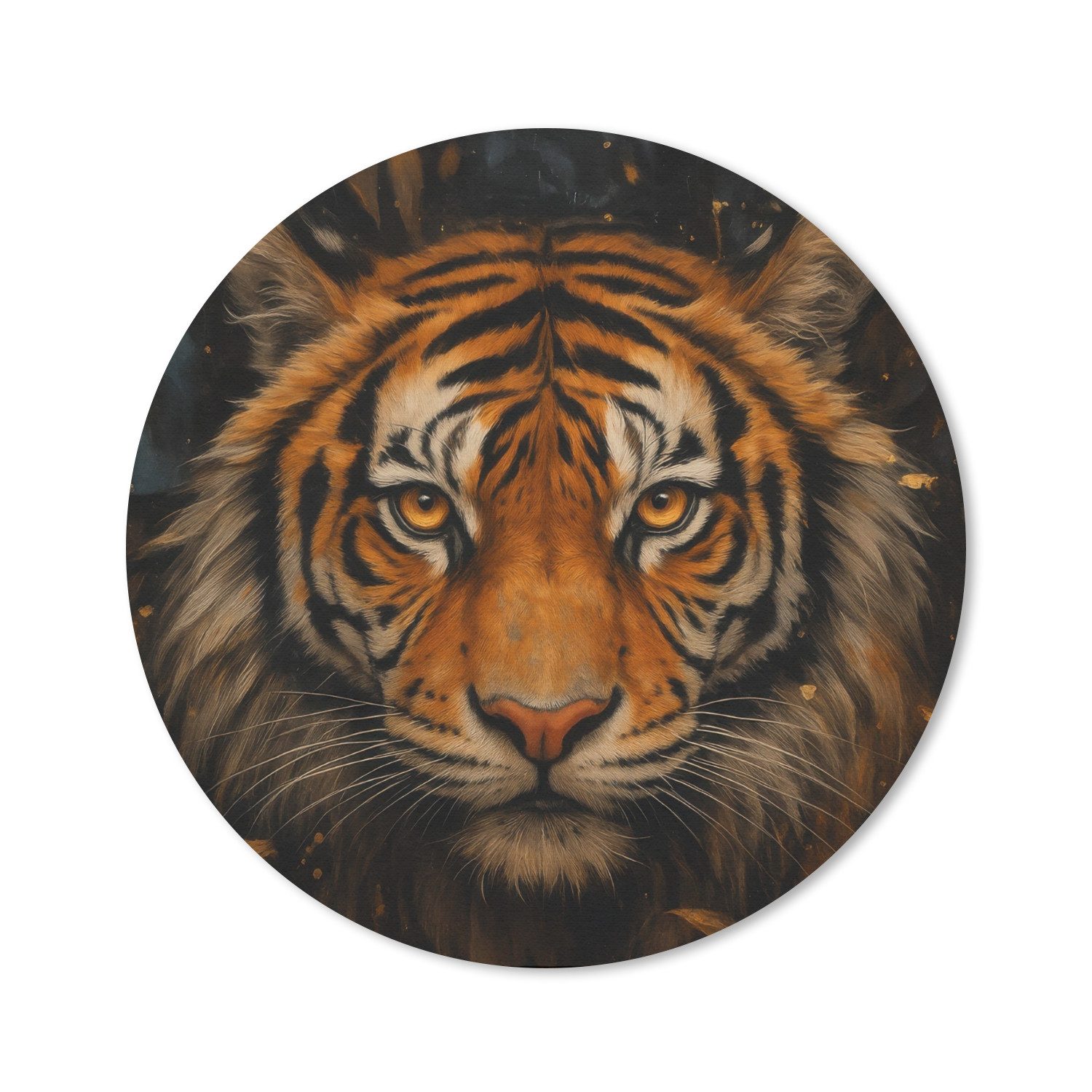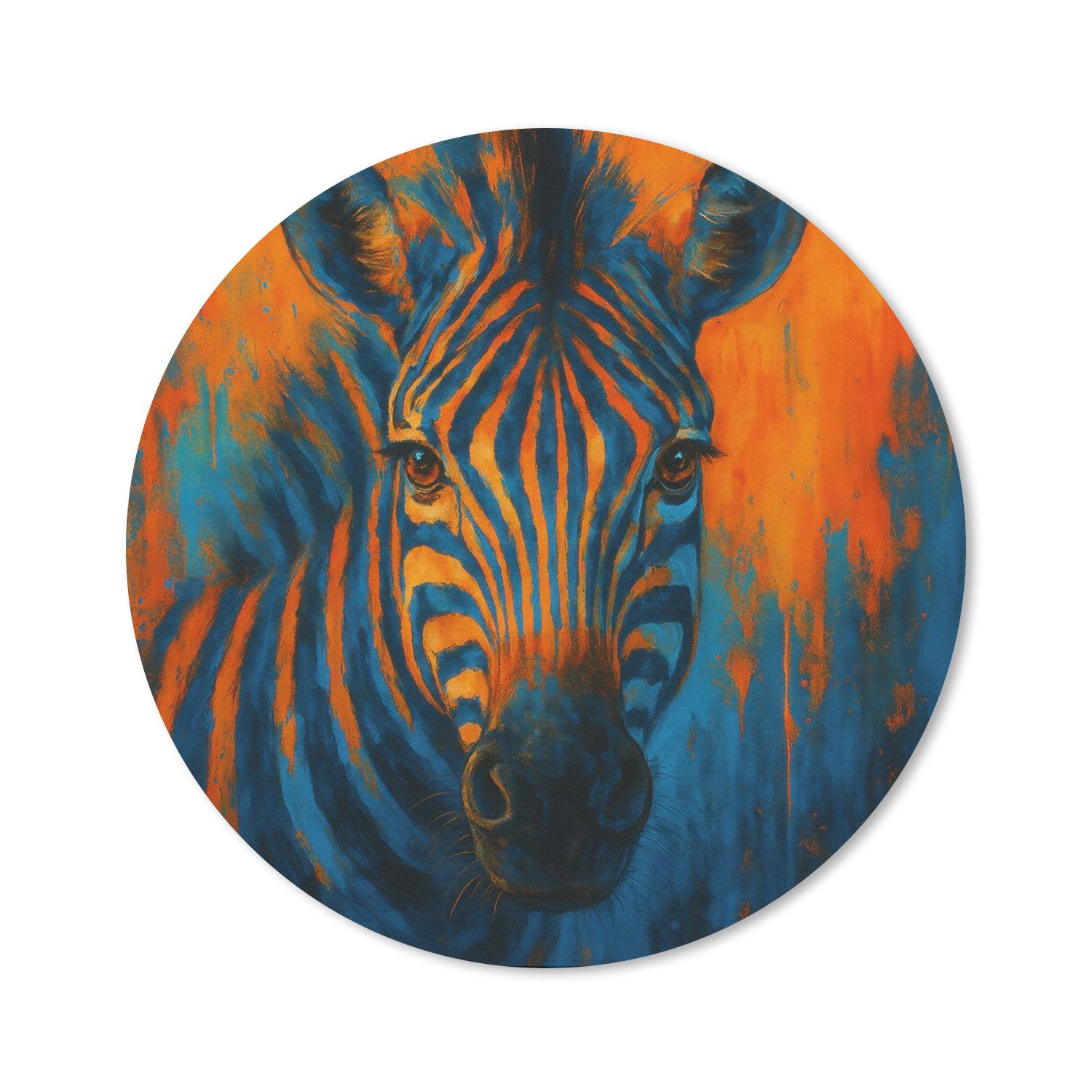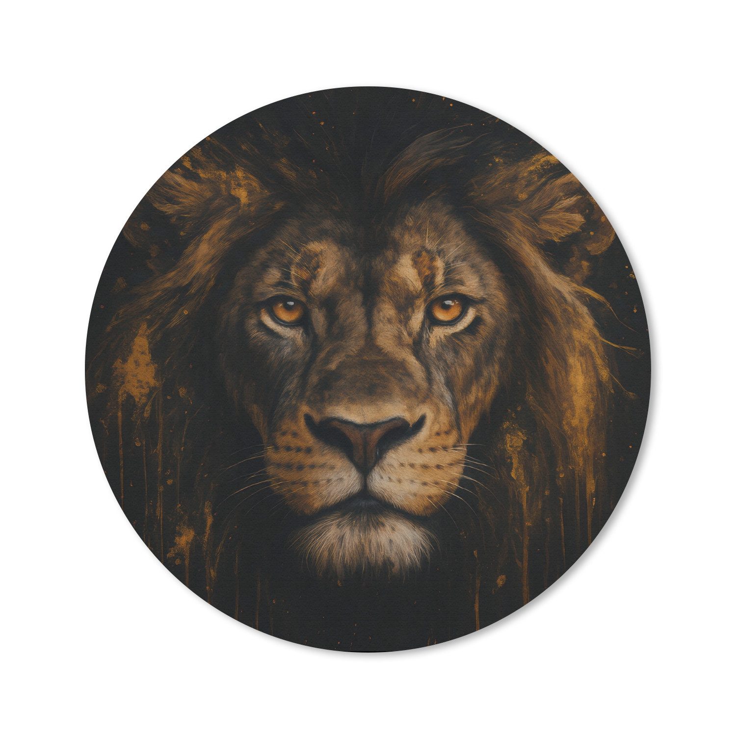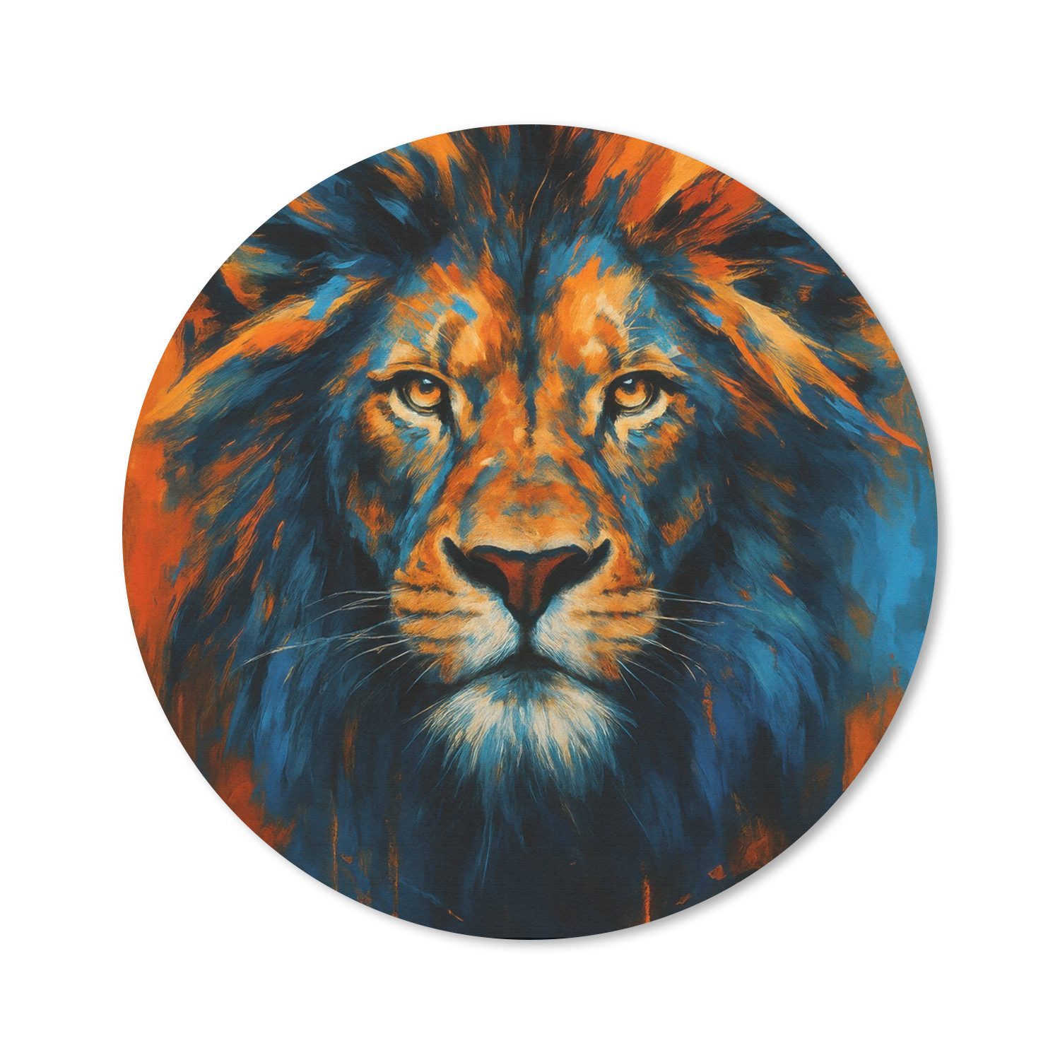 Ein Löwenkopf erscheint kraftvoll in Orange und Blau, mit scharfem Blick und feuriger Mähne in einem ausdrucksstarken Malstil.