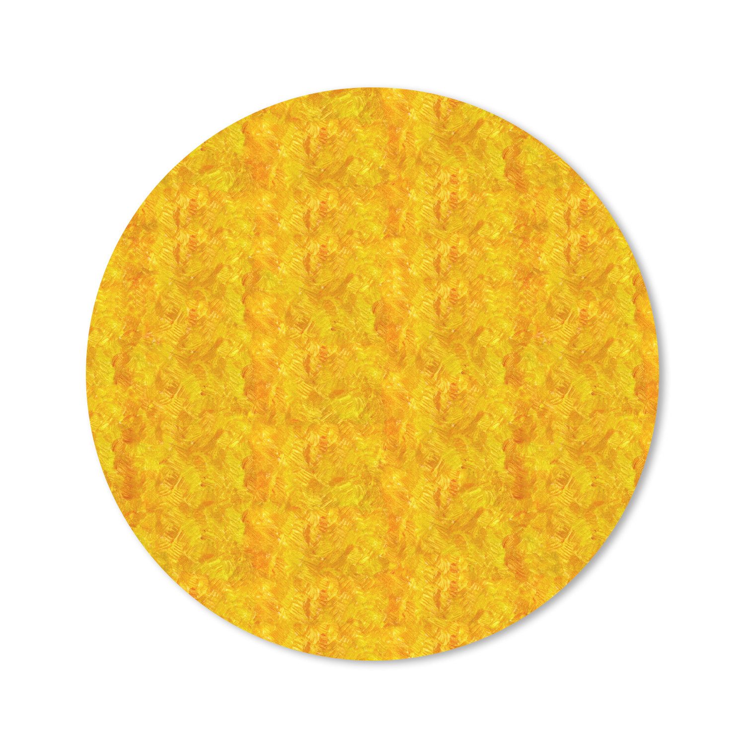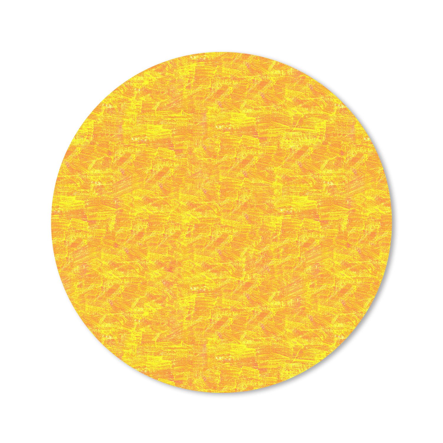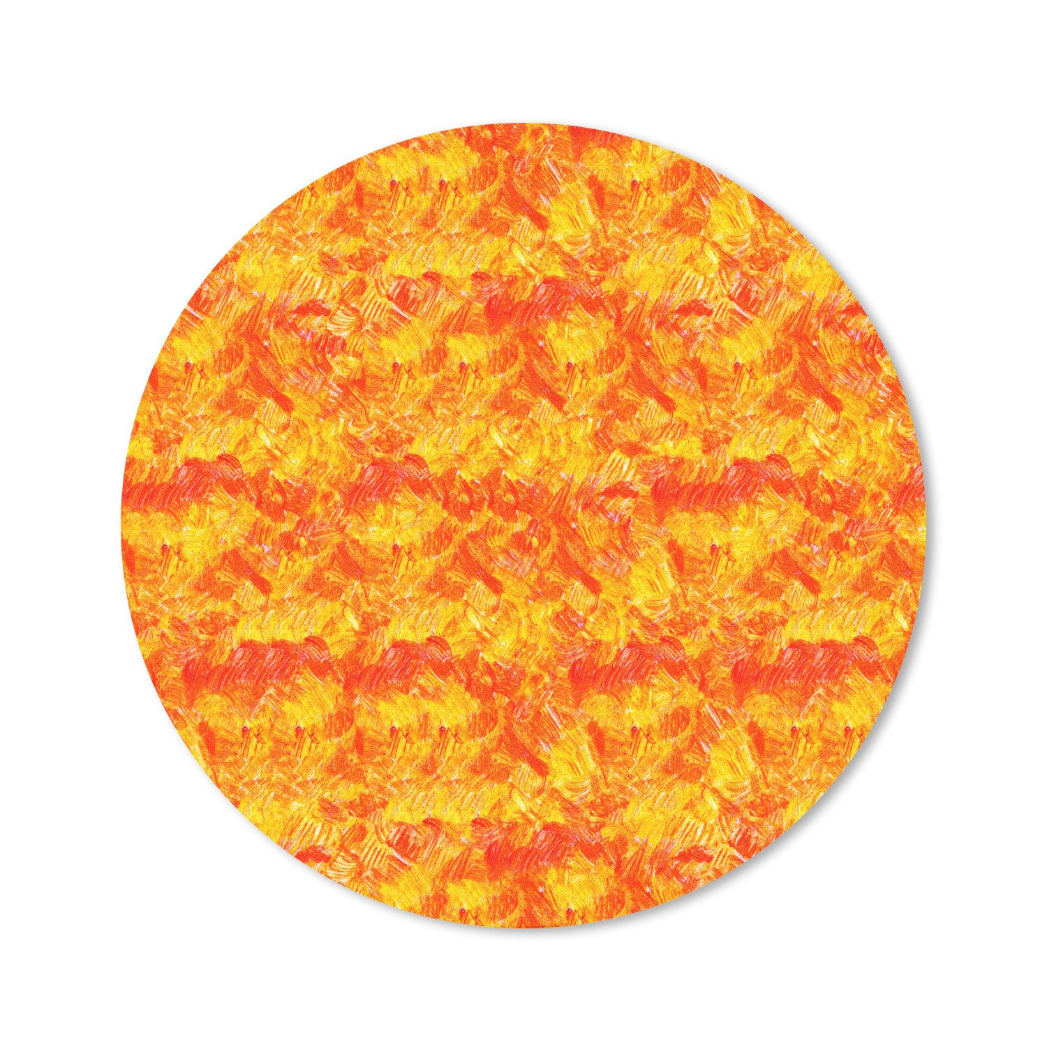 Leuchtend gelbe und orangefarbene Pinselstriche bilden ein rhythmisches Muster, das an Flammen oder Sonnenstrahlen erinnert. Die Farbe wird in kurzen, geschwungenen Strichen aufgetragen, wodurch eine warme, lebendige Textur entsteht. Die Skulptur strahlt Energie und Bewegung aus.