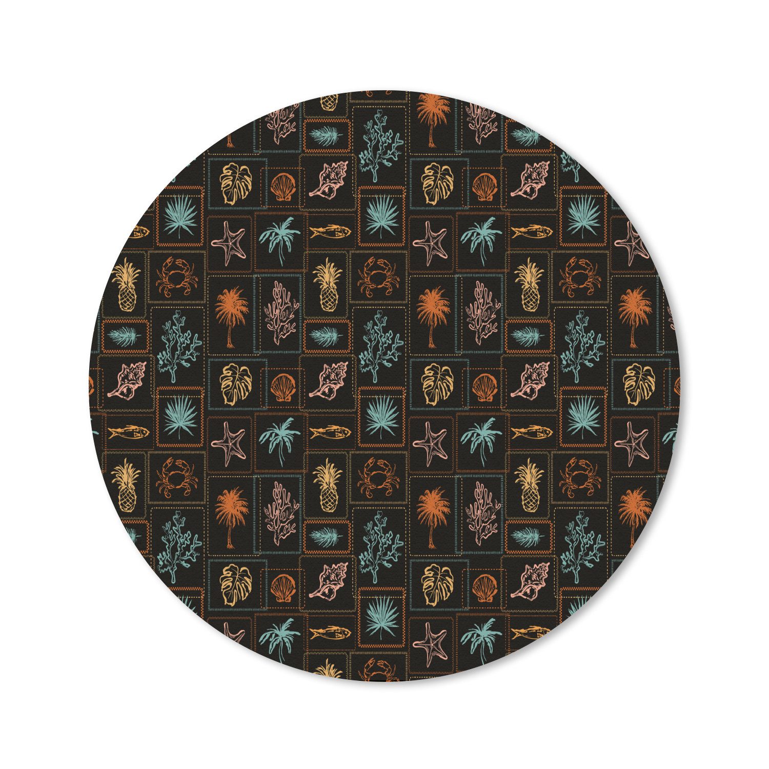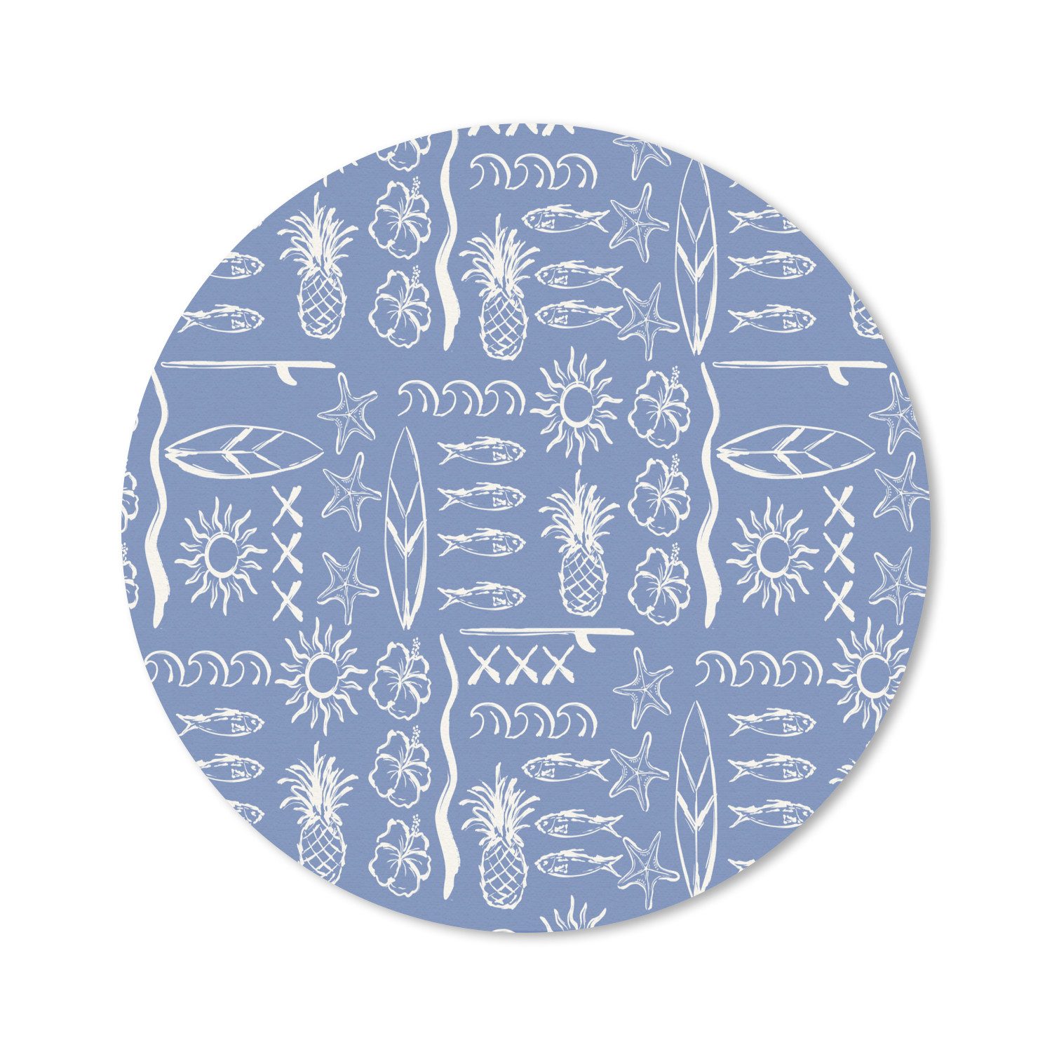 Weißes Linienmuster mit Ananas, Hibiskusblüten, Surfbrettern, Fischen, Sonnen, Wellen und Seesternen auf einem violettblauen Hintergrund. Die verspielten, sommerlichen Illustrationen erwecken ein Gefühl von Strand, Freiheit und tropischer Entspannung.