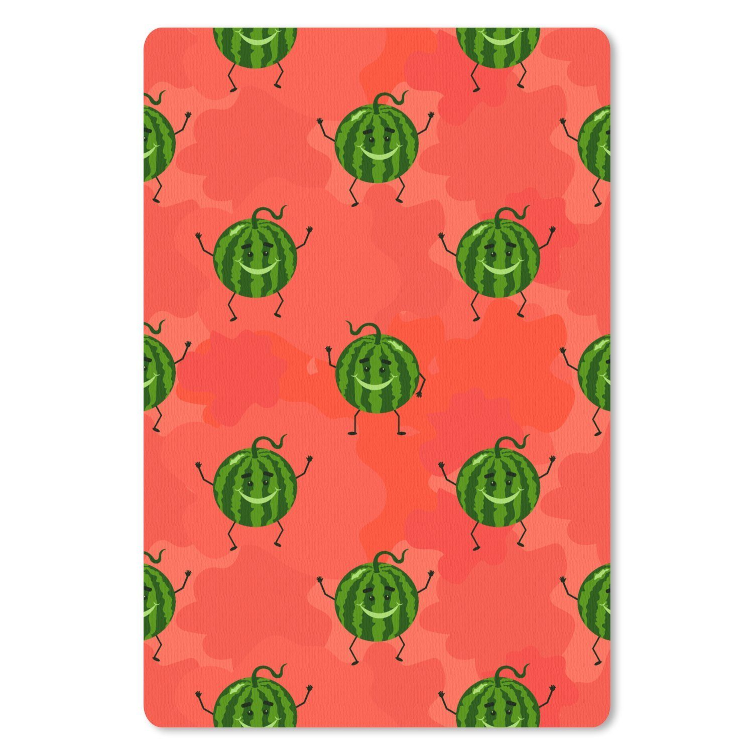 Muster von glücklichen Melonen auf rotem Hintergrund.