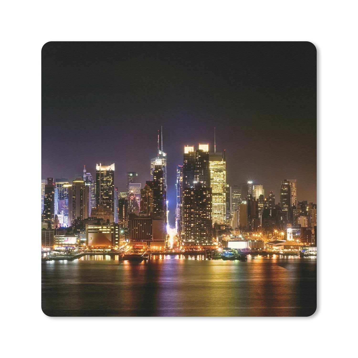 Eine Darstellung der Skyline der Stadt New York in den Abendstunden. Die Gebäude sind mit verschiedenen Farben beleuchtet.