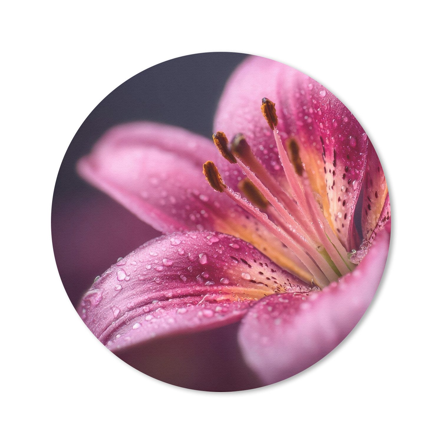 Eine rosa Lilie mit gelben Akzenten ist mit feinen Wassertröpfchen bedeckt. Die Blütenblätter sind entfaltet und der dunkle Hintergrund hebt die Blume hervor.