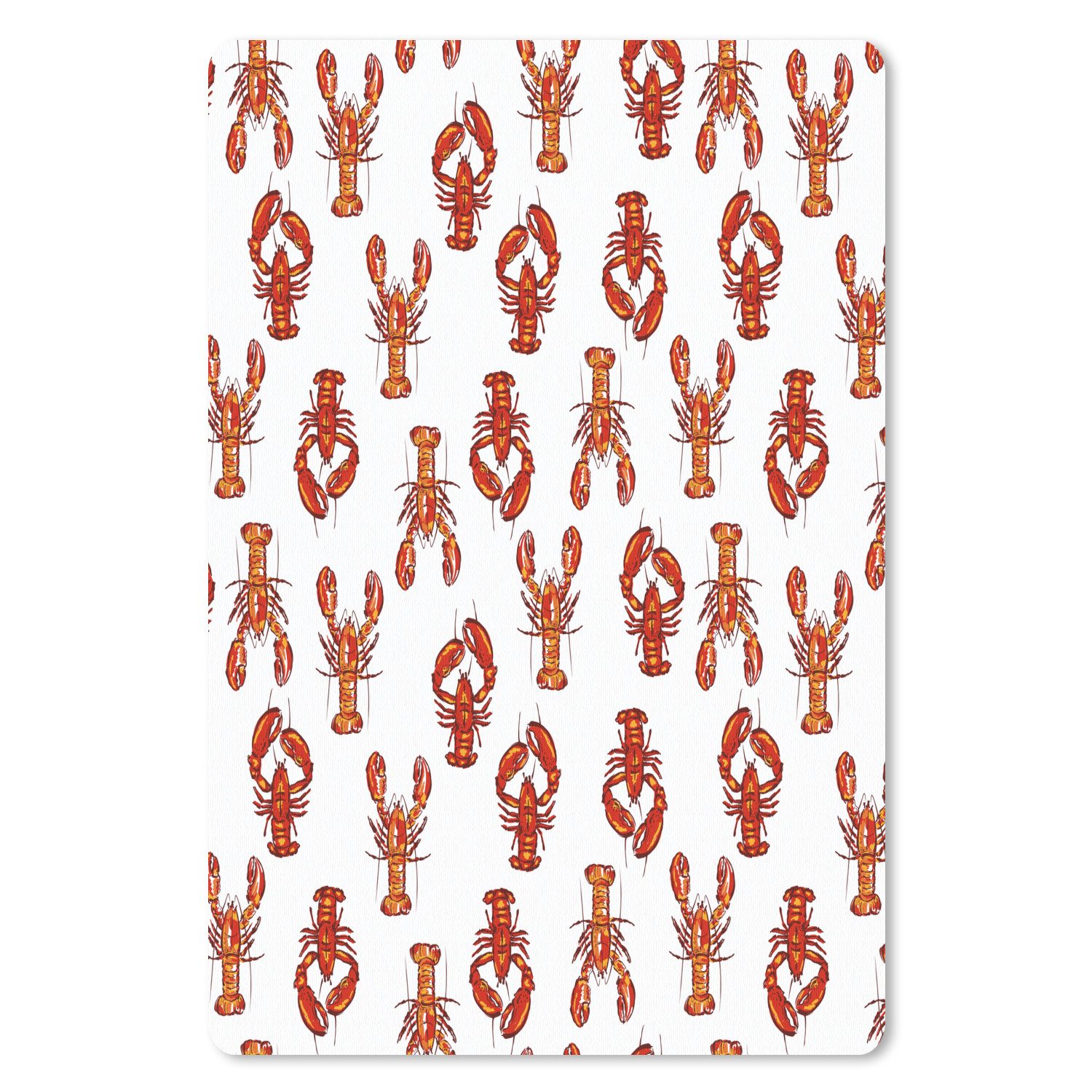 Sich wiederholendes Muster aus rot-orangen Hummern mit schwarzen Linien auf weißem Hintergrund. Die Hummer werden abwechselnd in verschiedenen Positionen gezeichnet, wodurch ein spielerisches und lebendiges Ganzes mit maritimem Charakter entsteht.