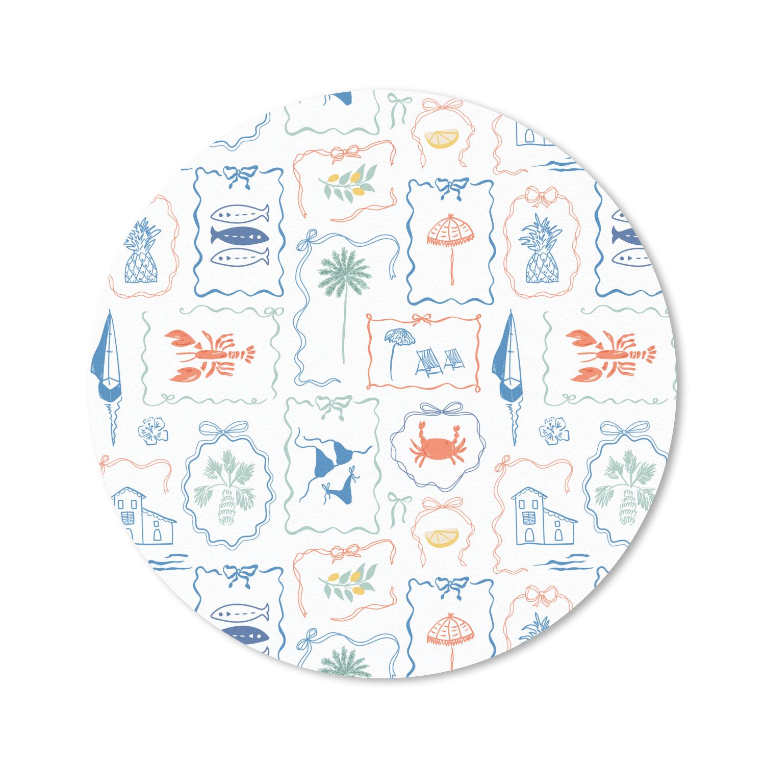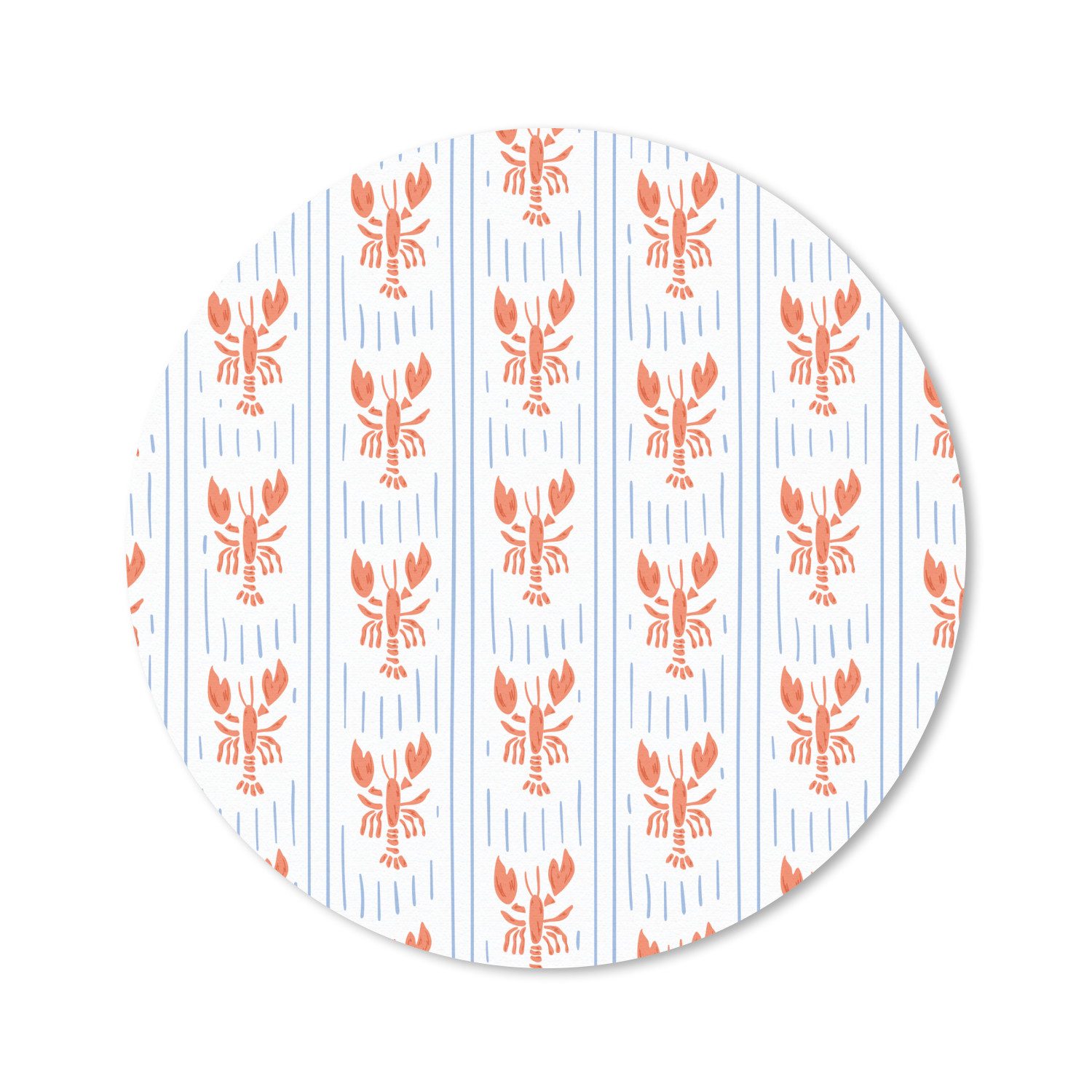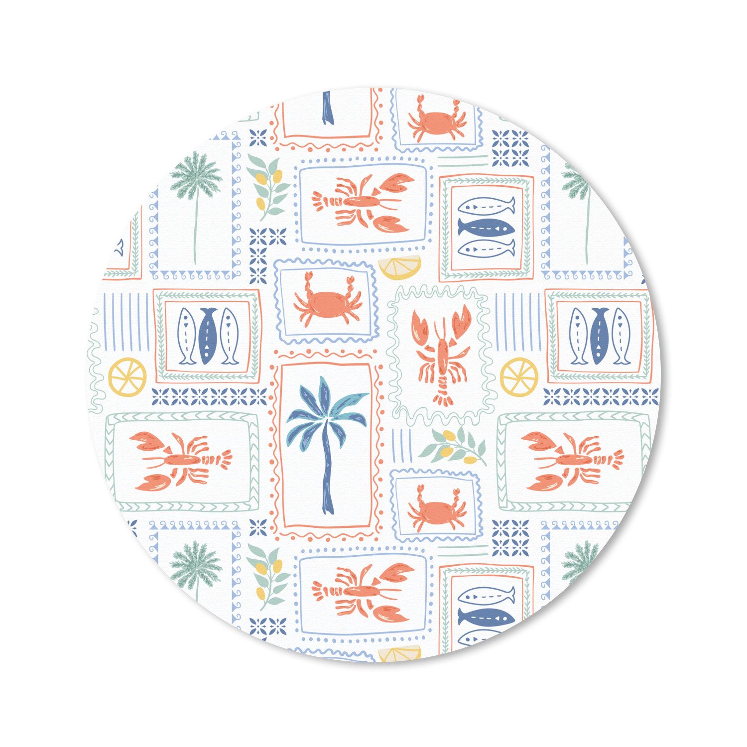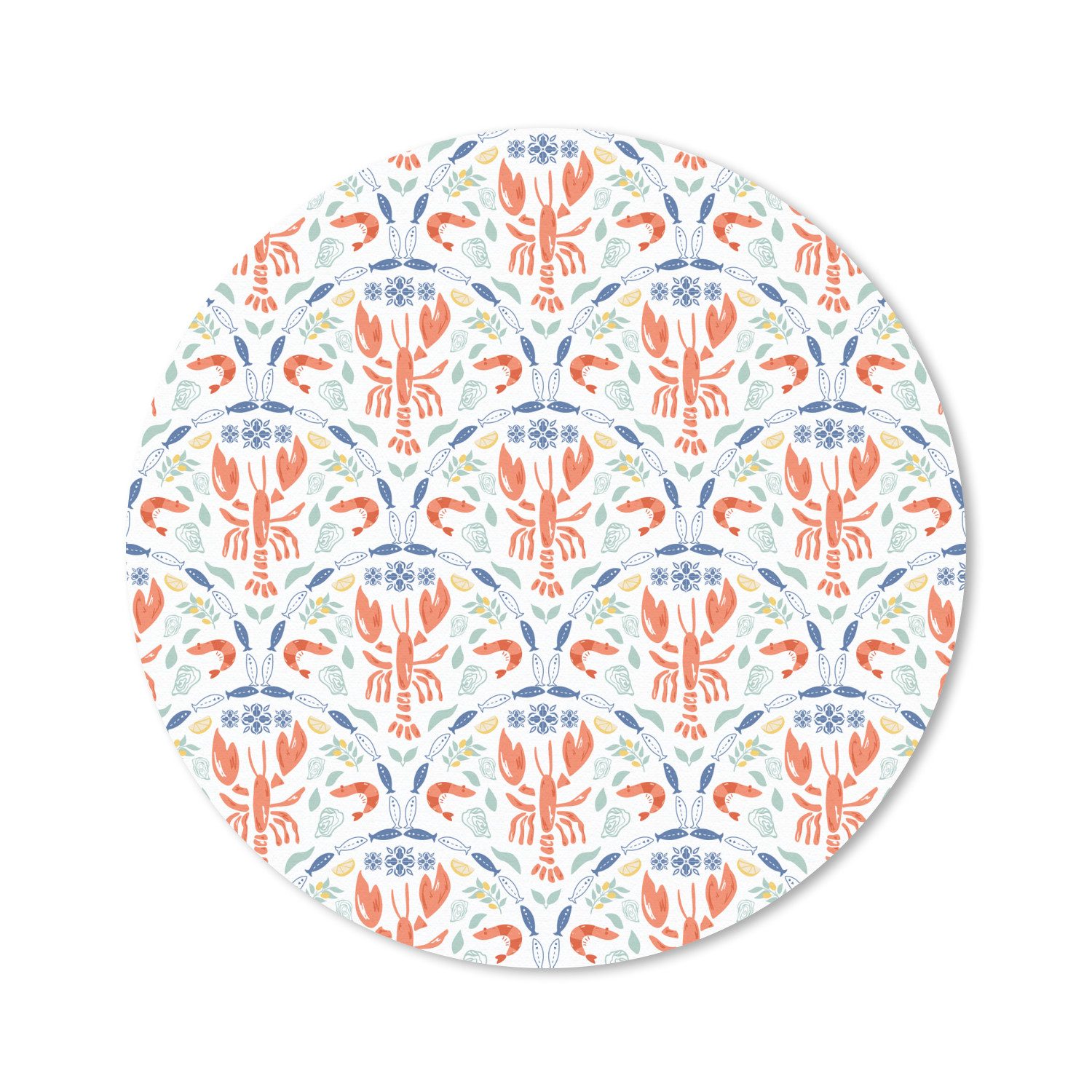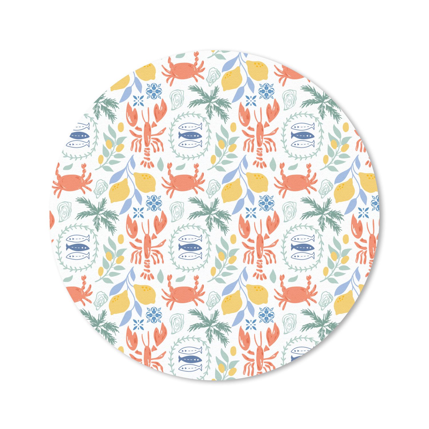 Symmetrisch wiederholtes Muster aus roten Hummern, Krabben, Fischen, Zitronenscheiben, Muscheln und Blättern. Blaue florale Akzente lockern die Komposition auf. Der Hintergrund ist weiß, wodurch die Farben Orange, Blau, Grün und Gelb frisch und sommerlich wirken.