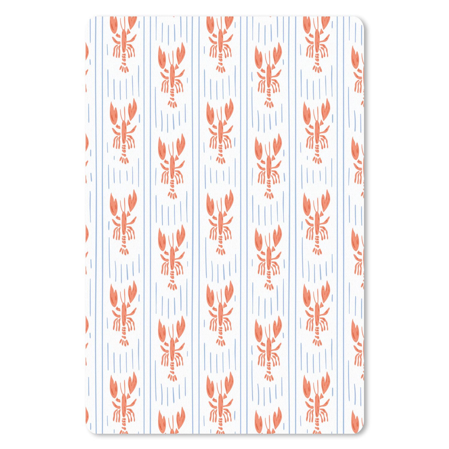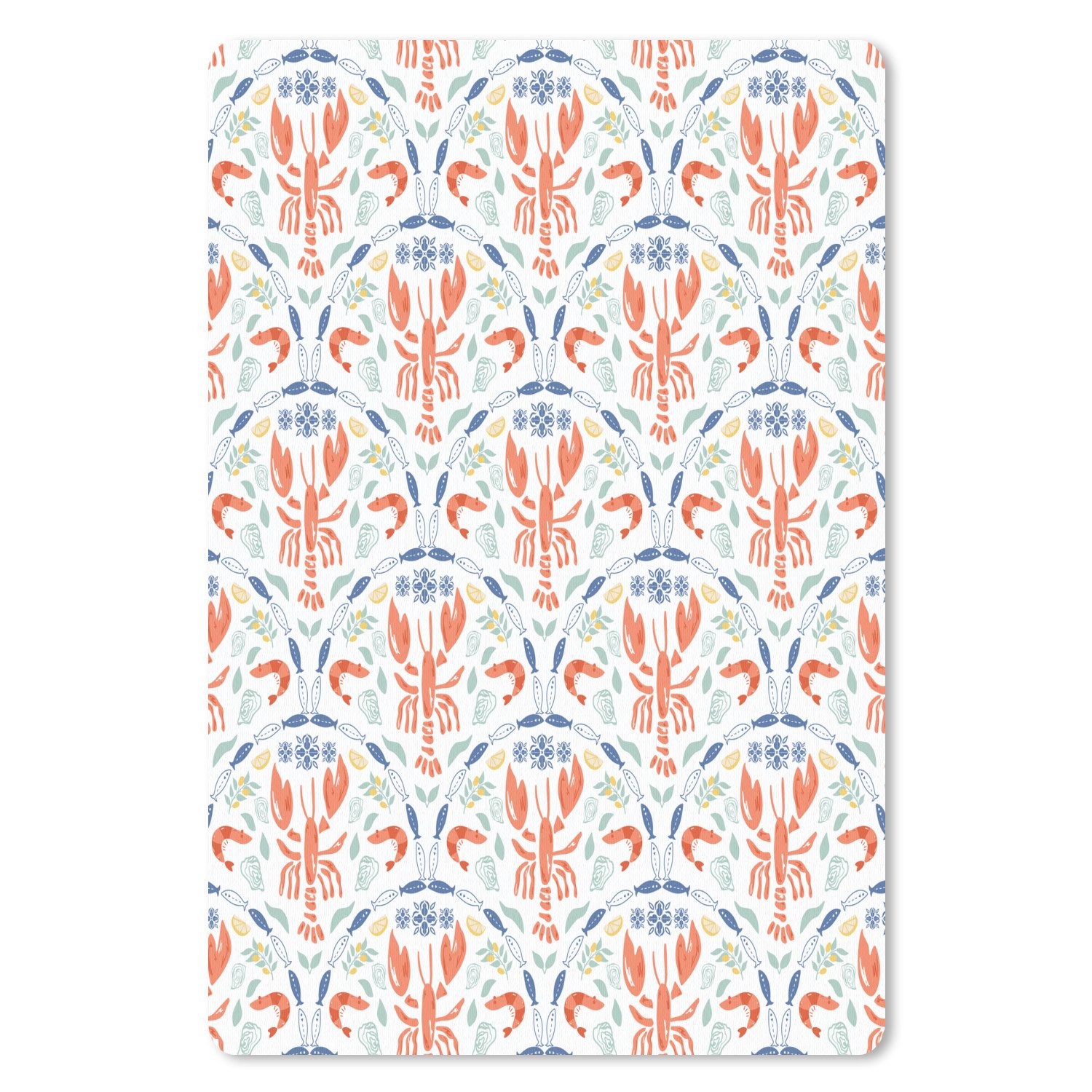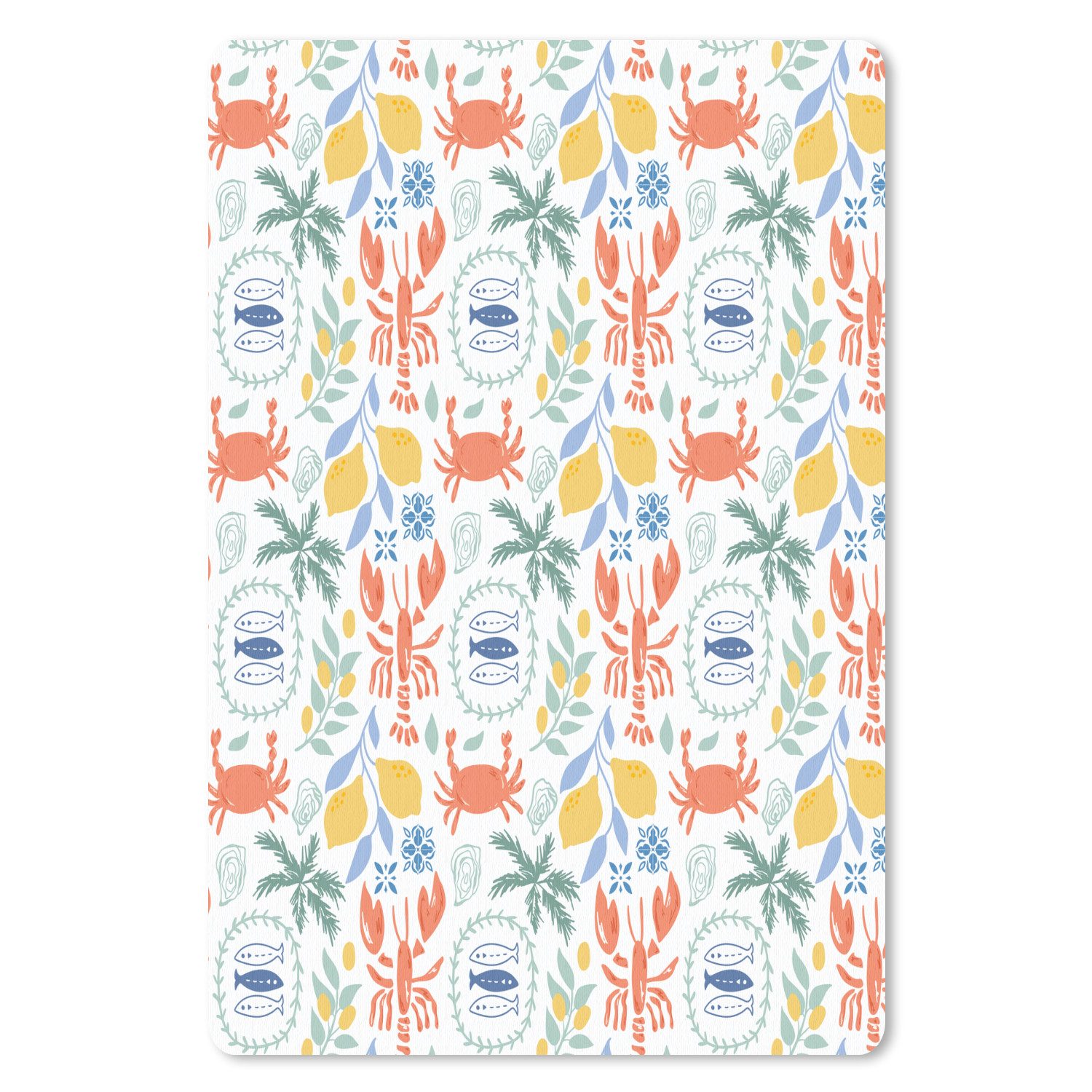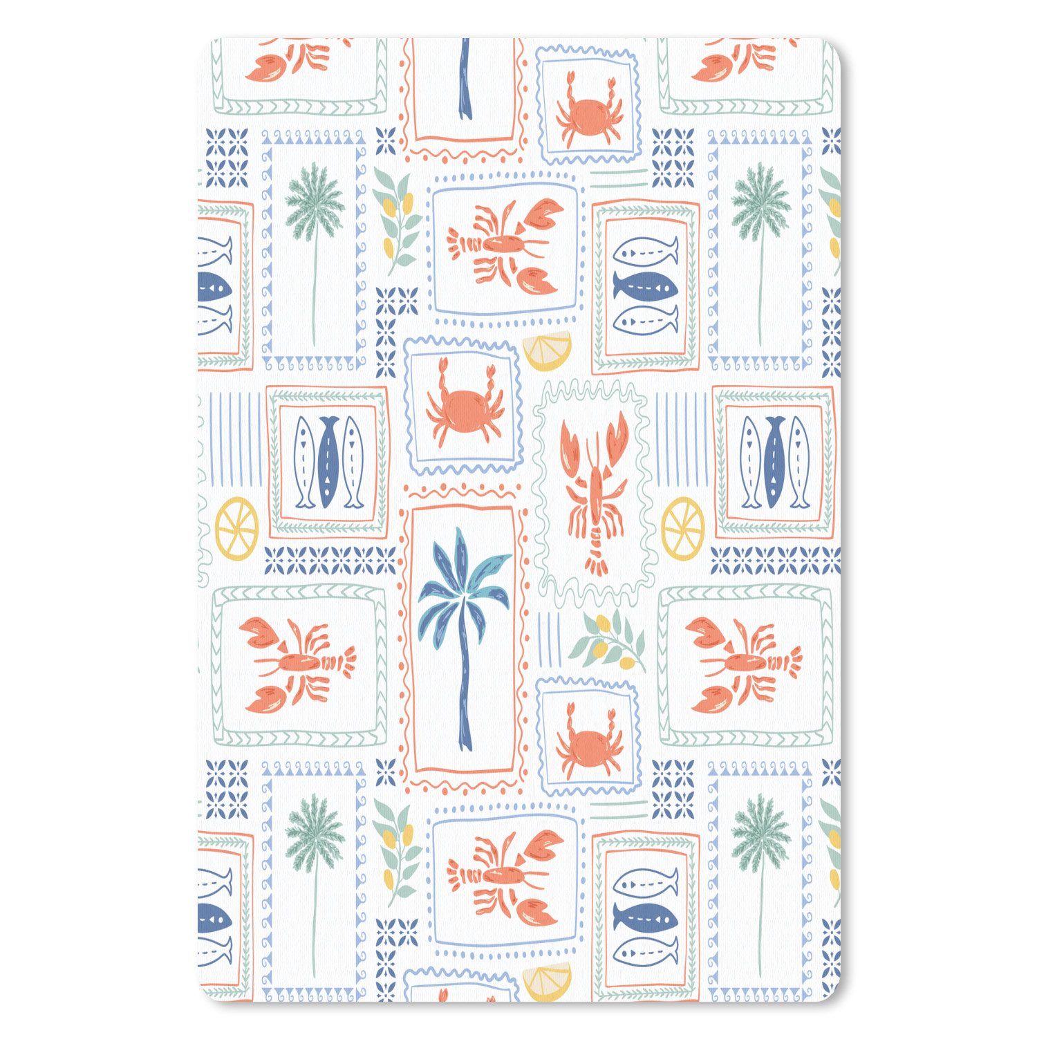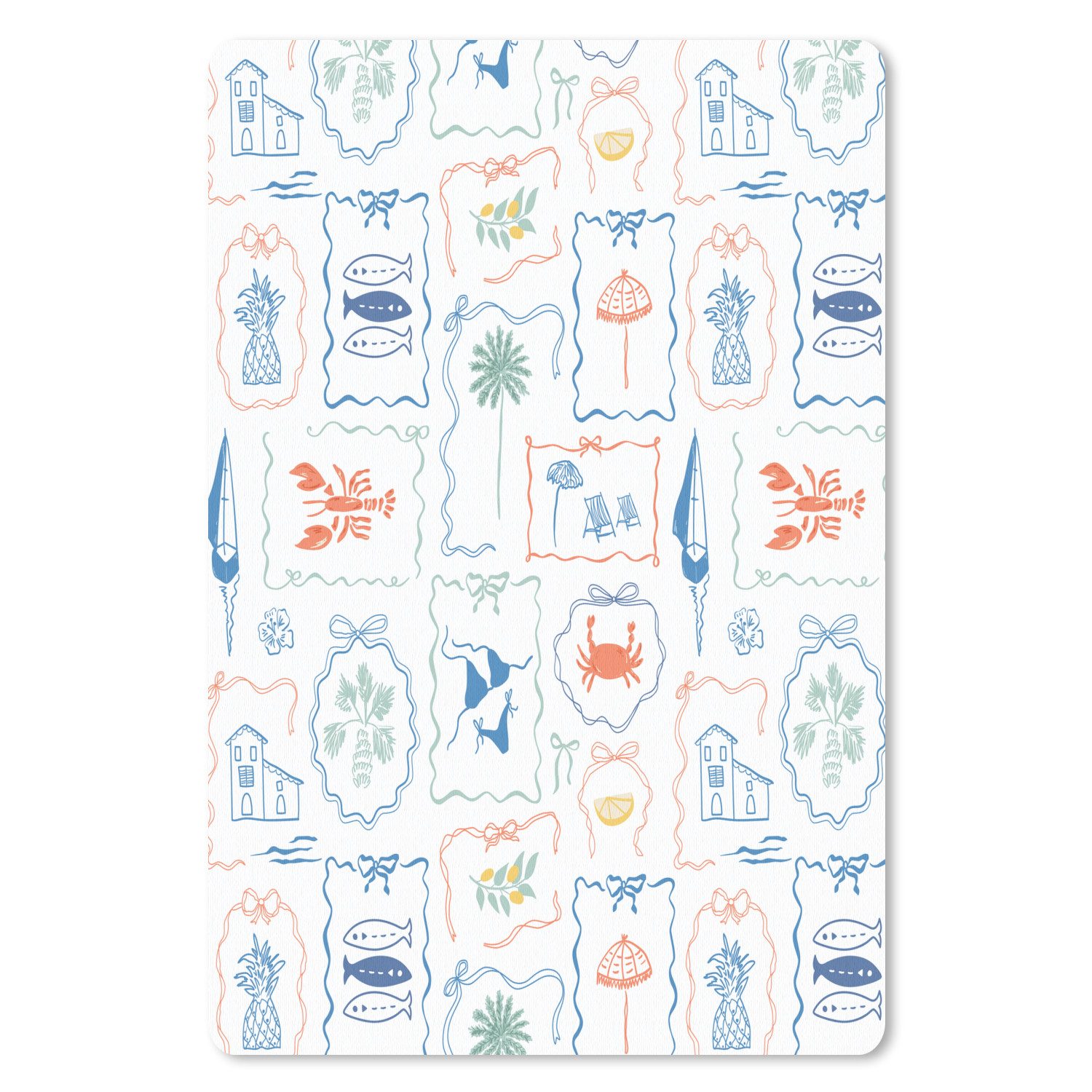 Fröhliches Muster mit sommerlichen Illustrationen, eingerahmt von verspielten Bandrahmen. Objekte wie Liegestühle, Bikinis, Krabben, ein Segelboot, Palmen, Zitrusfrüchte und ein Häuschen füllen das Design in sanften mediterranen Farben. Die verschiedenen Formen und Schleifen sorgen für ein luftiges, festliches Aussehen.