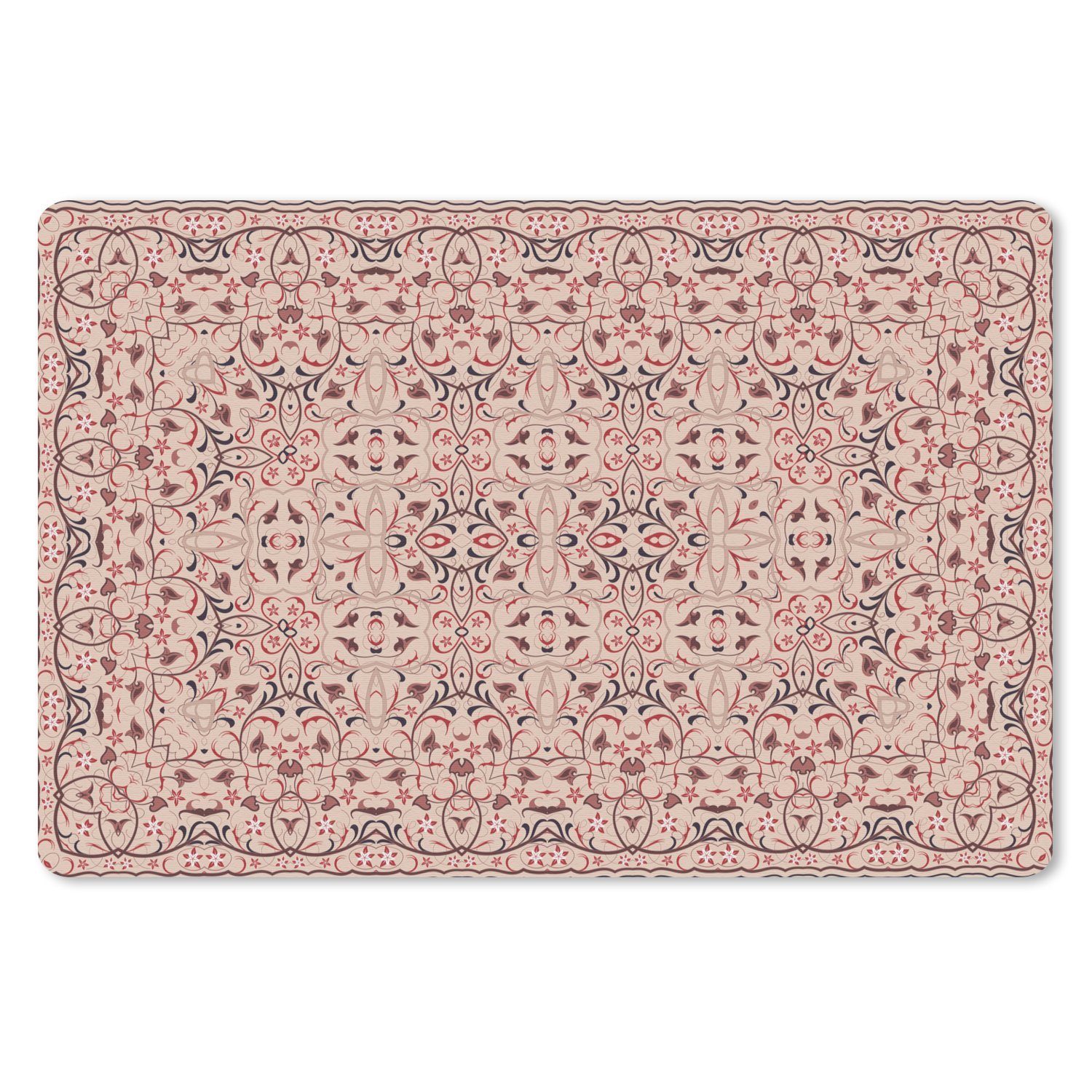 Draufsicht auf einen rosaroten Perserteppich mit einem symmetrischen Muster.
