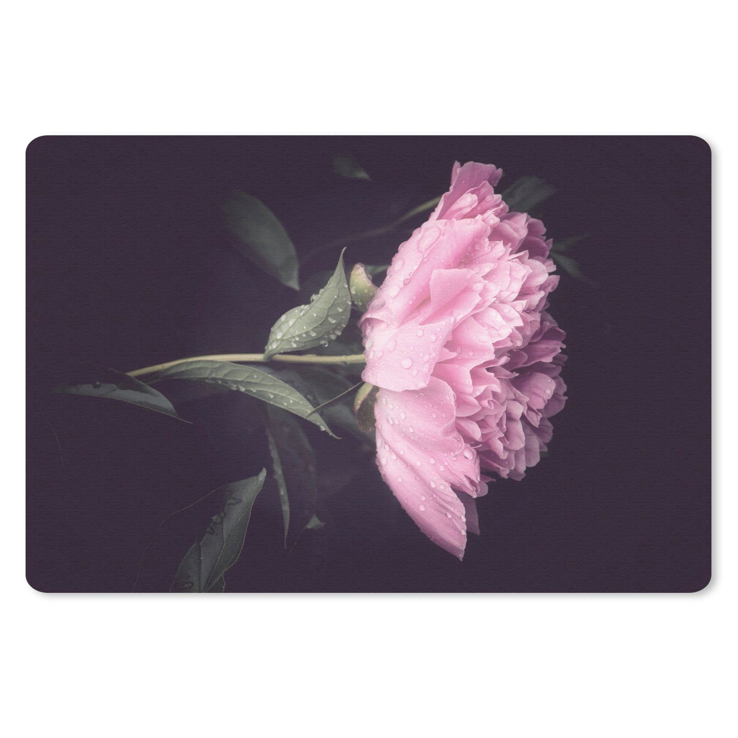 Eine blühende, pastellrosa Pfingstrose wird von winzigen Tautropfen umhüllt. Die Blume hebt sich schön von dem dunklen, schwarzen Hintergrund ab.