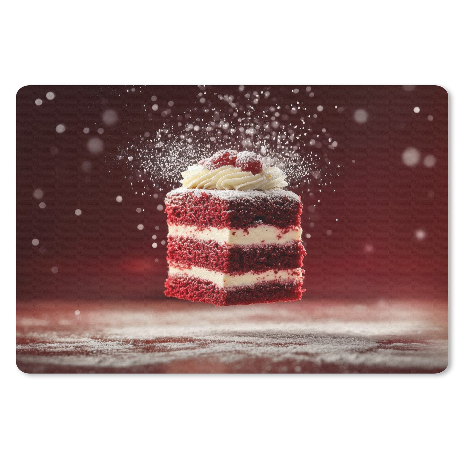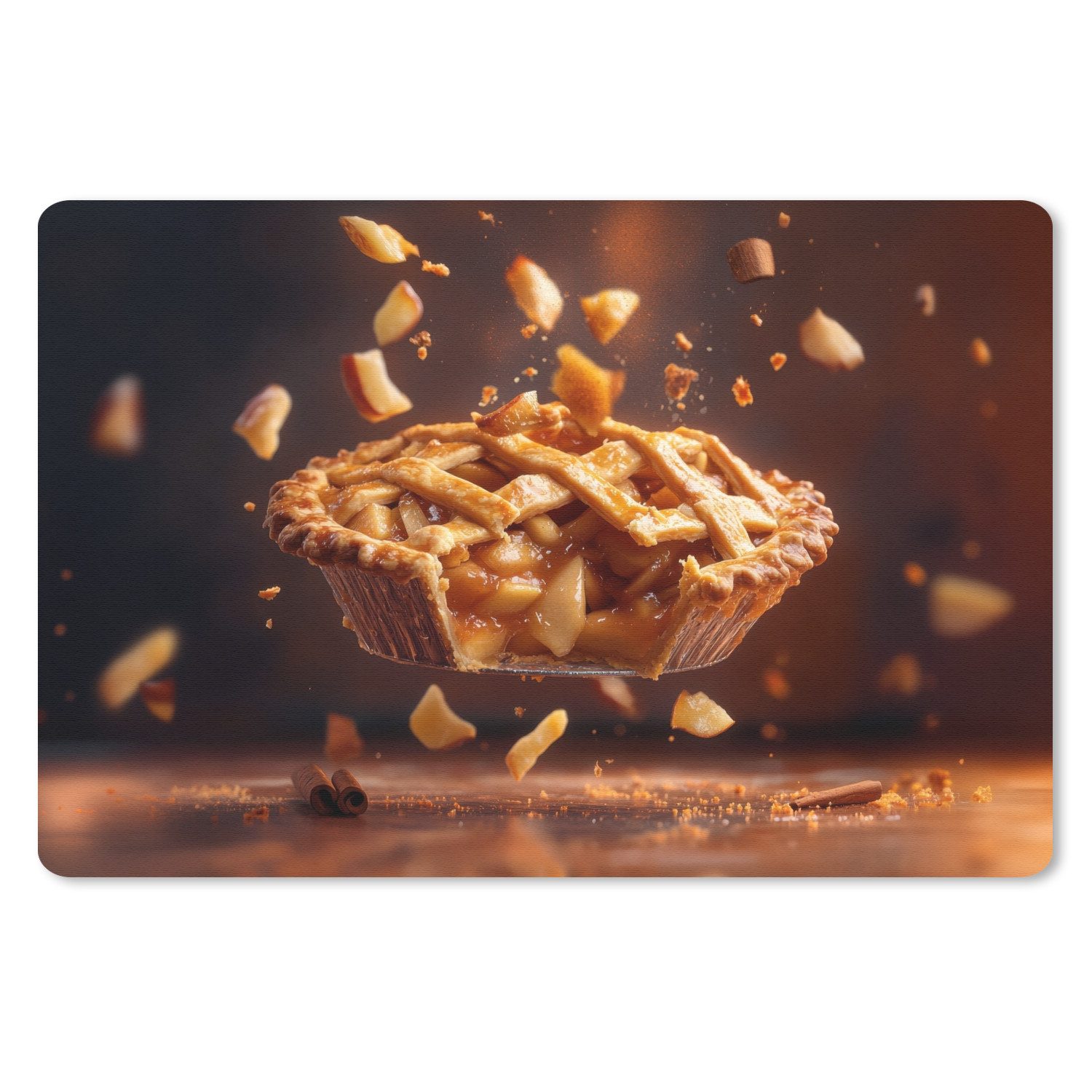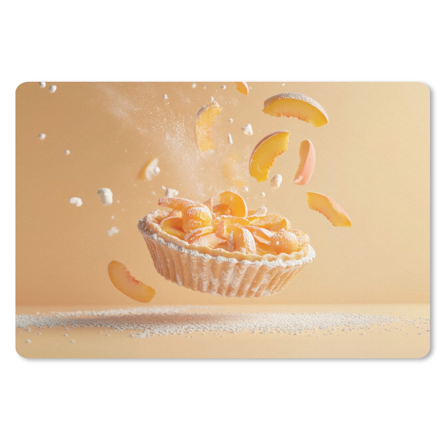Ein zarter Pfirsichkuchen schwebt in einer leichten, luftigen Komposition mit saftigen Pfirsichscheiben und einer feinen Schicht Puderzucker, die sanft herumwirbelt. Der warme pfirsichfarbene Hintergrund unterstreicht die natürlichen Farben und die Frische des Ganzen. Ein raffinierter und sommerlicher Genuss voller Eleganz.