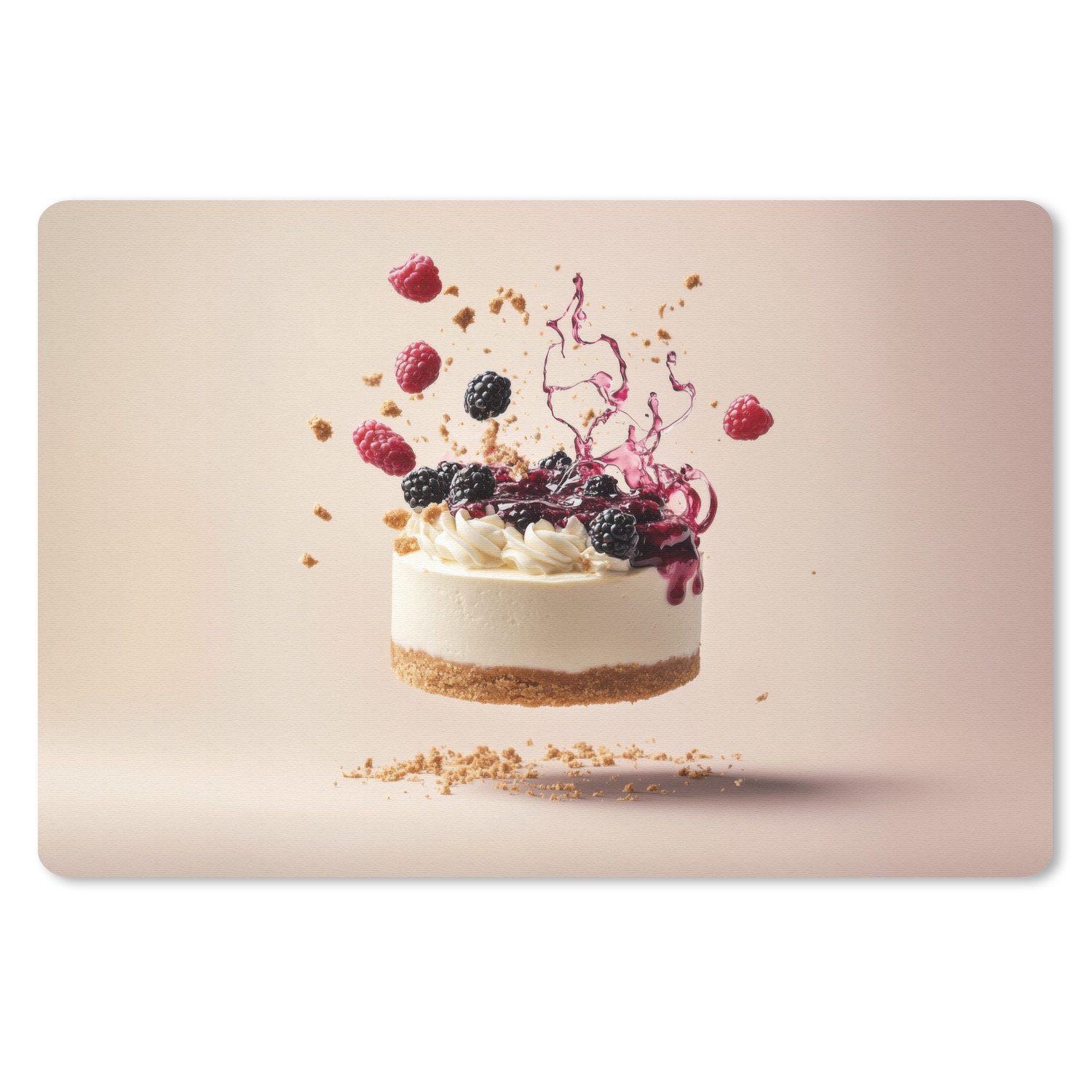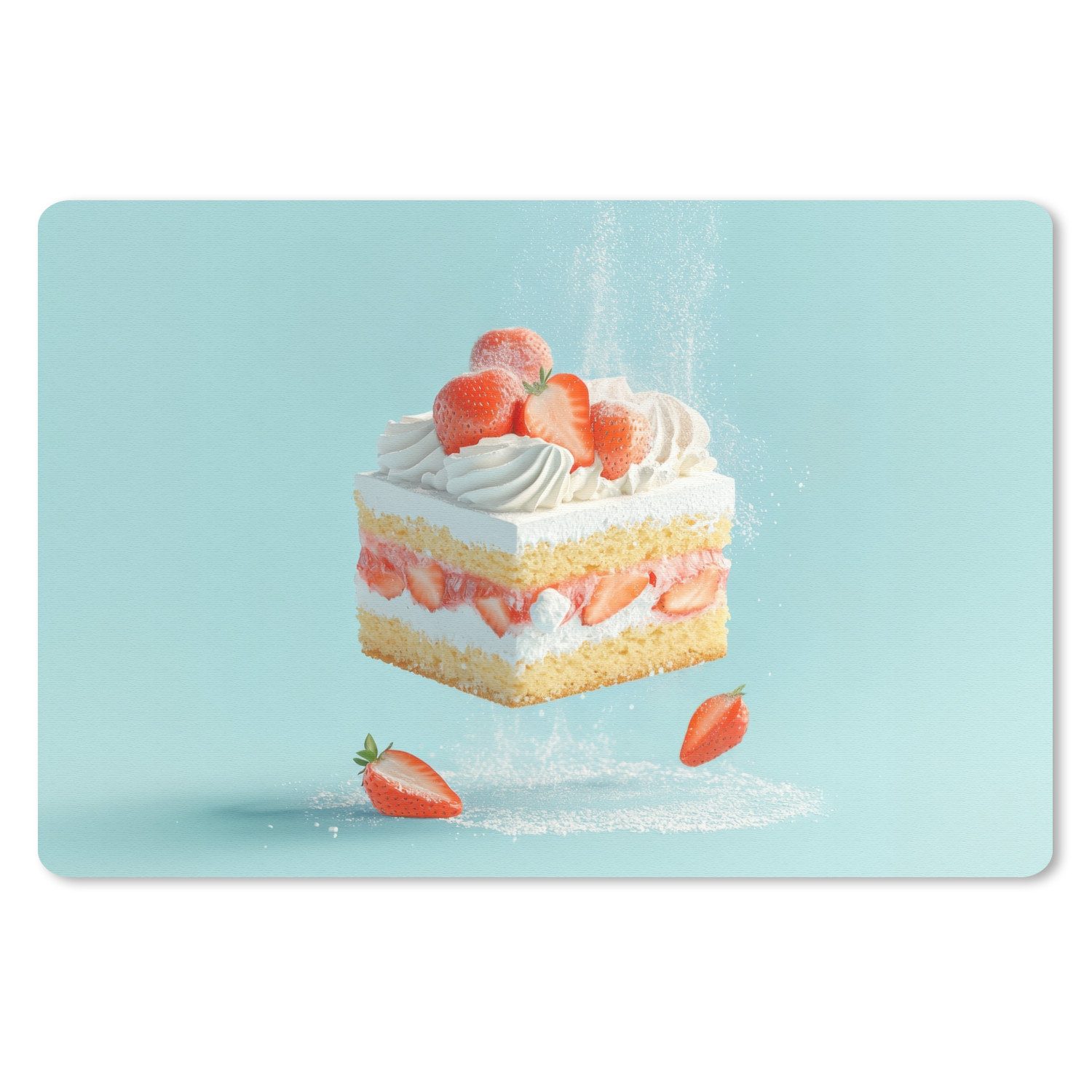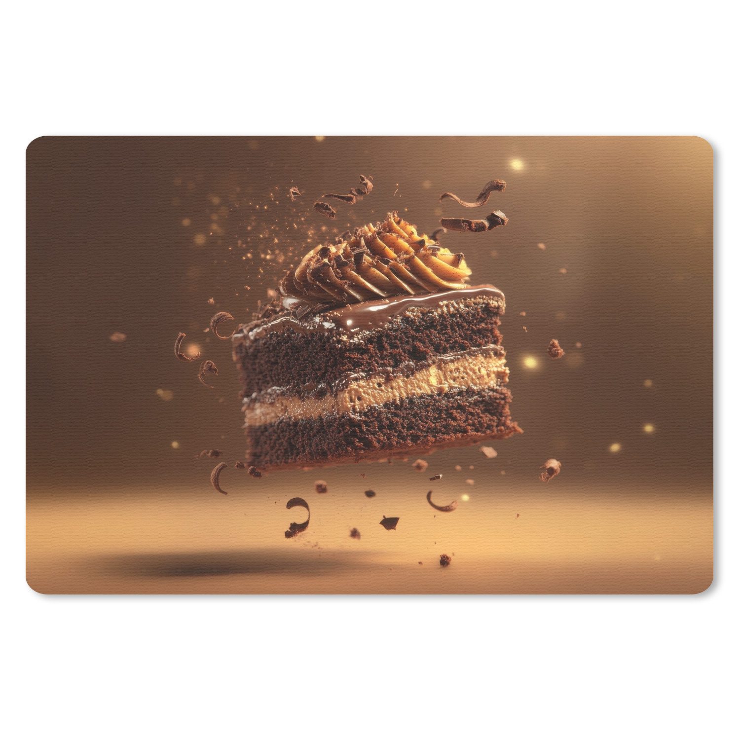 Ein zarter Pfirsichkuchen schwebt in einer leichten, luftigen Komposition mit saftigen Pfirsichscheiben und einer feinen Schicht Puderzucker, die sanft herumwirbelt. Der warme pfirsichfarbene Hintergrund unterstreicht die natürlichen Farben und die Frische des Ganzen. Ein raffinierter und sommerlicher Genuss voller Eleganz.