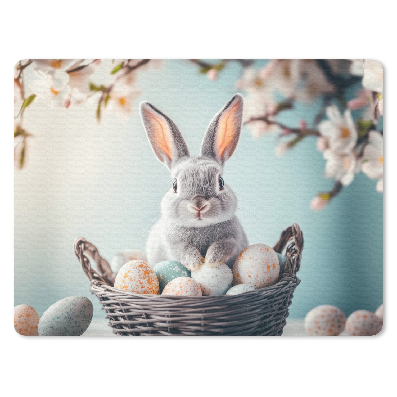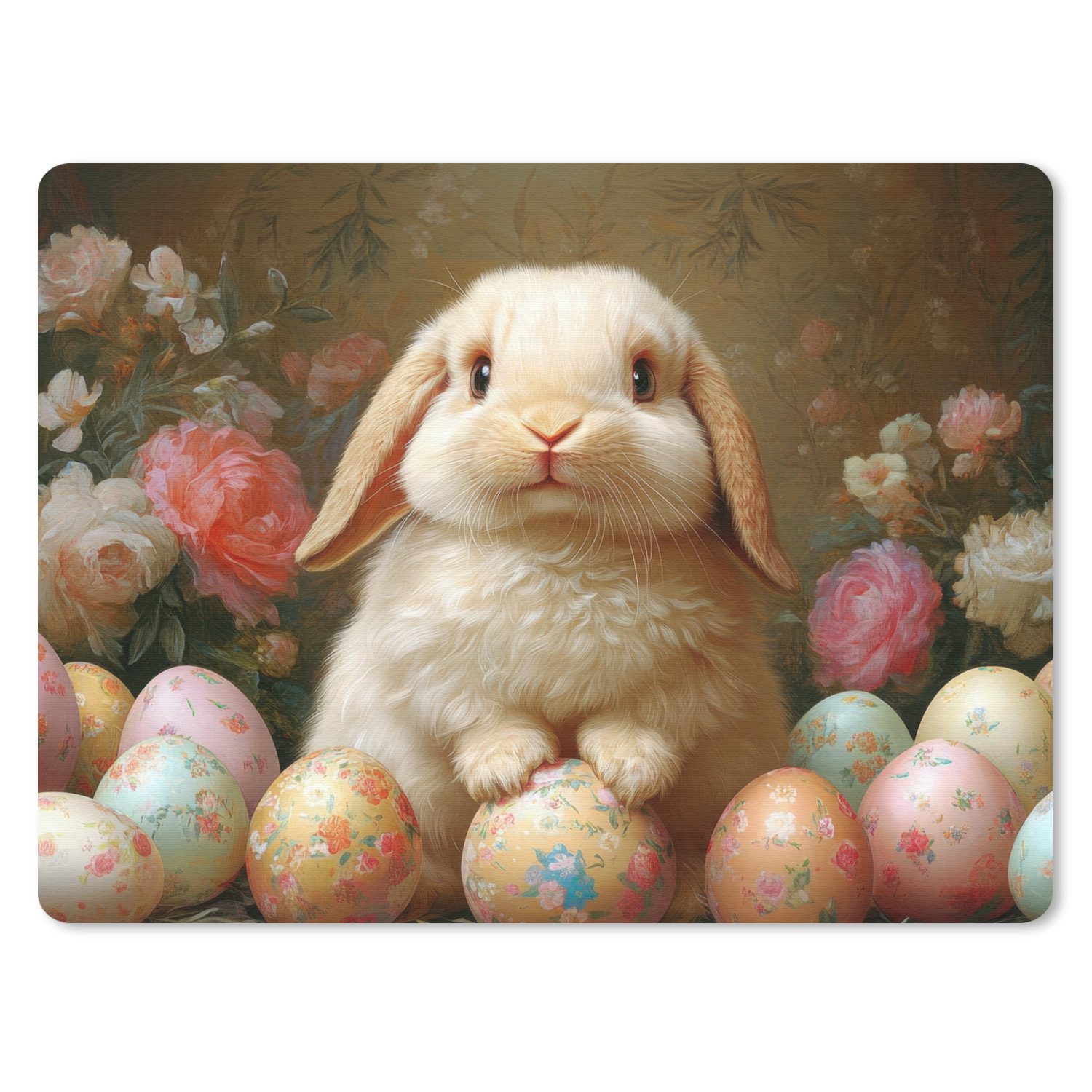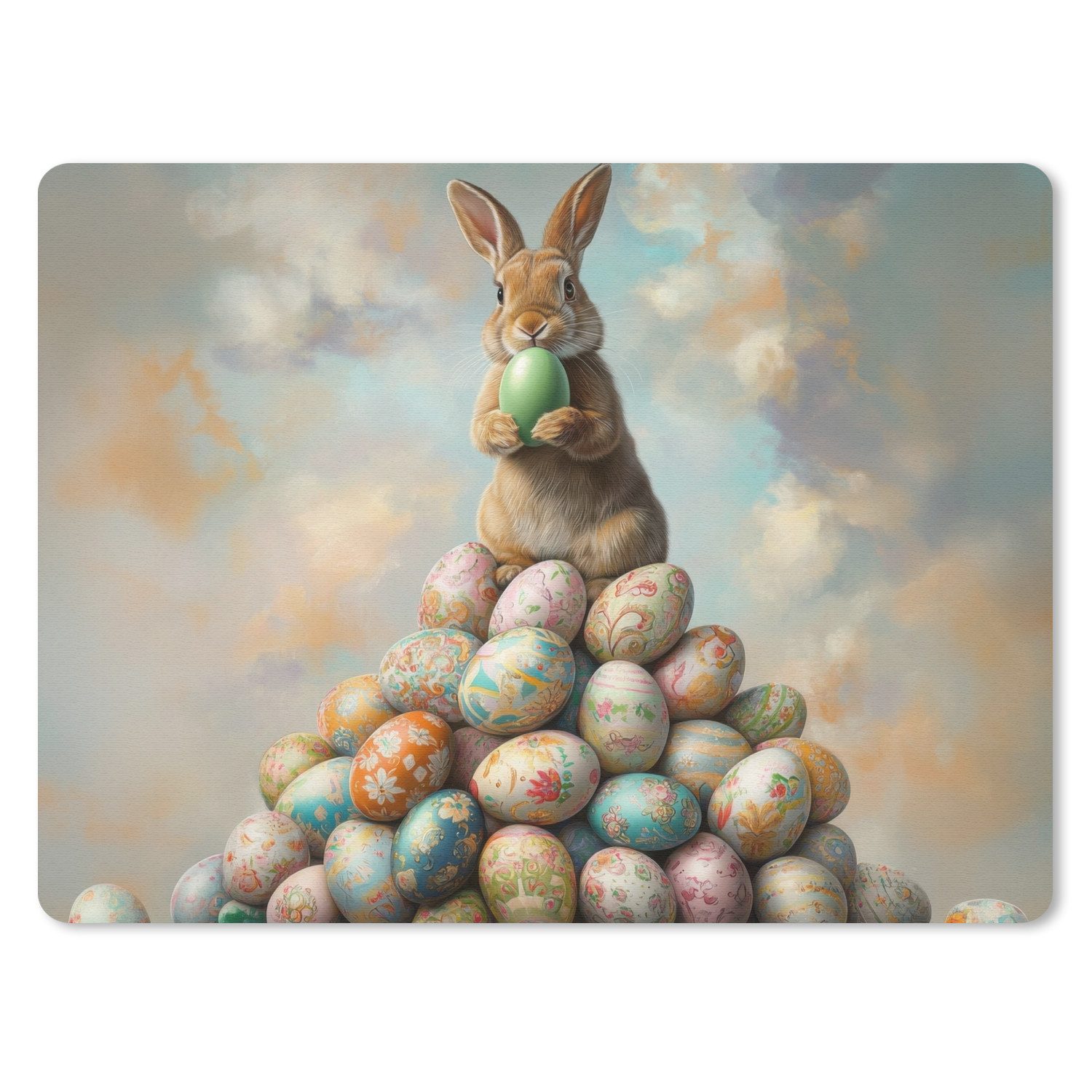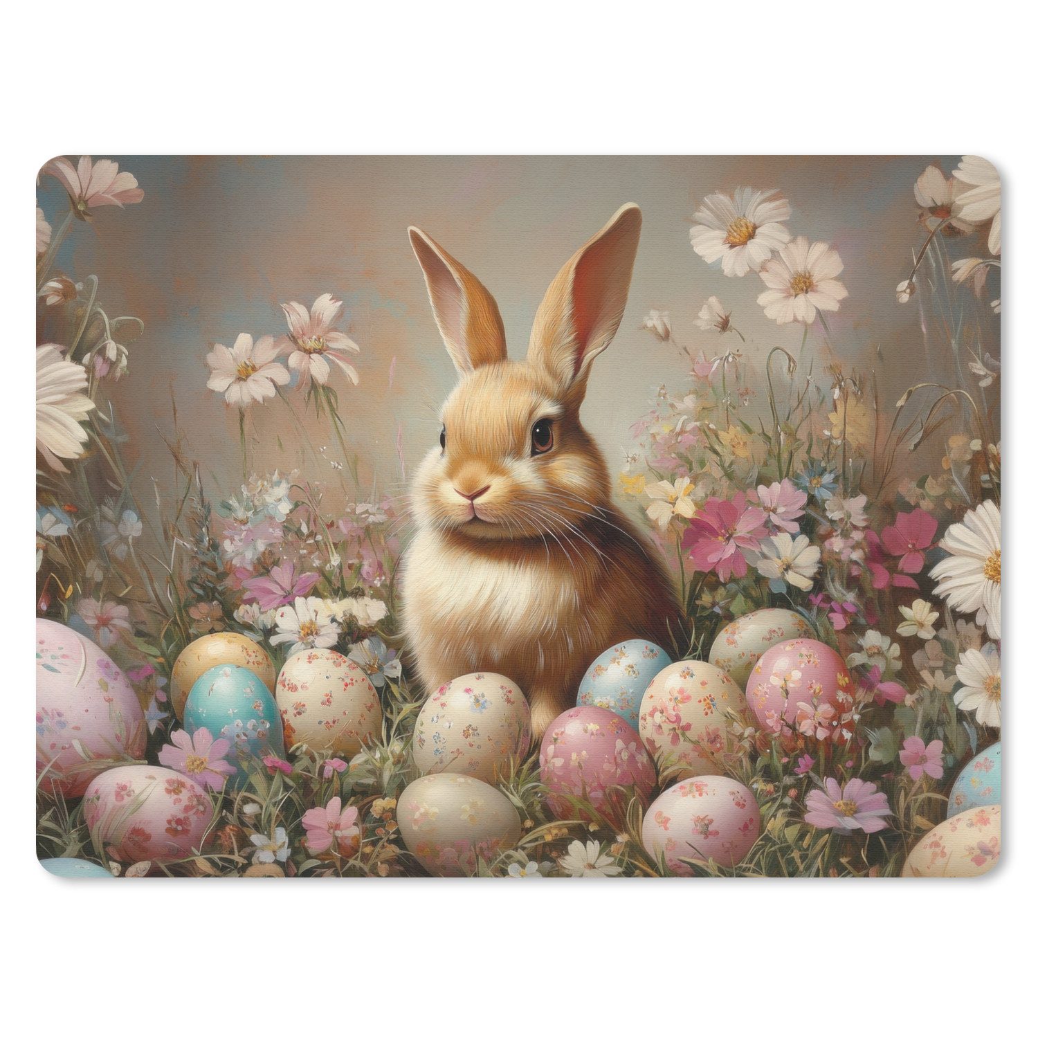 Ein neugieriger Hase sitzt in einem Feld voller bunter Frühlingsblumen und dekorierter Ostereier. Die sanften Pastellfarben und die sonnige Stimmung machen die Szene fröhlich.