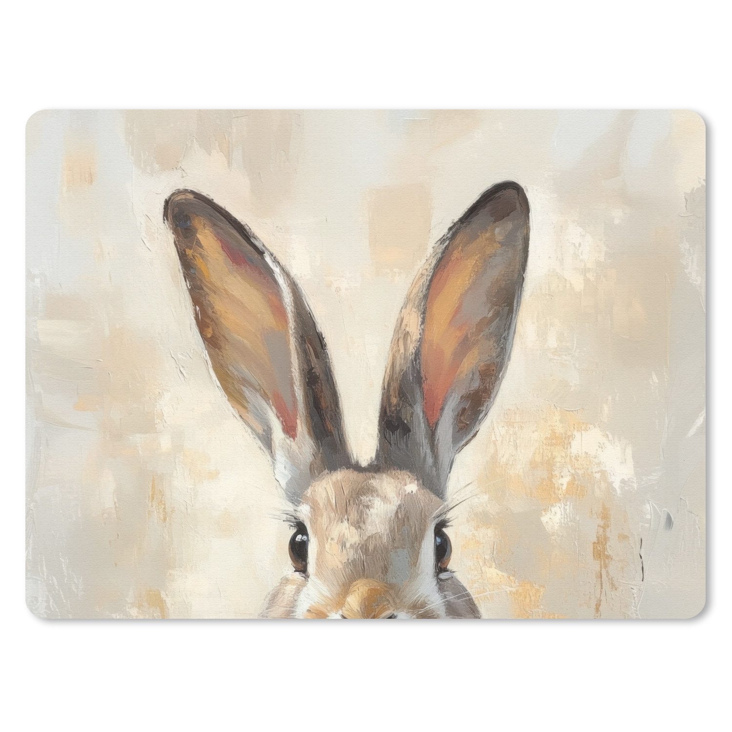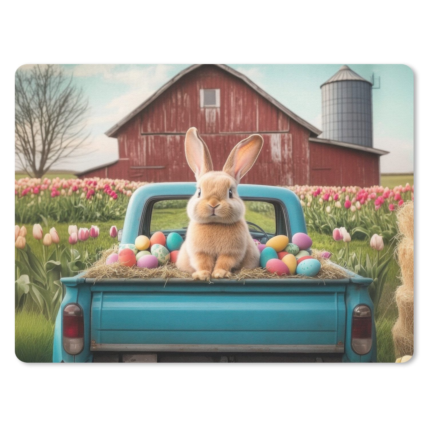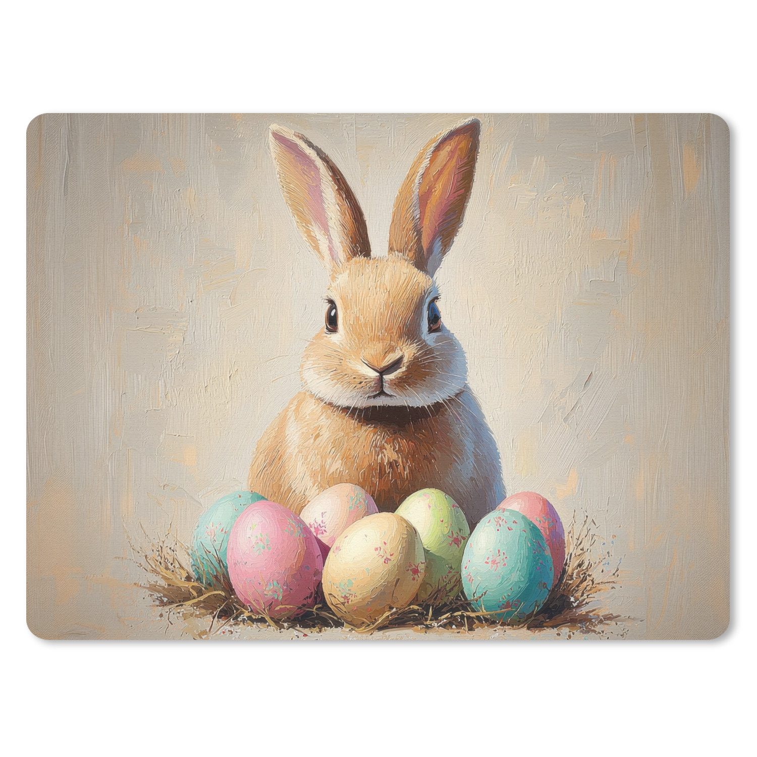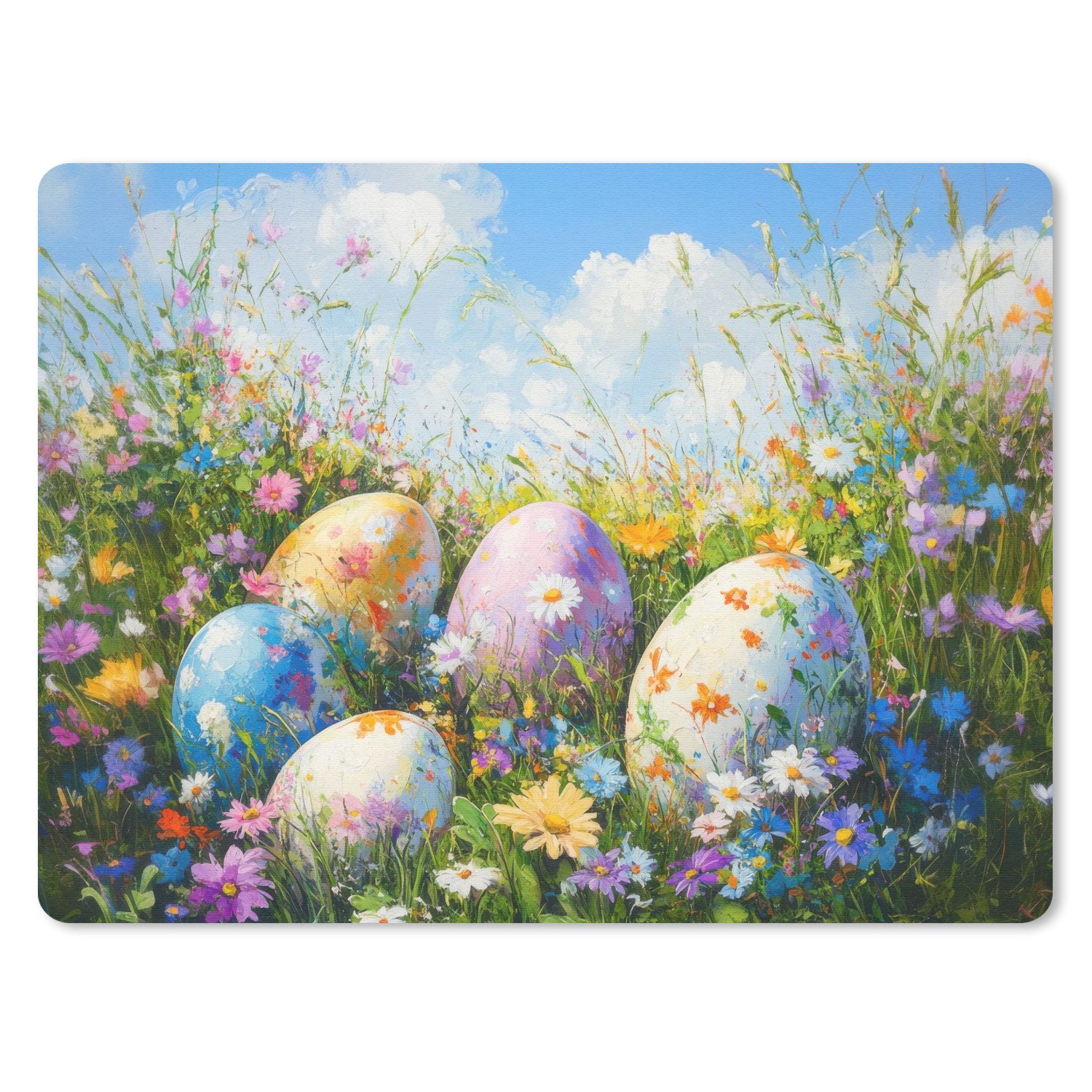 Ein neugieriger Hase sitzt in einem Feld voller bunter Frühlingsblumen und dekorierter Ostereier. Die sanften Pastellfarben und die sonnige Stimmung machen die Szene fröhlich.
