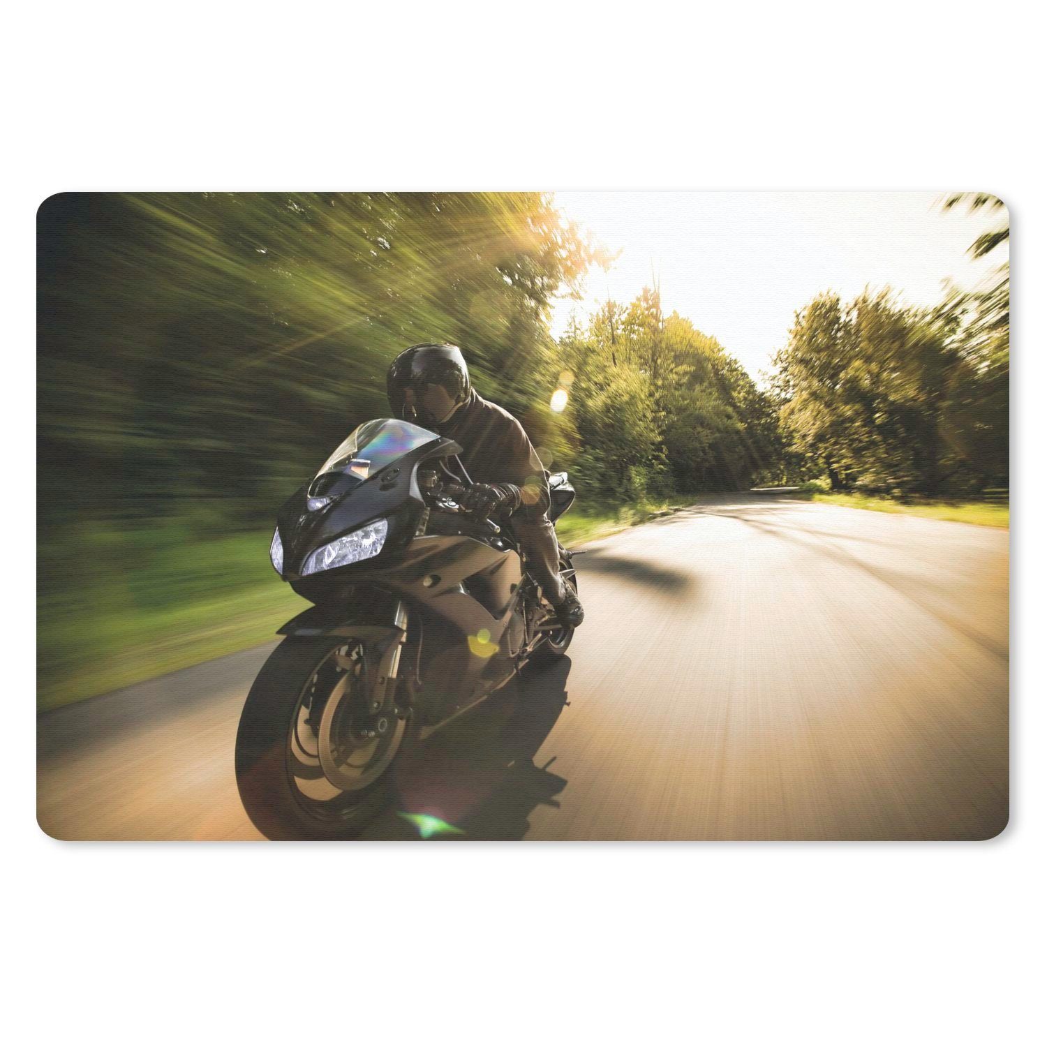 Ein schönes, sportliches Motorrad fährt auf einer asphaltierten Straße zwischen den Bäumen. Das Motorrad fährt sehr schnell und es ist ein perfekter Tag für eine Motorradtour.