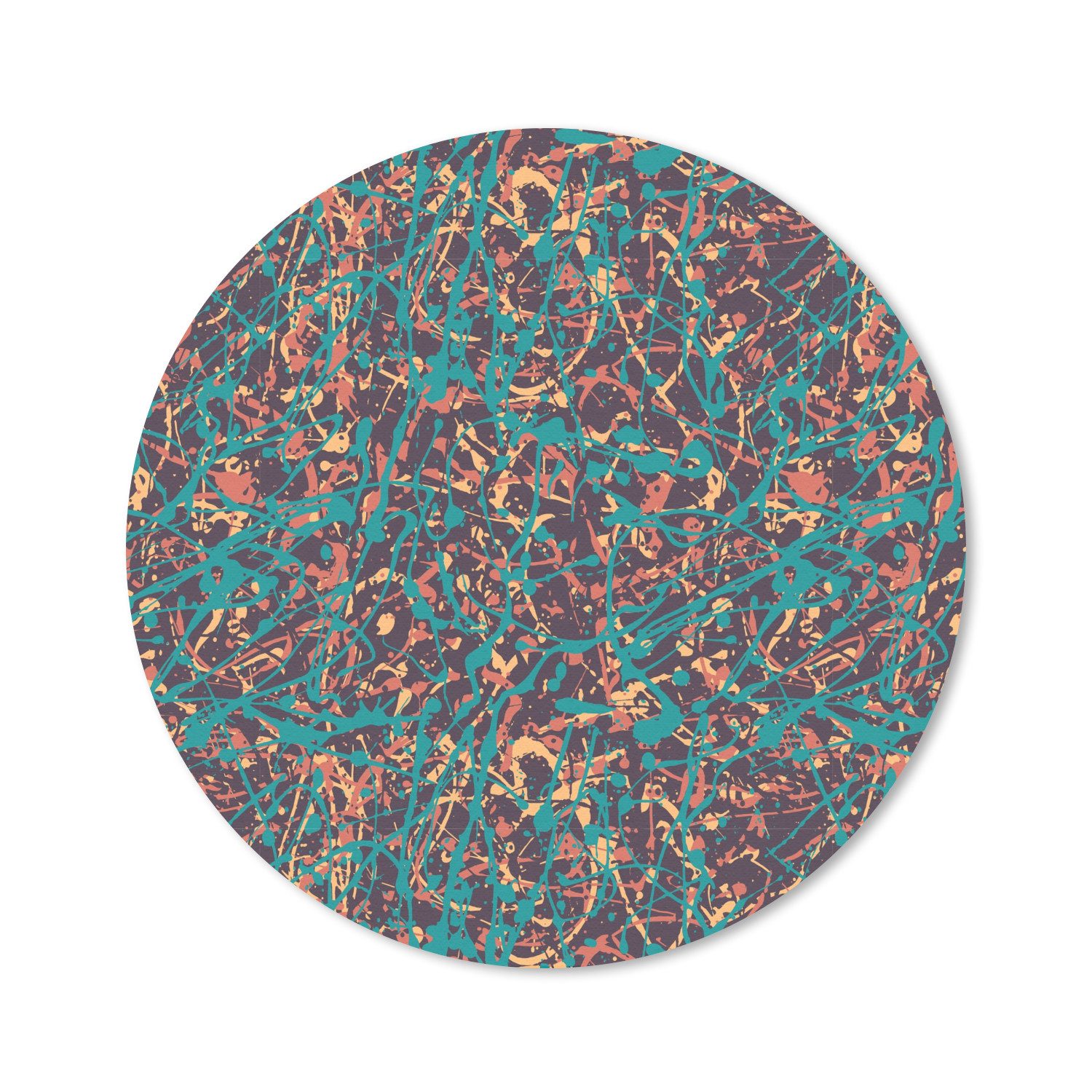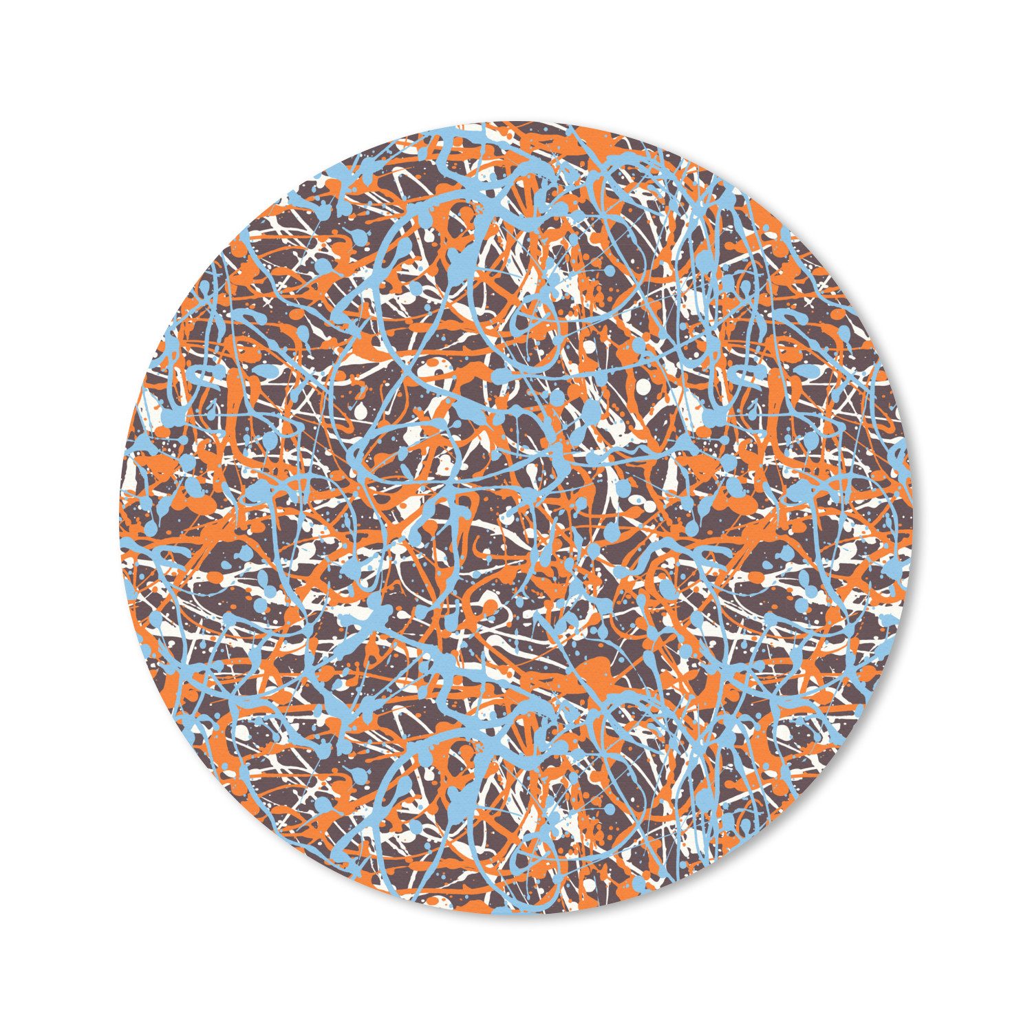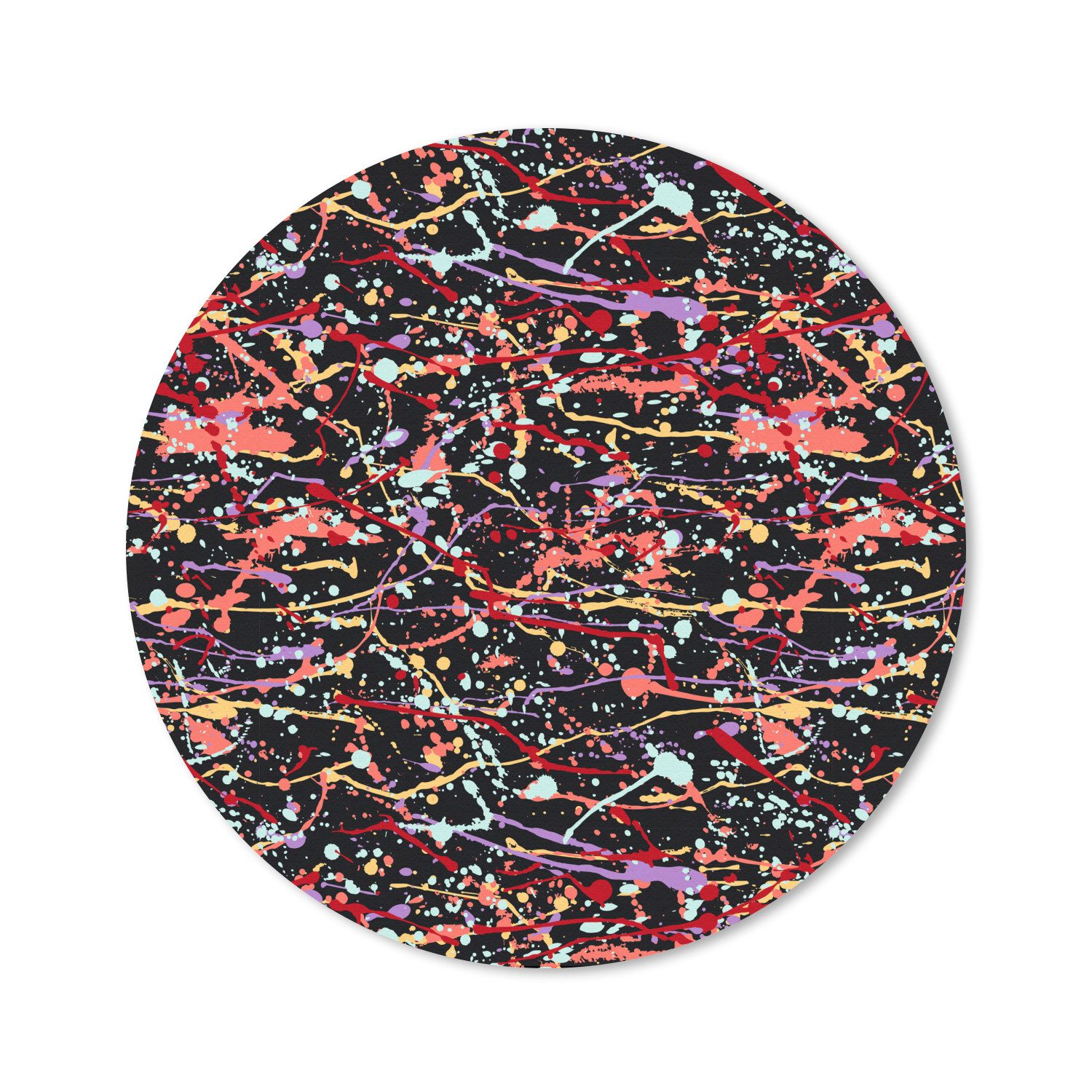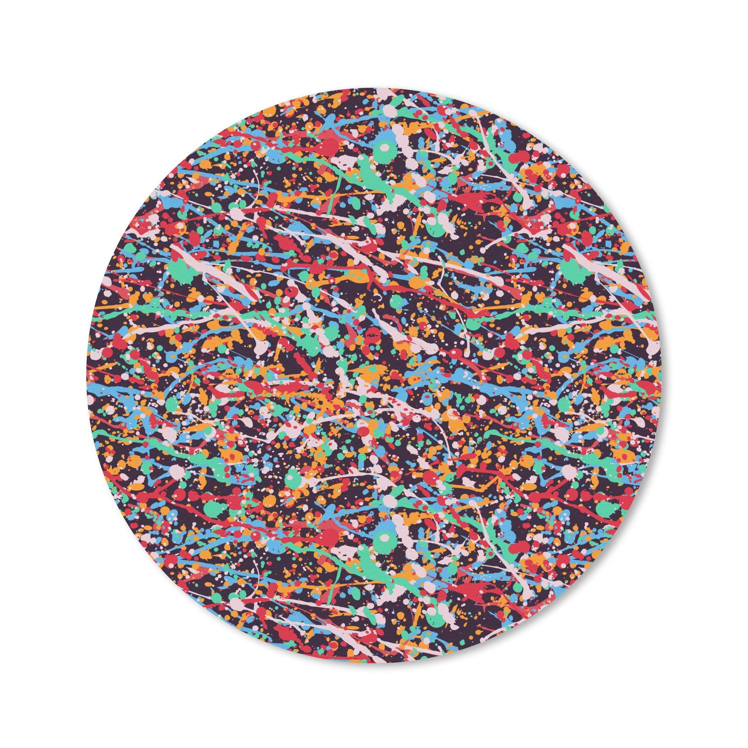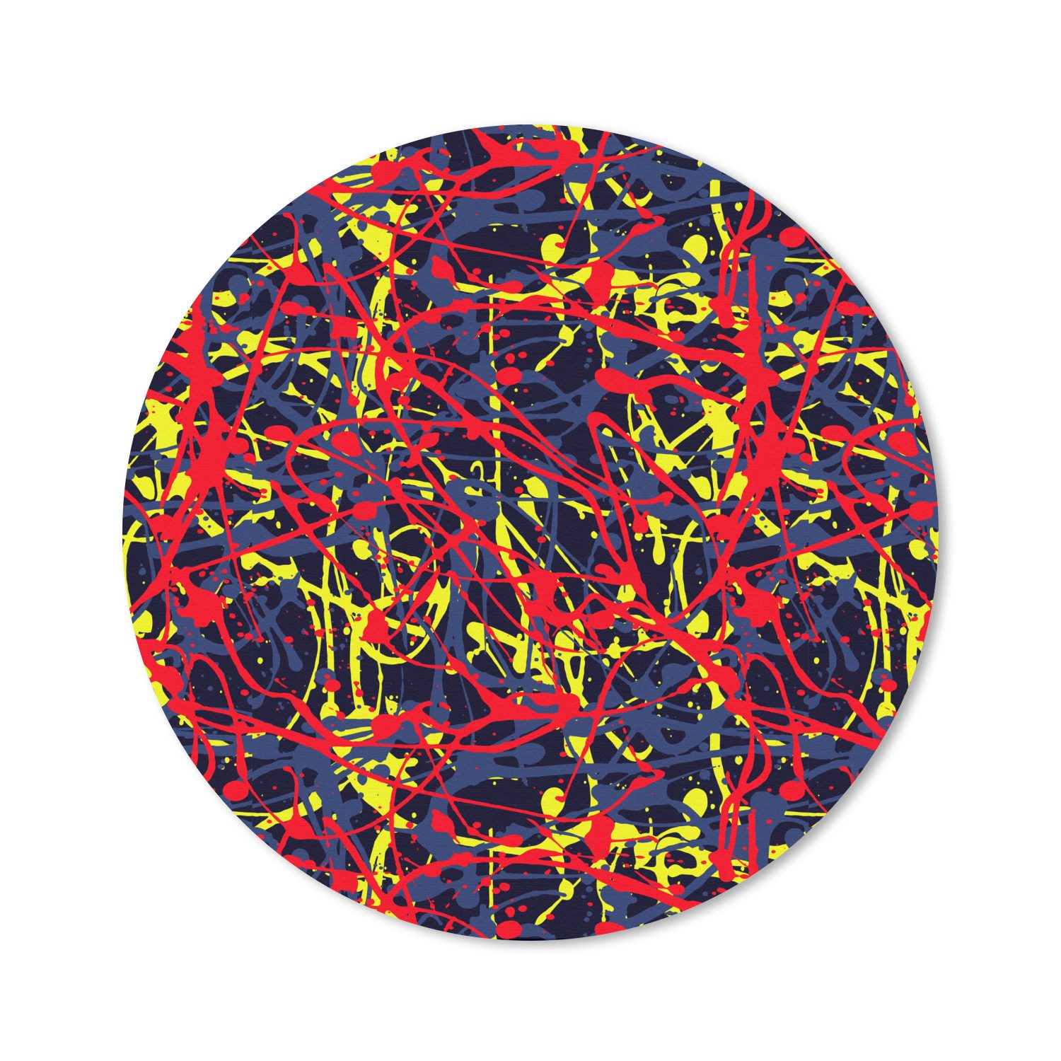 Dicke rote, gelbe und dunkelblaue Farbspritzer und -schlieren überkreuzen sich in gezackten Streifen auf schwarzem Hintergrund. Die Komposition wirkt explosiv und lebendig, wie ein visuelles Echo von Musik oder Energie.