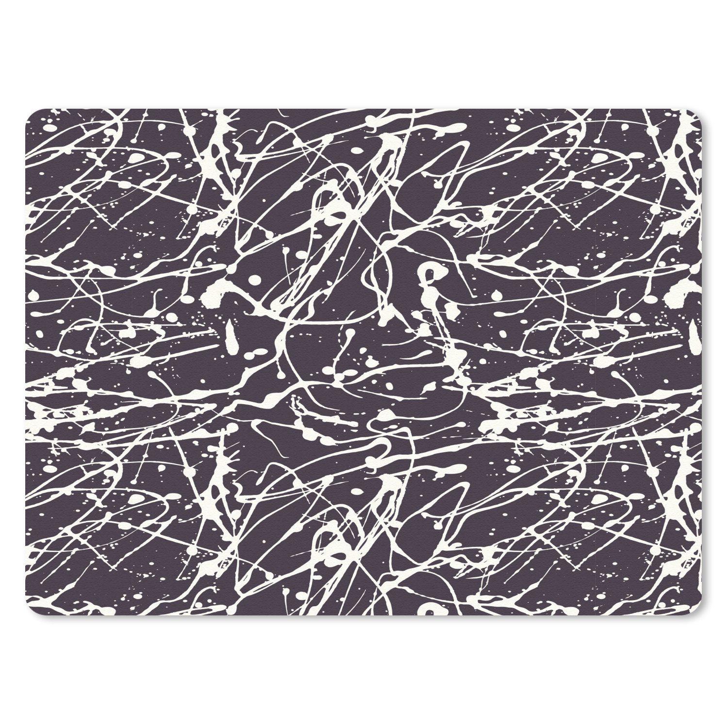 Weiße Farbspritzer, Spritzer und geschwungene Linien tanzen lebhaft über einen dunkelvioletten Hintergrund. Das Muster hat einen energiegeladenen Fluss, der an elektrische Impulse oder abstrakte Blitze in Bewegung erinnert.