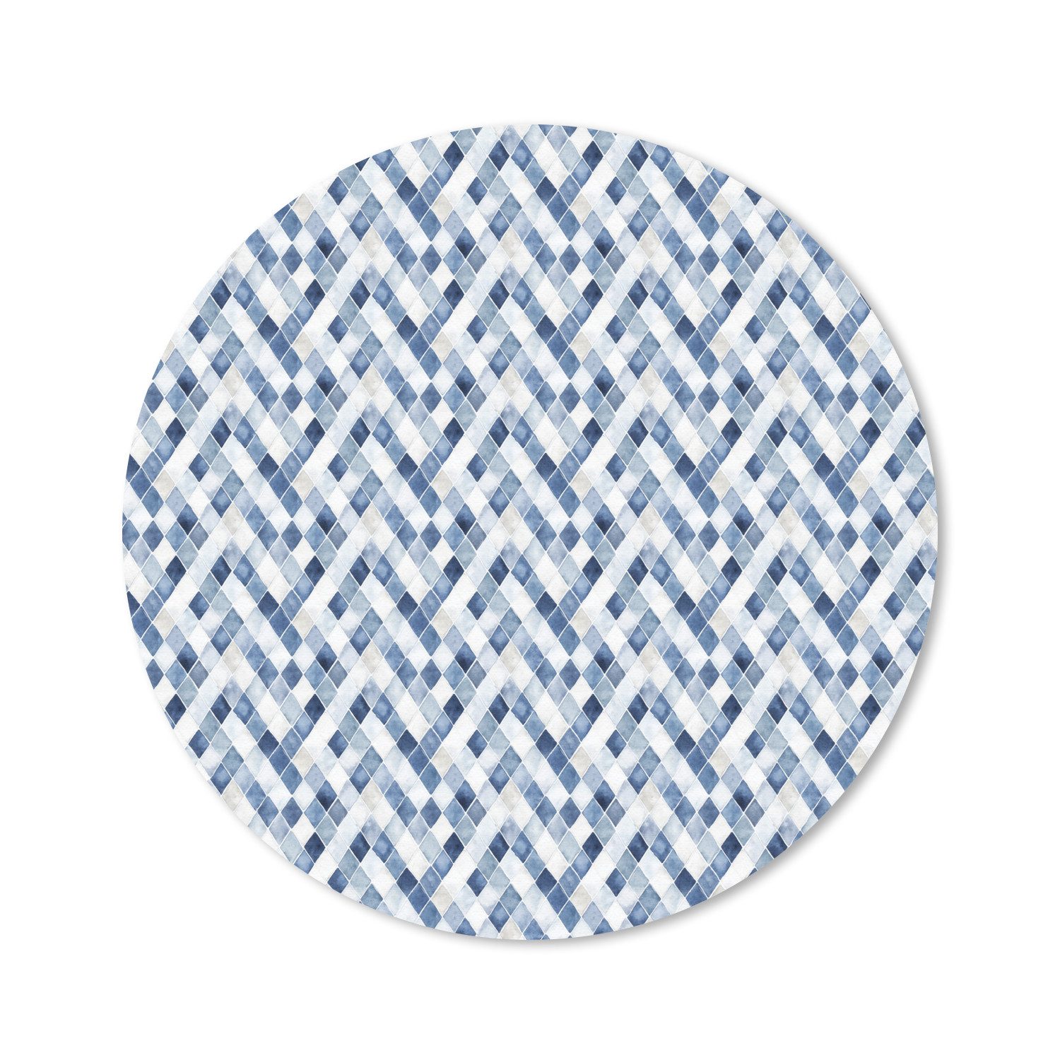 Ein geometrisches Muster aus Quadraten im Aquarellstil, das von tiefem Blau bis zu sanftem Grau reicht. Sich wiederholende diagonale Linien verleihen ihm ein fliesenartiges Aussehen mit einer handgemalten Textur.