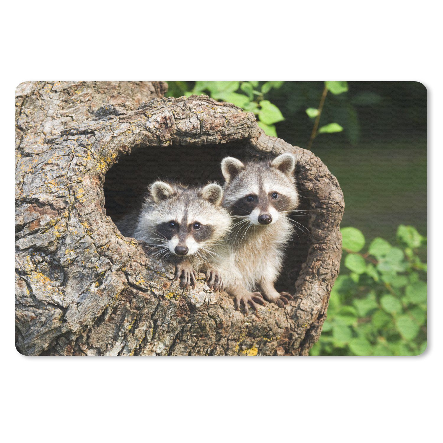Zwei kleine Waschbären sitzen in der Höhle eines Baumes.