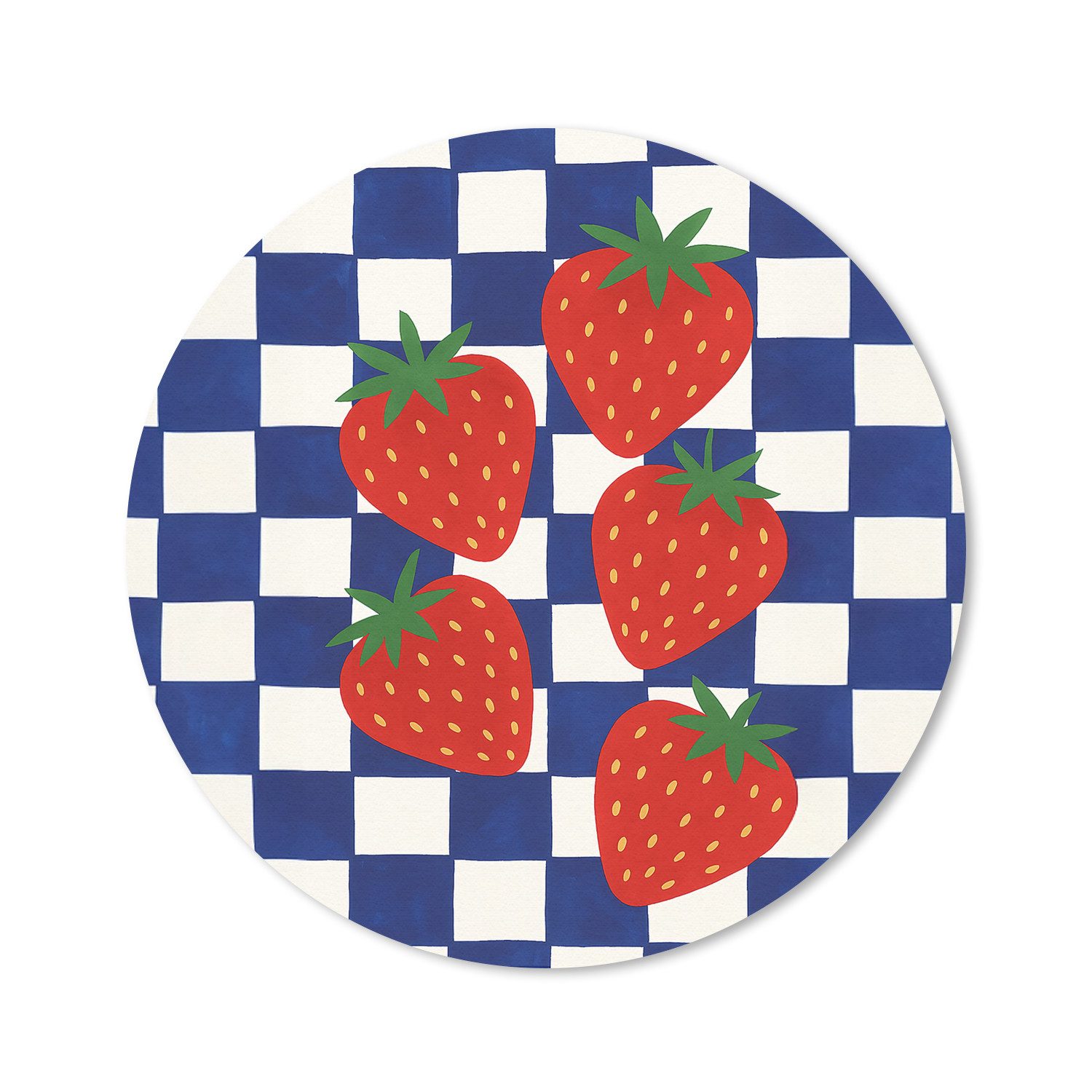 Fünf rote Erdbeeren mit grünen Kronen sind auf einem blau-weiß-karierten Hintergrund verstreut.