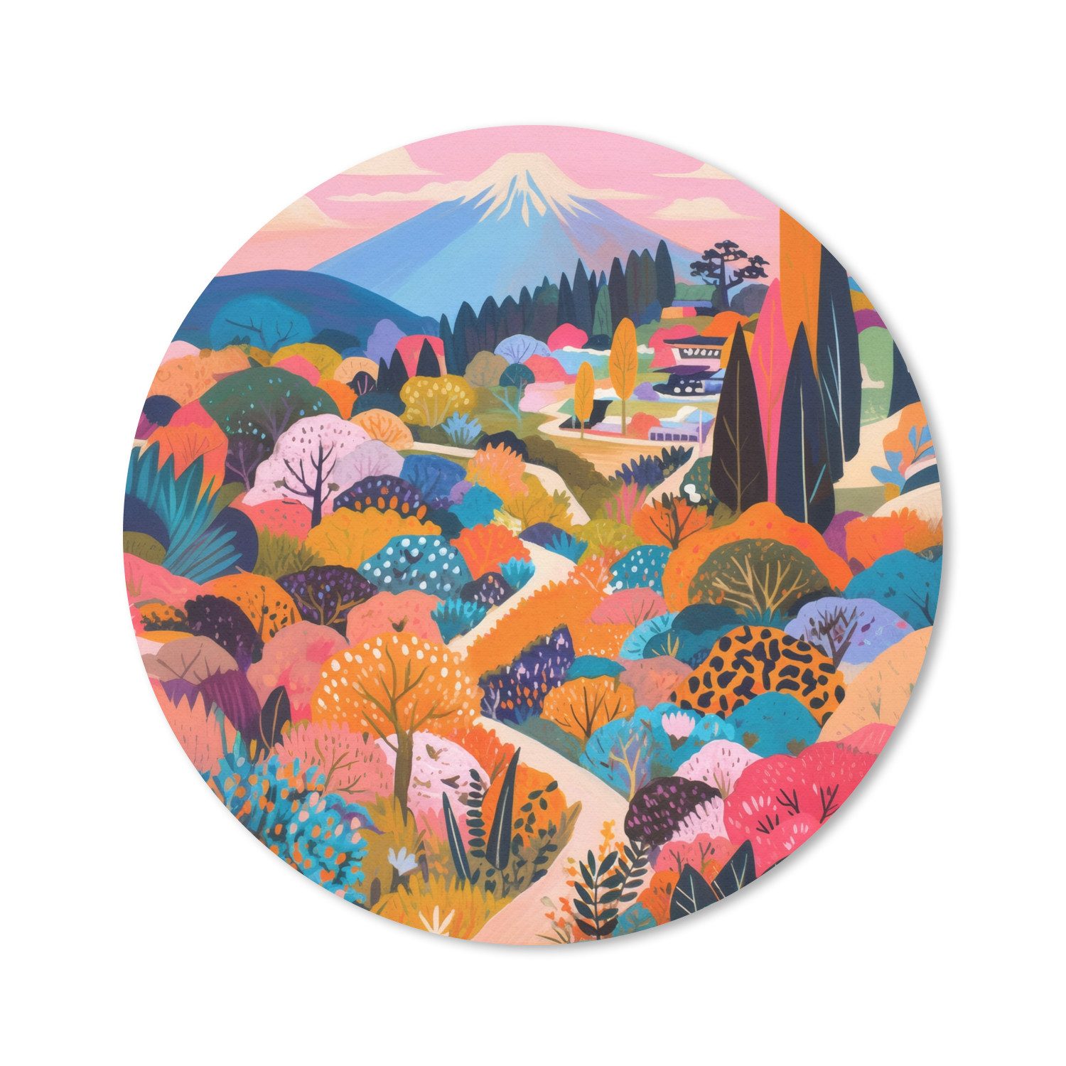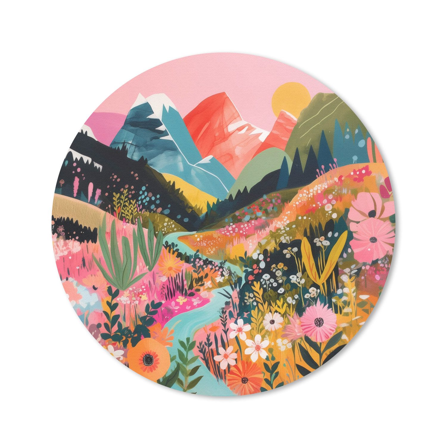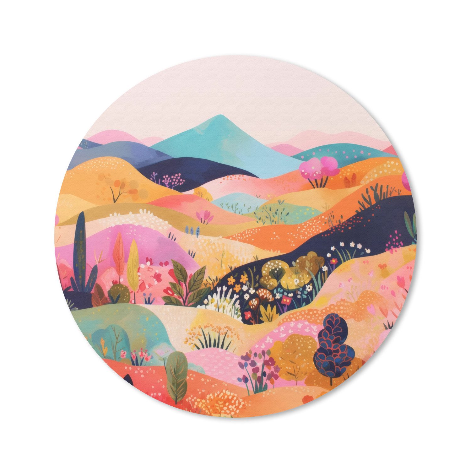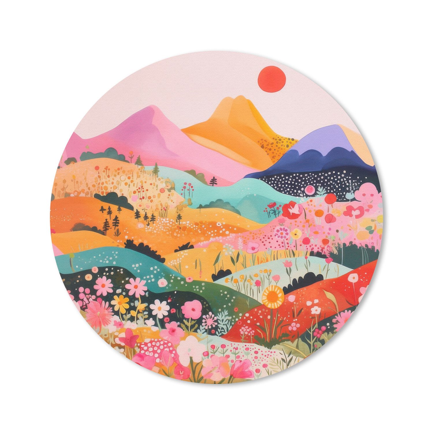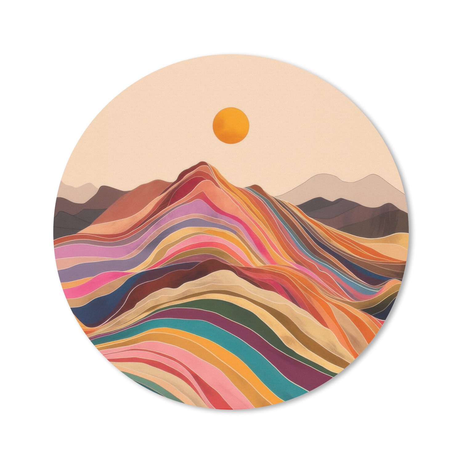 Eine leuchtend orangefarbene Sonne schwebt über abstrakten Bergen in Schichten von Rot, Rosa, Grün und Gelb. Die fließenden Formen und der weiche pastellfarbene Hintergrund schaffen eine surreale und farbenfrohe Landschaft.