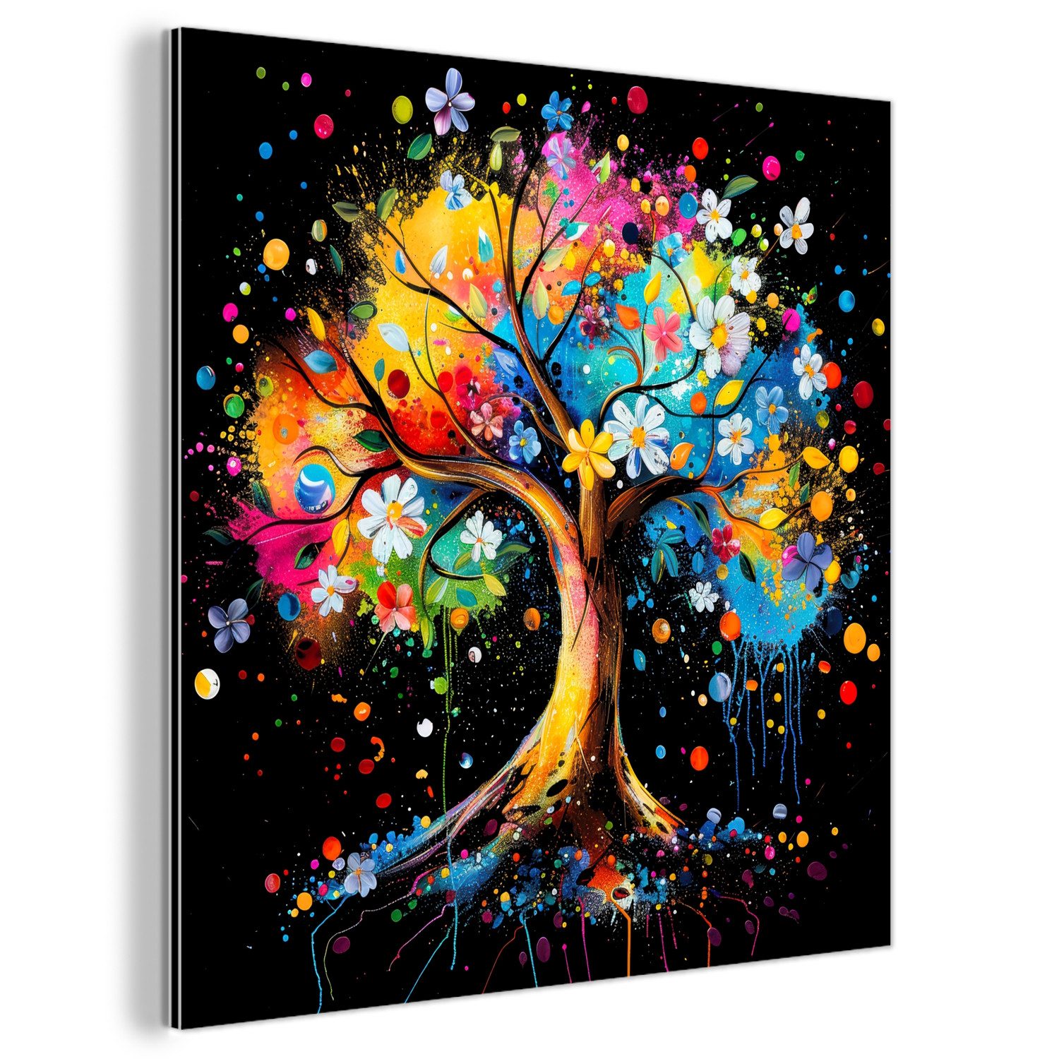 Über das Bild: Ein bunter Baum mit Blumen auf schwarzem Hintergrund.
