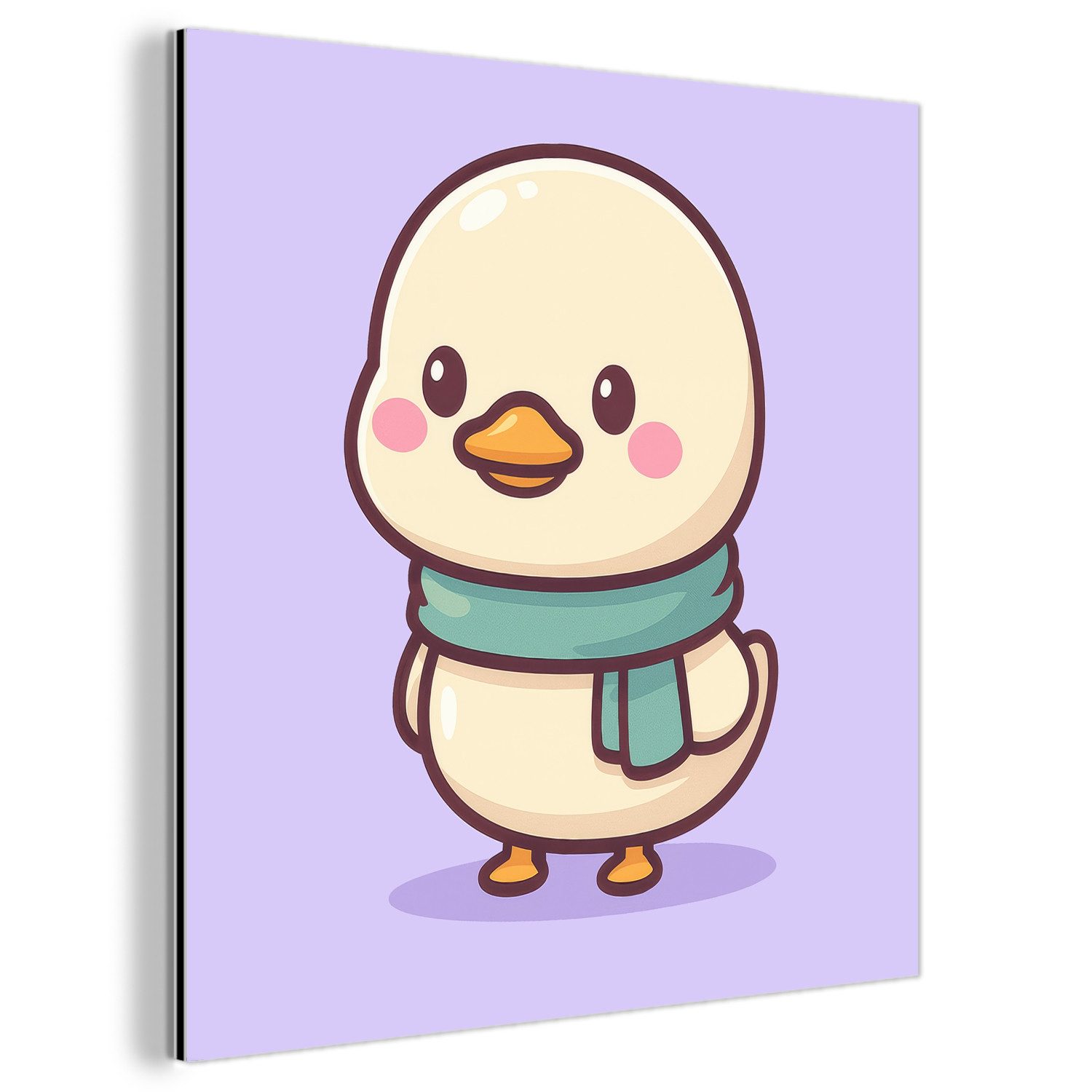Über das Bild: Ein niedliches stehendes Entlein mit runden Formen und rosa Wangen trägt einen blauen Schal. Die Figur steht auf einem lila Hintergrund und sieht freundlich und winterlich gekleidet aus.