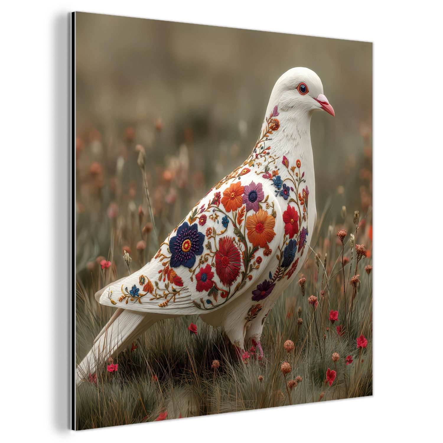 Über das Bild: Eine weiße Taube steht inmitten von Gras und roten Feldblumen. Ihr Gefieder ist mit bunten Blumenmustern in Rot, Orange, Blau und Violett verziert. Die zierlichen Blumen scheinen auf ihren Körper gestickt zu sein. Der weiche Hintergrund verleiht der Szene eine verträumte und friedliche Atmosphäre.