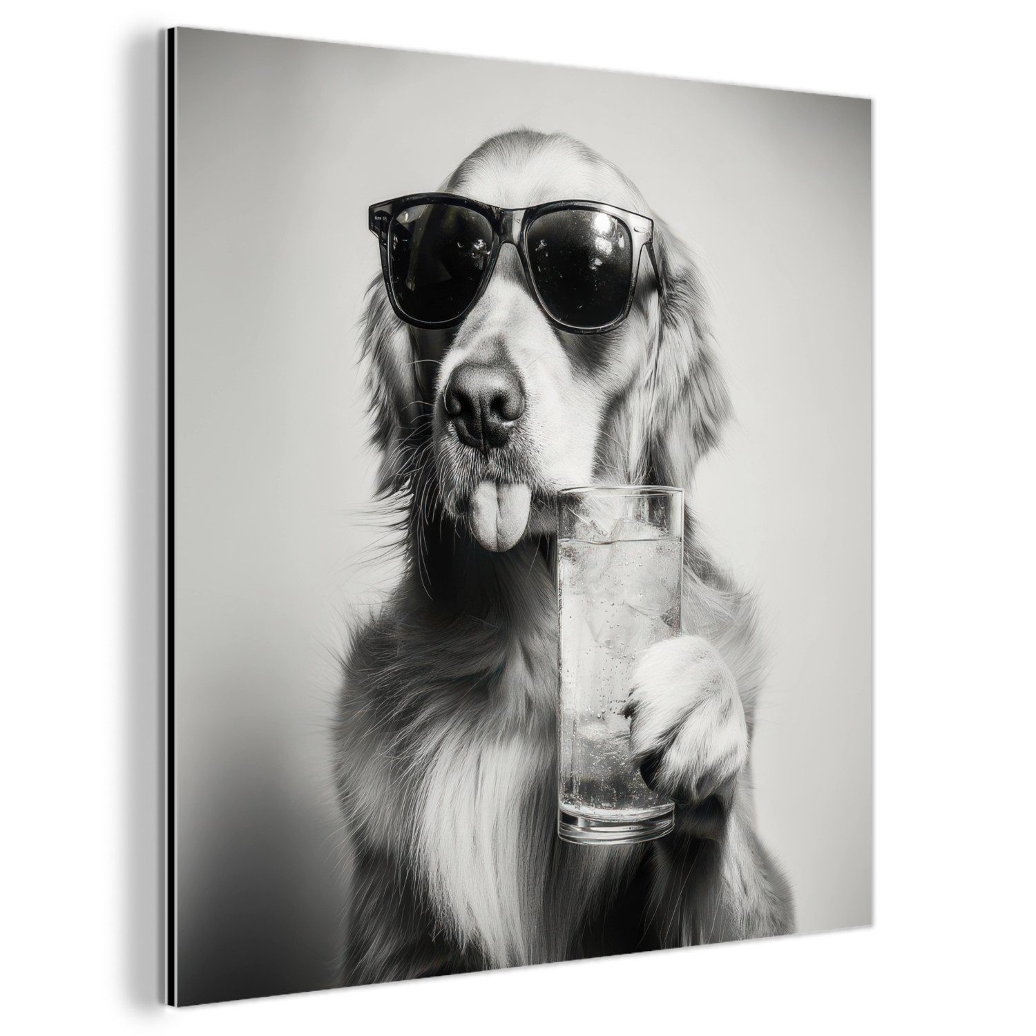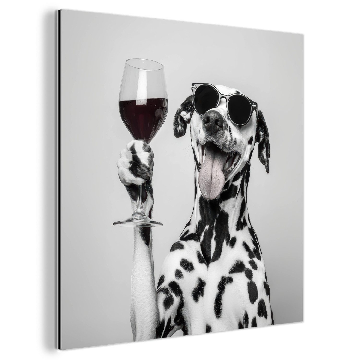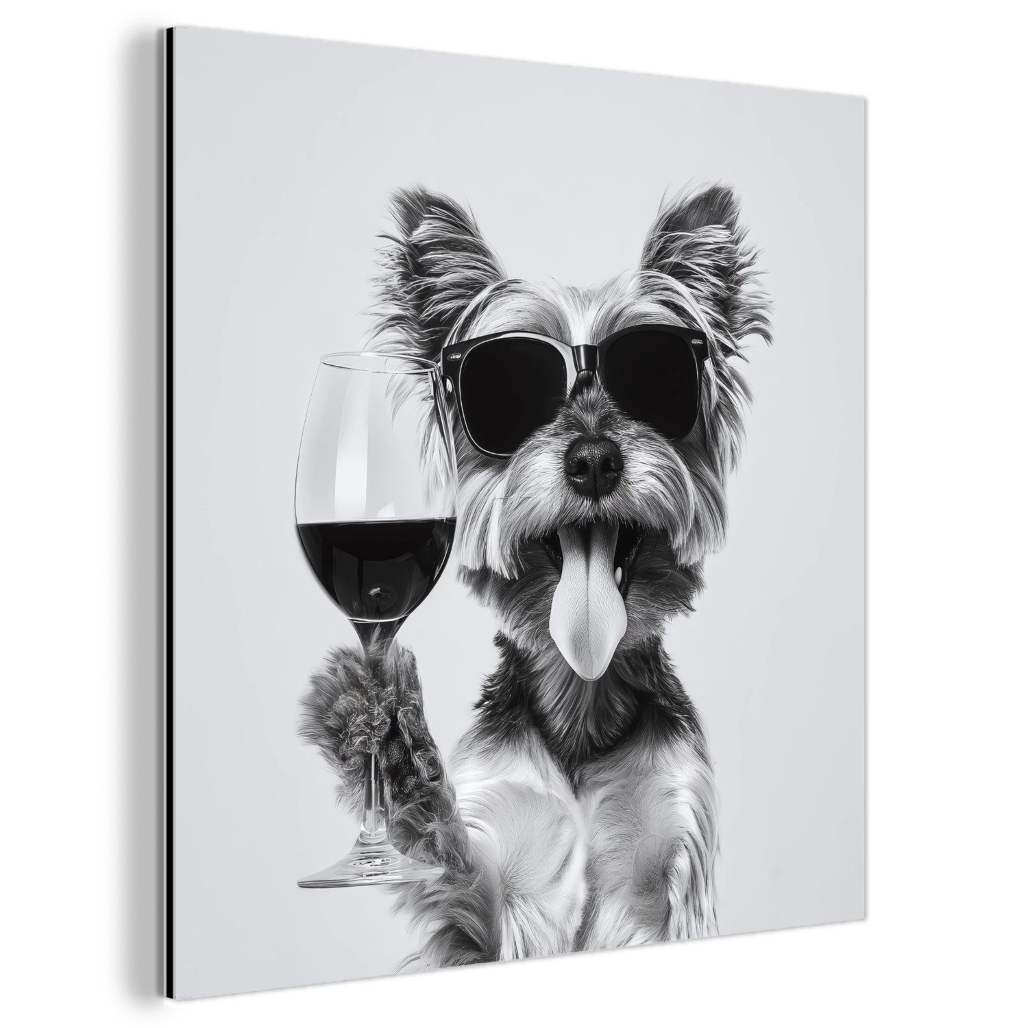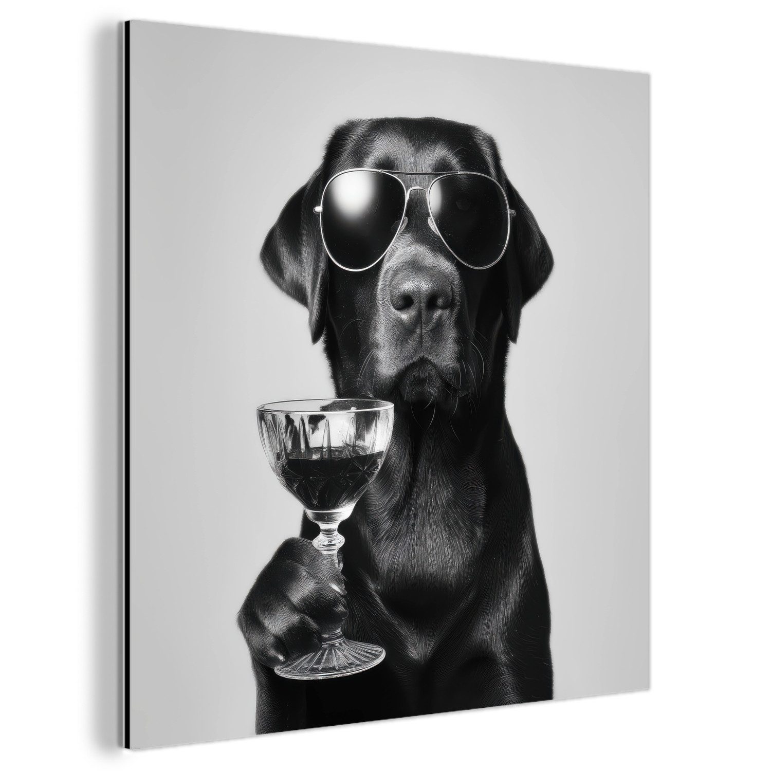Über das Bild: Ein schwarzer Hund mit Sonnenbrille hält elegant ein Weinglas und starrt selbstbewusst in die Kamera.