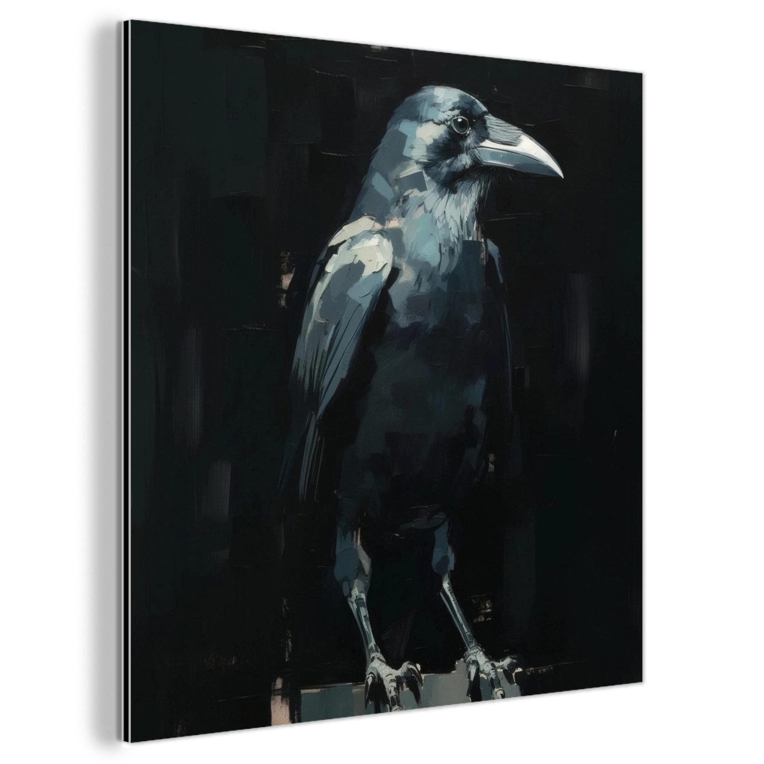 Über das Bild: Ein in Blau- und Schwarztönen gehaltener Rabe steht vor einem fast völlig dunklen Hintergrund.