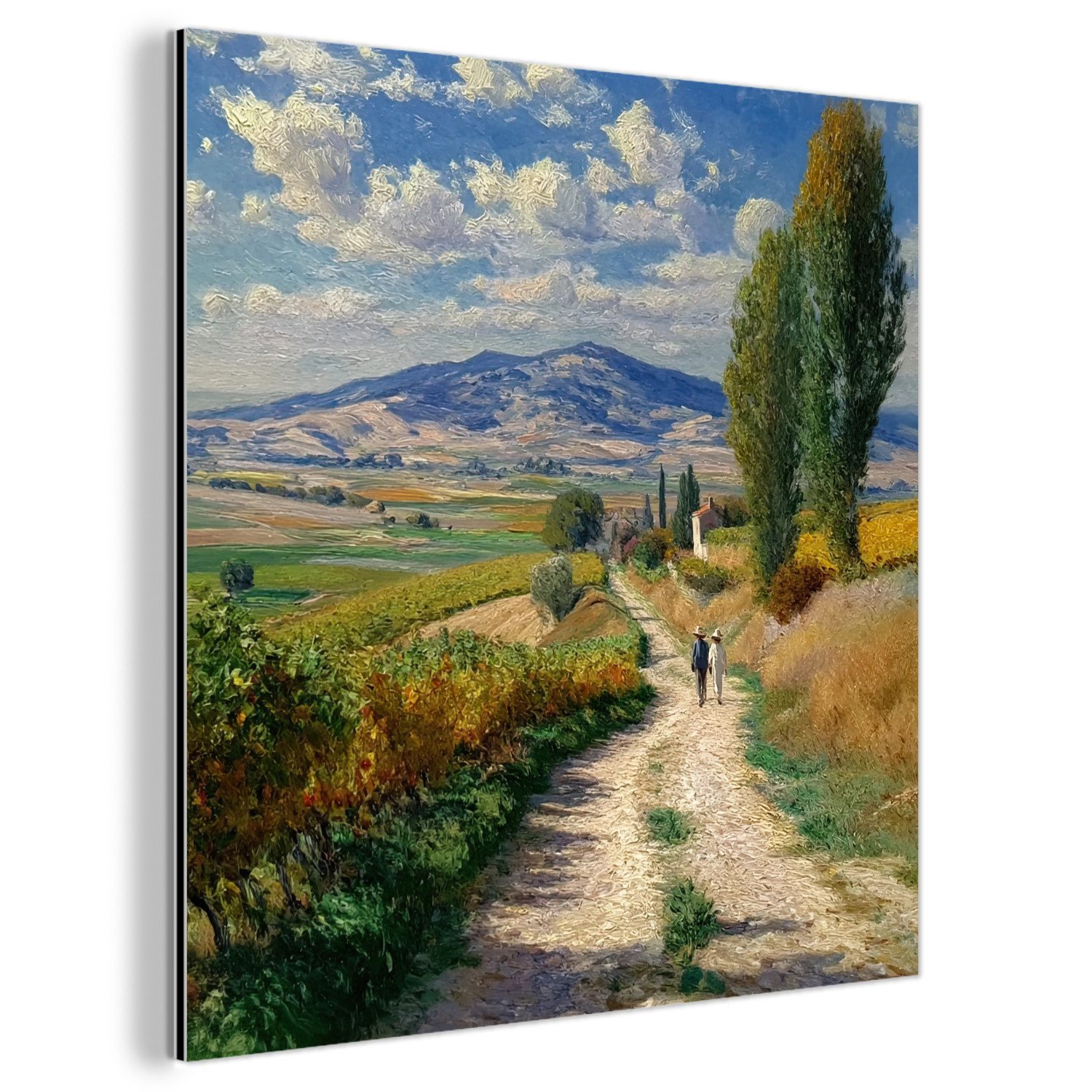 Über das Bild: Zwei Gestalten gehen einen staubigen Weg zwischen Weinreben und Feldern entlang. Der Himmel ist klar mit Wolken über sanften Hügeln.