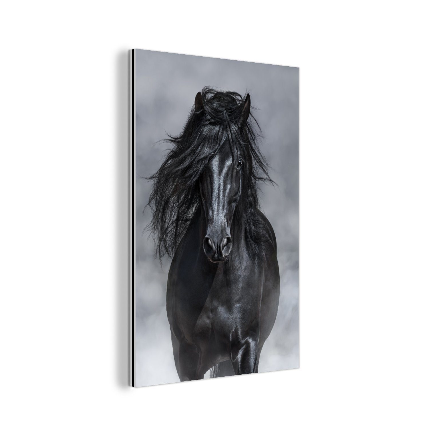 Über das Bild: Ein schwarzes andalusisches Pferd kommt durch den grauen Rauch gerannt.