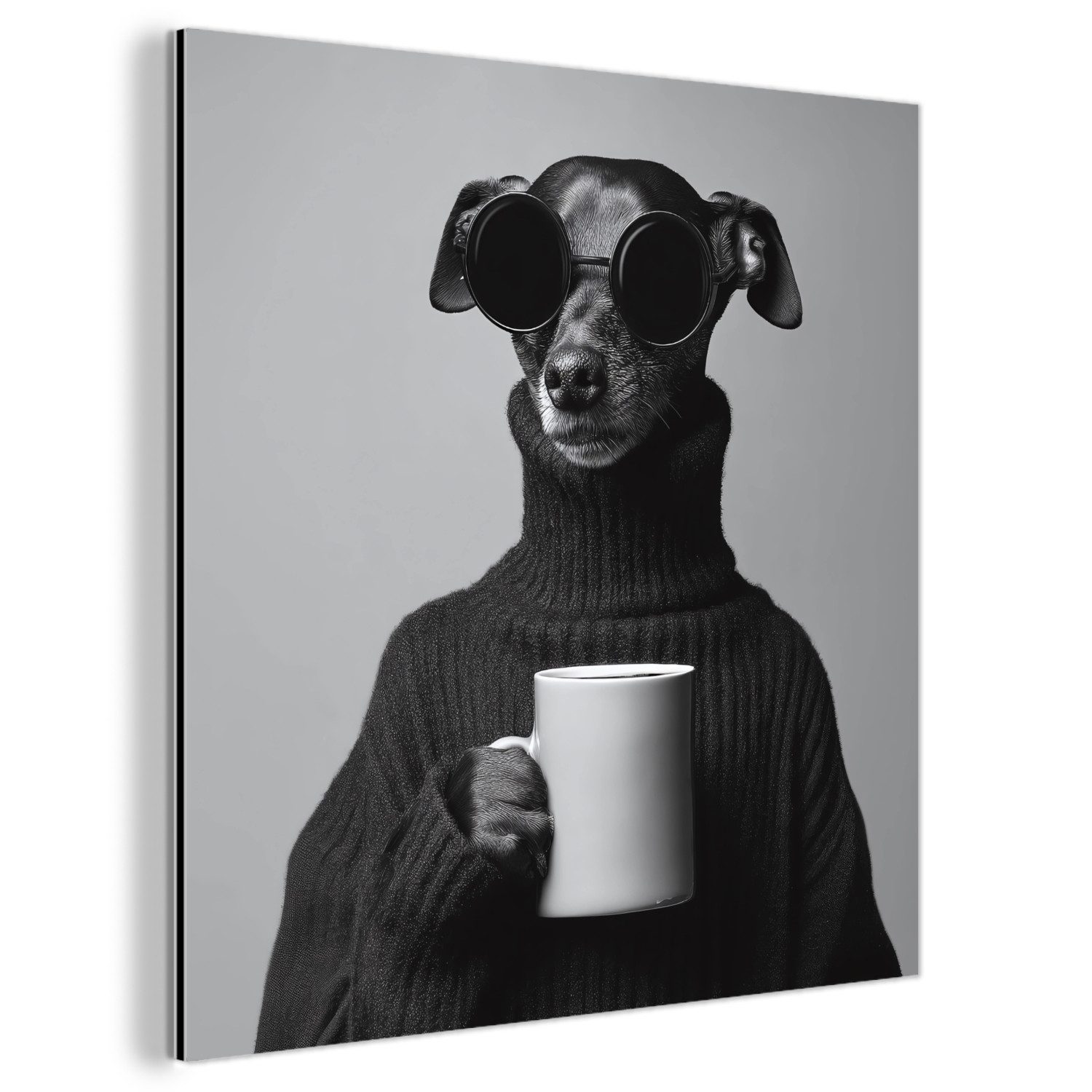 Über das Bild: Ein kleiner Hund in einem dicken Rollkragenpullover und einer runden Brille hält einen weißen Becher, der aufrecht und ernst posiert.