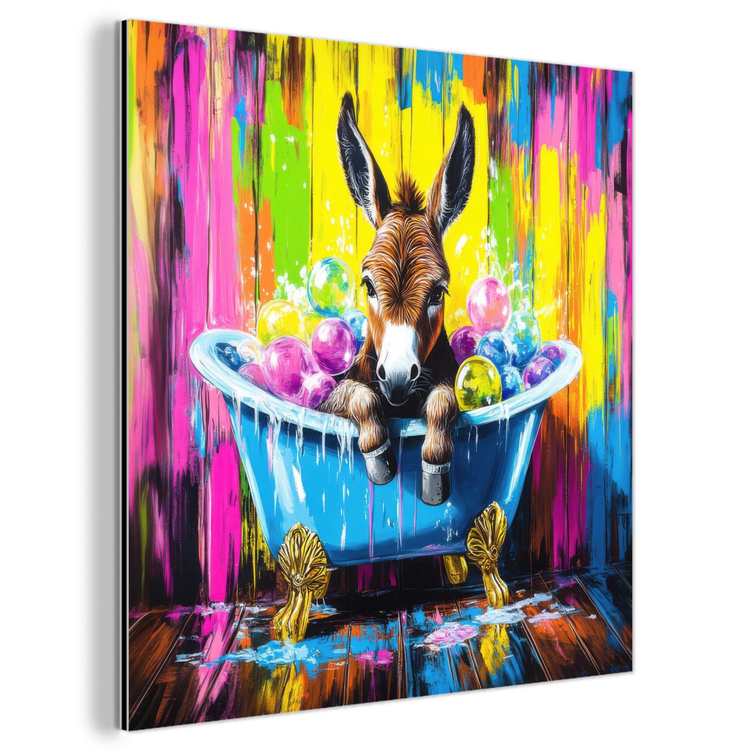Über das Bild: Ein fröhlicher Esel lehnt sich entspannt über den Rand einer klassischen blauen Badewanne, die mit bunten Bällen und Schaum gefüllt ist. Der Hintergrund besteht aus einer farbenfrohen Holzwand mit rosa, gelben, blauen und grünen Farbtupfern, die einen verspielten und lebendigen Effekt erzeugen.