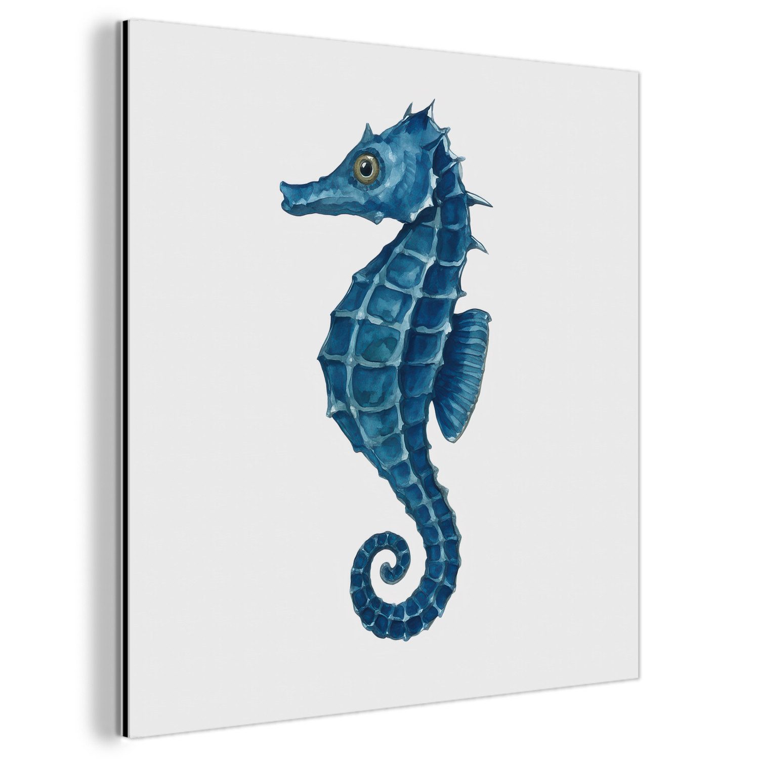 Über das Bild: Ein stilisiertes Seepferdchen in Blautönen mit feinen Segmenten und einem gelockten Schwanz, dargestellt vor einem neutralen weißen Hintergrund.