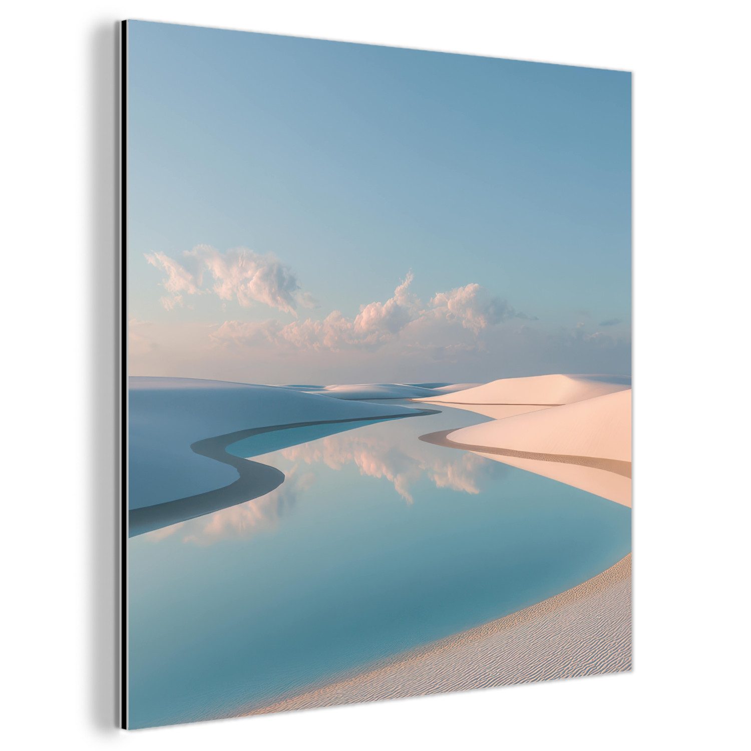 Über das Bild: Ein gewundener Teich windet sich zwischen weißen Sanddünen unter einem blauen Himmel mit dünnen Wolken. Die Spiegelung des Himmels im Wasser schafft ein Gefühl der unendlichen Ruhe.