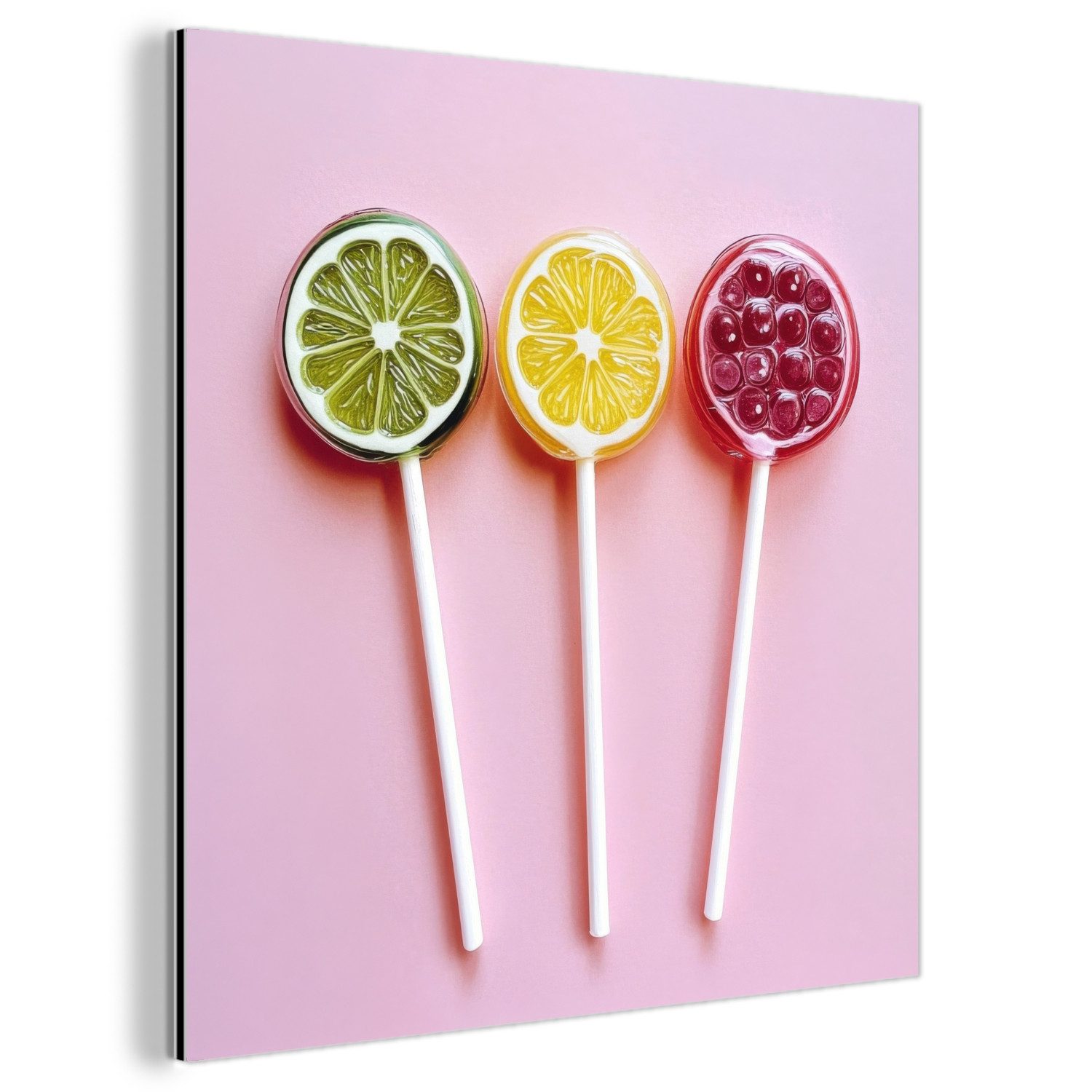 Über das Bild: Drei Lutscher mit Zitrus- und Beerenmotiven: eine grüne Limette, eine gelbe Zitrone und ein rosa Beerenmotiv. Die leuchtenden Farben bilden einen eleganten Kontrast zu dem zartrosa Hintergrund. Der Glanz unterstreicht ihre verführerische Süße.