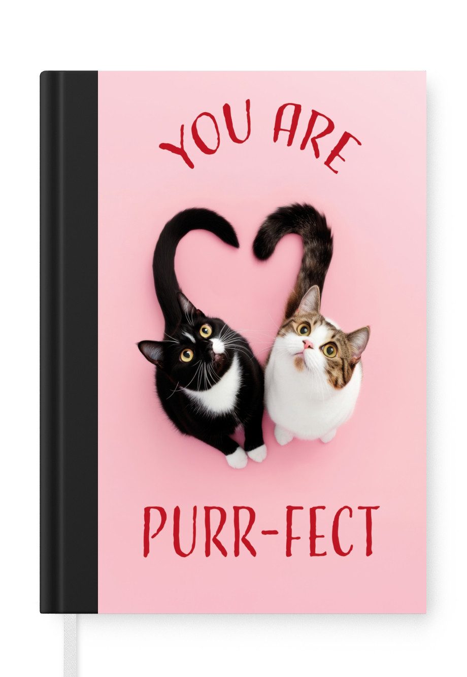Zwei niedliche Katzen, eine schwarz-weiße und eine Patchwork-Katze, sitzen Seite an Seite auf einem rosa Hintergrund. Ihre Schwänze bilden zusammen ein Herz. Über ihnen steht der Text "YOU ARE" und darunter "PURR-FECT" in roten Buchstaben. Ein verspieltes und liebevolles Bild mit einem Hauch von Humor.Anzahl Seiten | 99 Seiten |