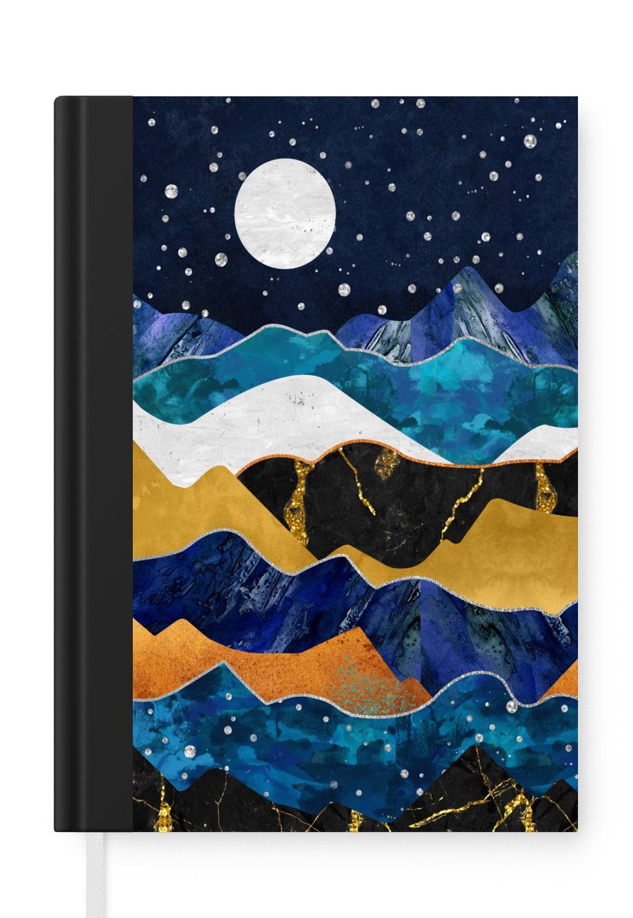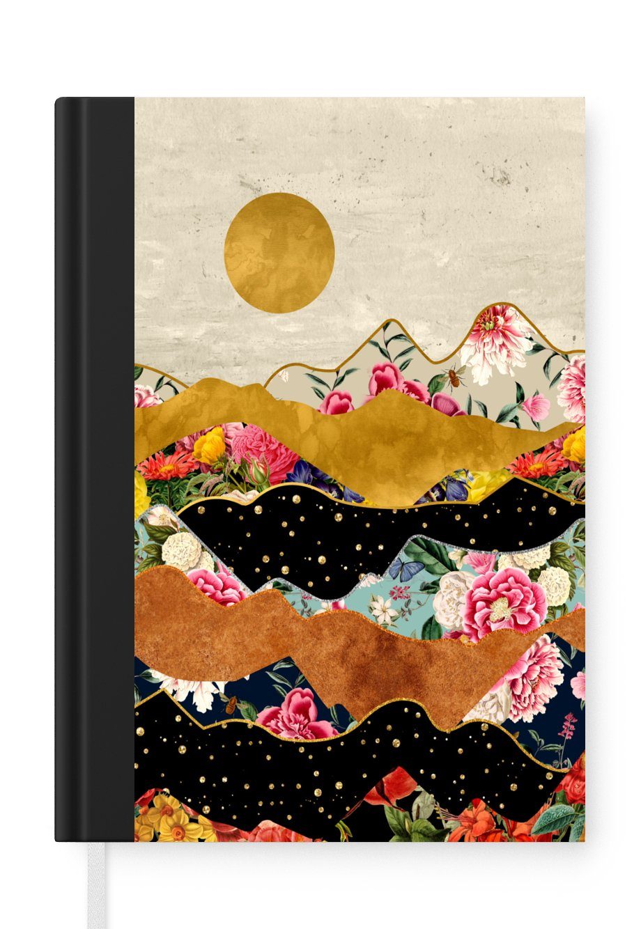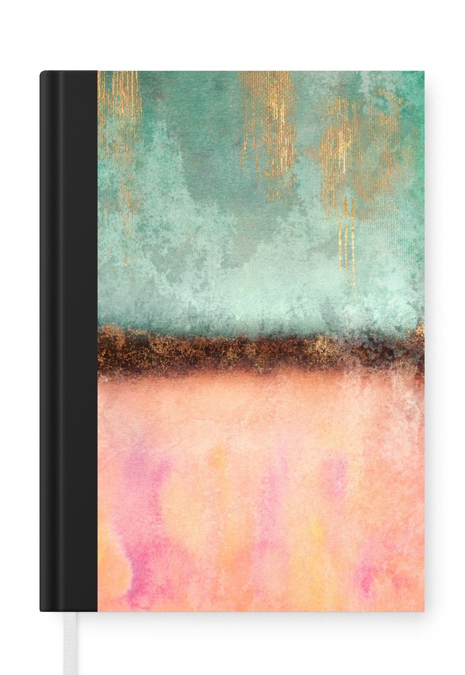 Das Notizbuch hat ein Hardcover und ist mit einer schwarzen Bindung versehen. Diese Bindung in Wildlederoptik verleiht ihm einen luxuriösen Look. Durch die schwarze Bindung hat das Notizbuch eine teilweise schwarze Rückseite. Dank seiner kompakten Размер lässt sich das Hardcover-Notizbuch leicht mitnehmen.