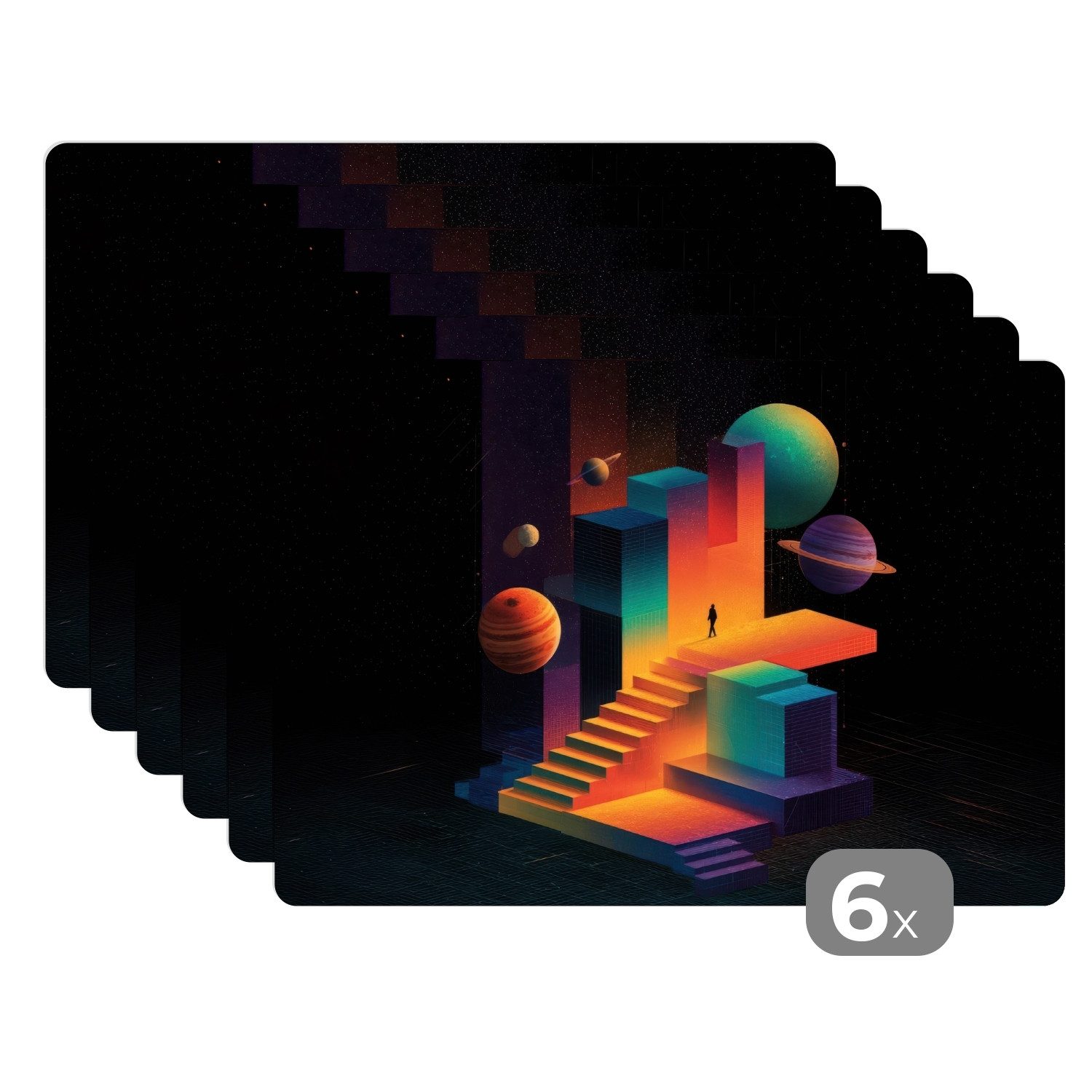 Eine Person steht am oberen Ende einer abstrakten Treppe zwischen bunten Blöcken und Planeten. Die Szene strahlt Geheimnis und surreale Weltraumfantasie aus.