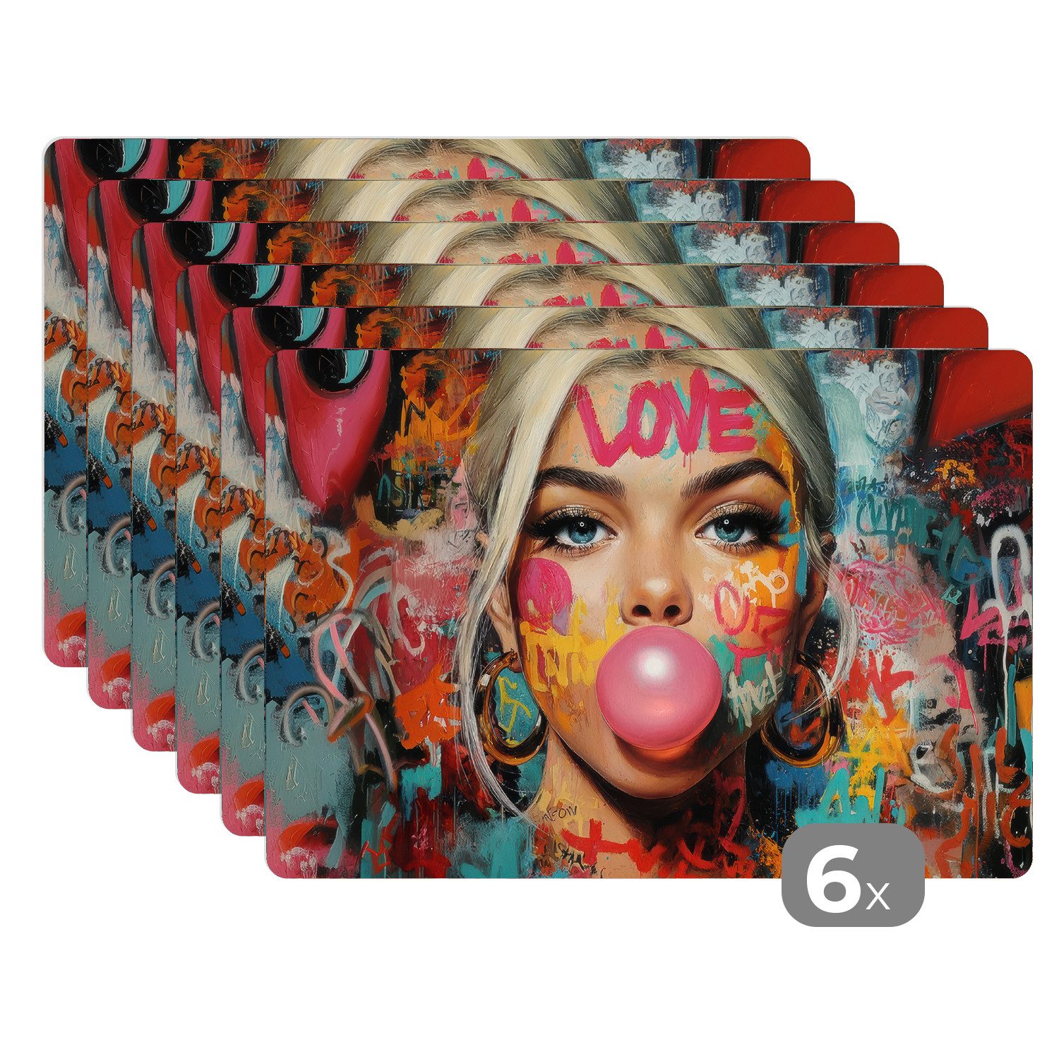 Eine junge Frau pustet eine rosafarbene Kaugummiblase, umgeben von einem Wirrwarr aus Graffiti in Orange, Blau, Rot und Rosa. Das Wort "LOVE" prangt auf ihrer Stirn und unterstreicht den romantischen und zugleich schroffen Charakter.