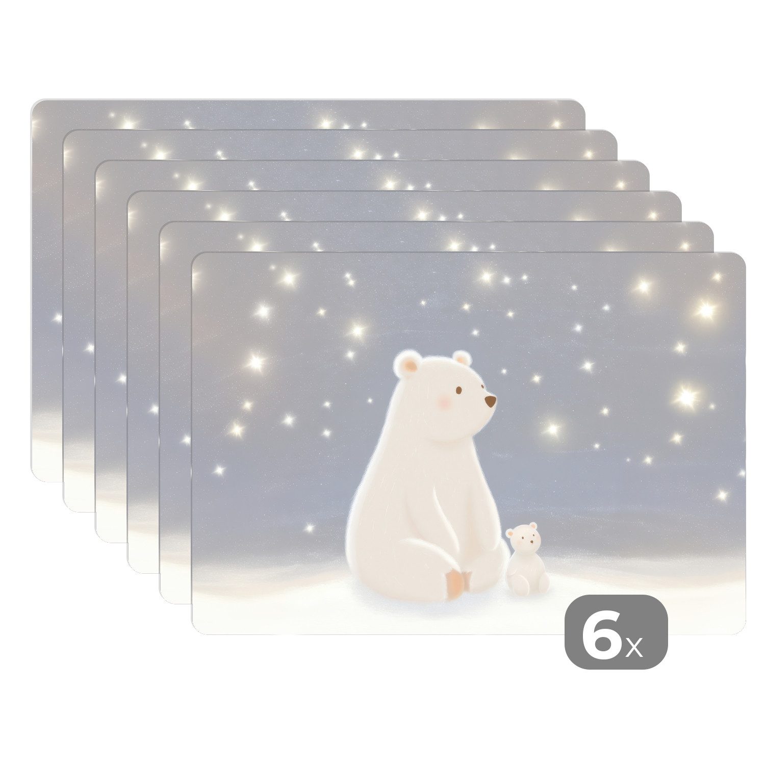Ein großer und ein kleiner Eisbär sitzen zusammen im Schnee, umgeben von glitzernden Sternen. Die sanften Farben schaffen eine verträumte und warme Atmosphäre.
